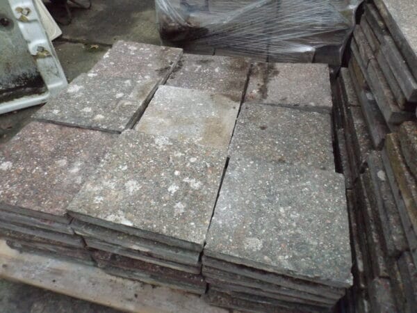 A batch of 12″ reclaimed concrete slabs with a nice worn gritty face in a mix of faded colours – buff, pink and green. Gives a lovely muted colour when laid.