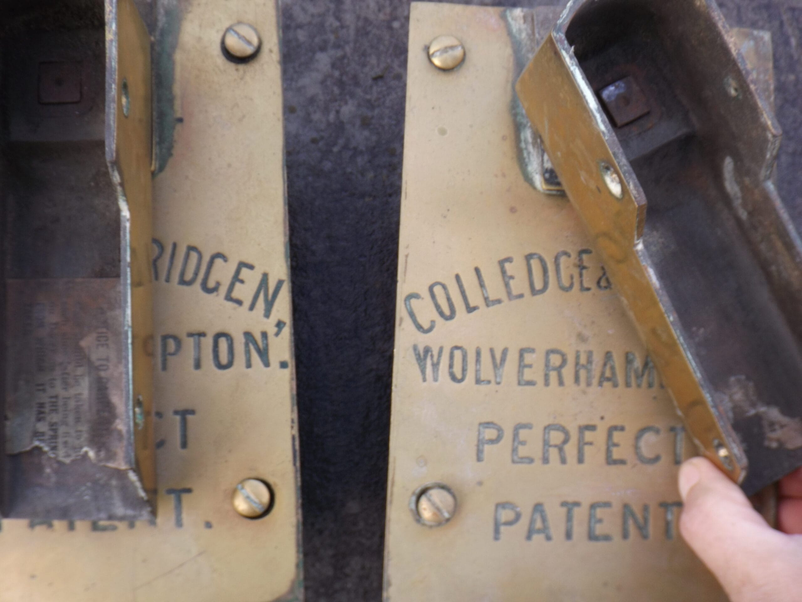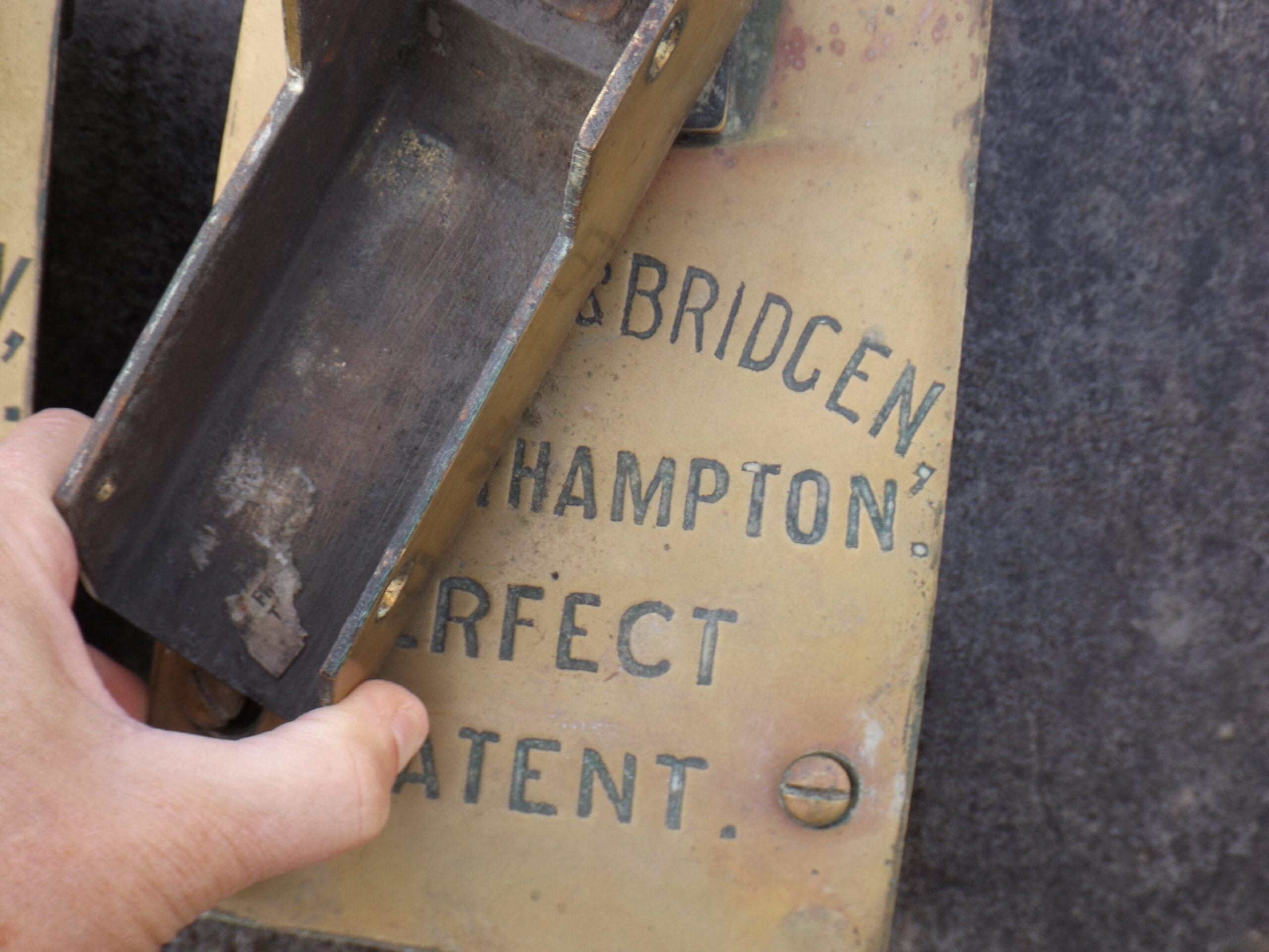 A pair of antique brass floor spring door closers for swing doors, salvaged from a late Victorian church in Eastbourne. Made by Colledge & Bridgen of Wolverhampton. Wonderful patina, one moves nice and freely while the other moves but is a little stiff.