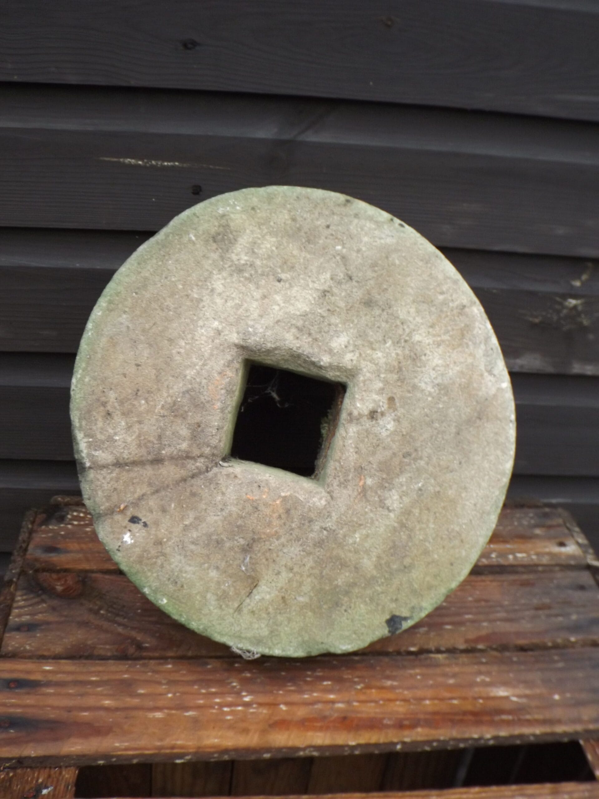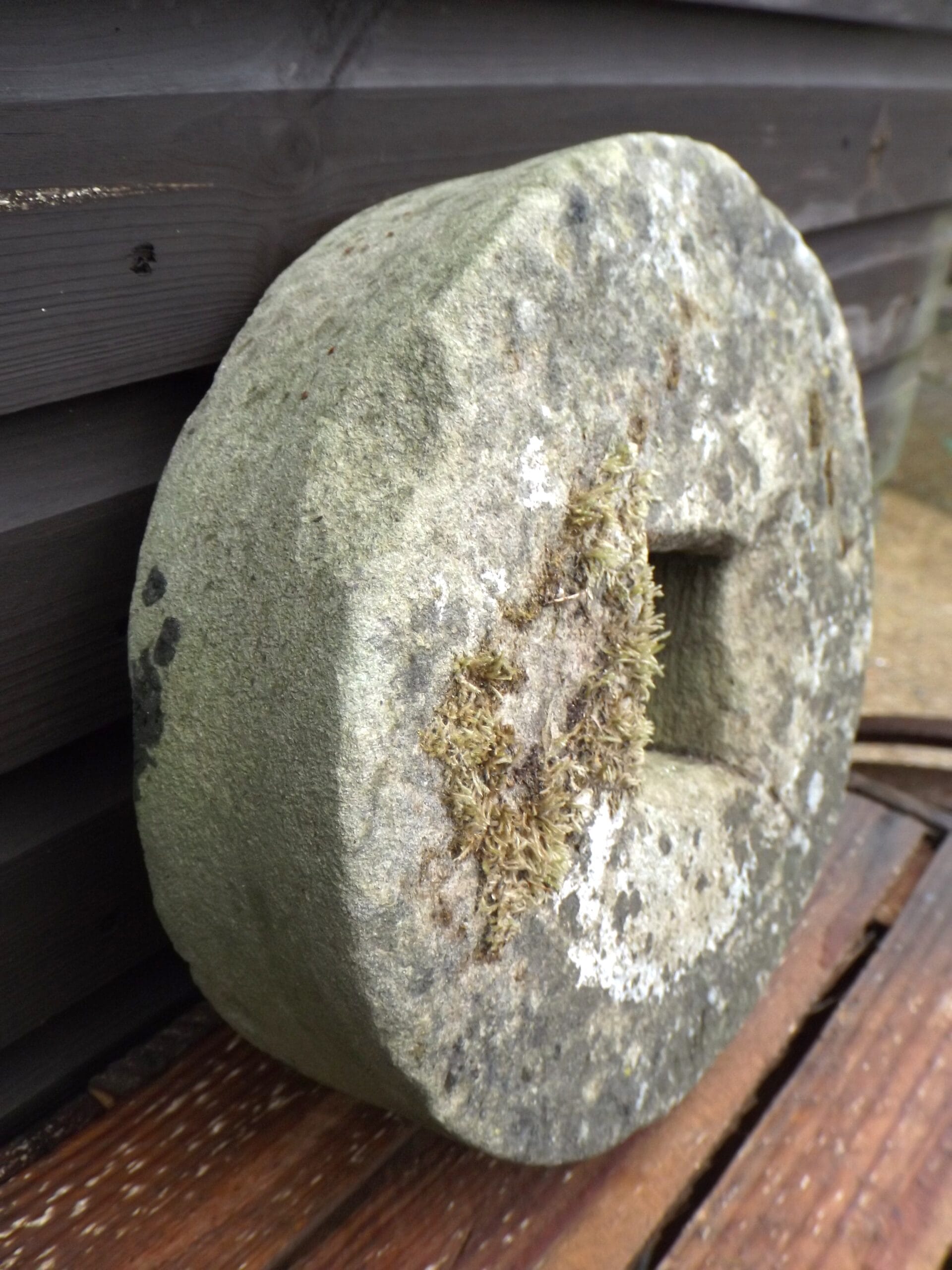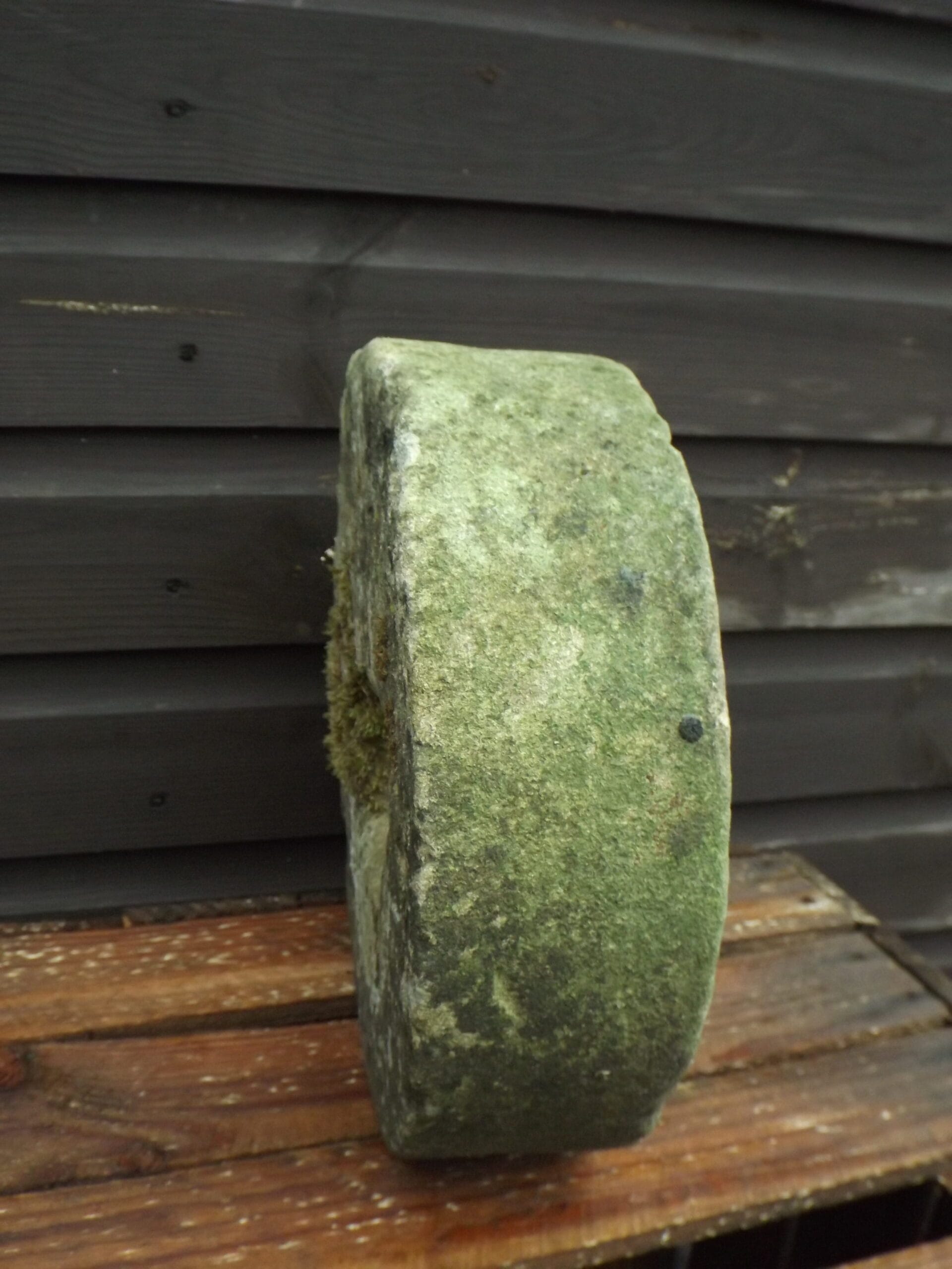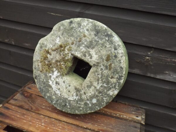 A beautifully worn antique stone grinding wheel. Well weathered on one side with moss and lichens. This would originally have been set into a frame and turned, either by hand or foot, to sharpen knives, axes and tools.