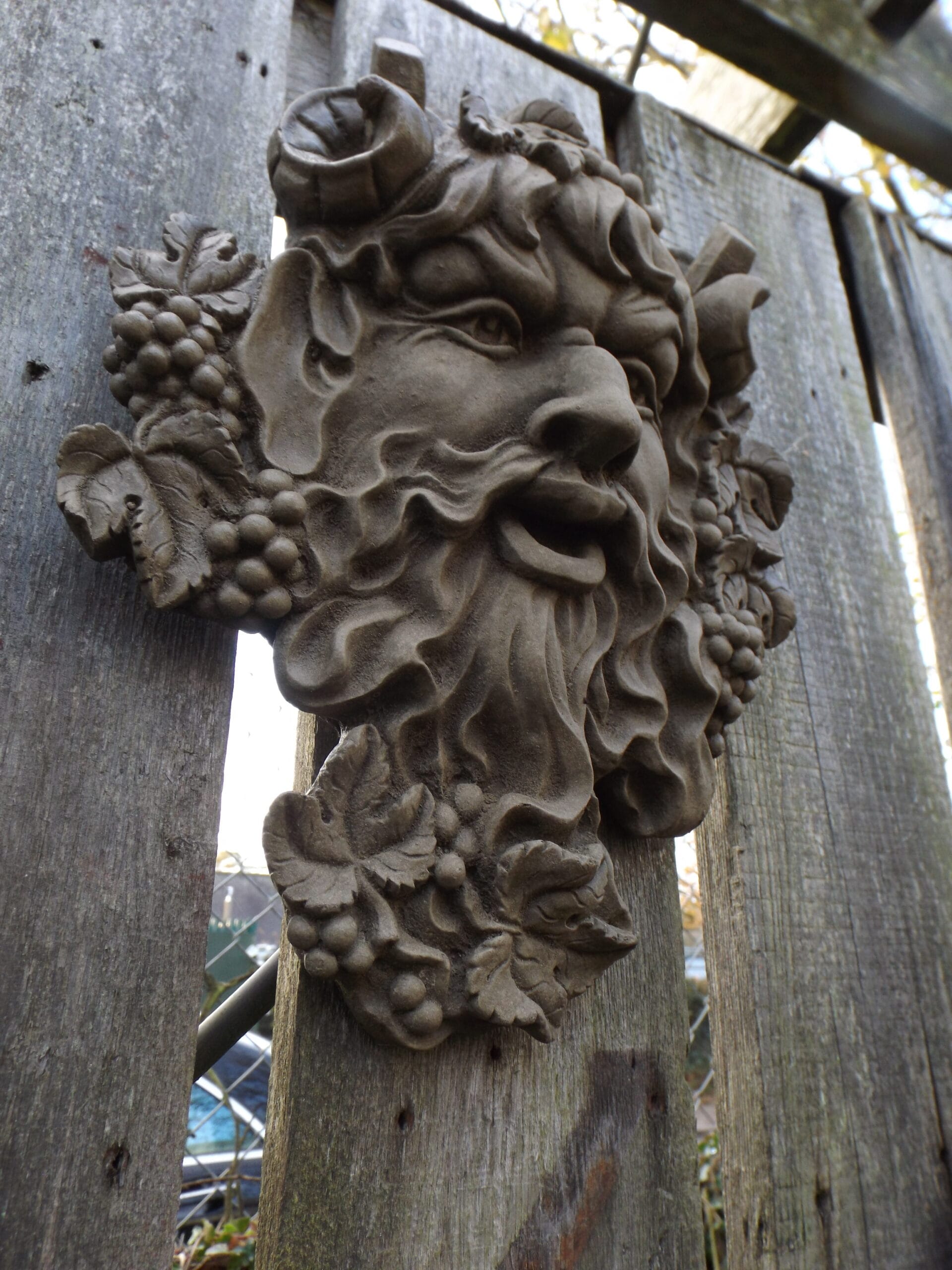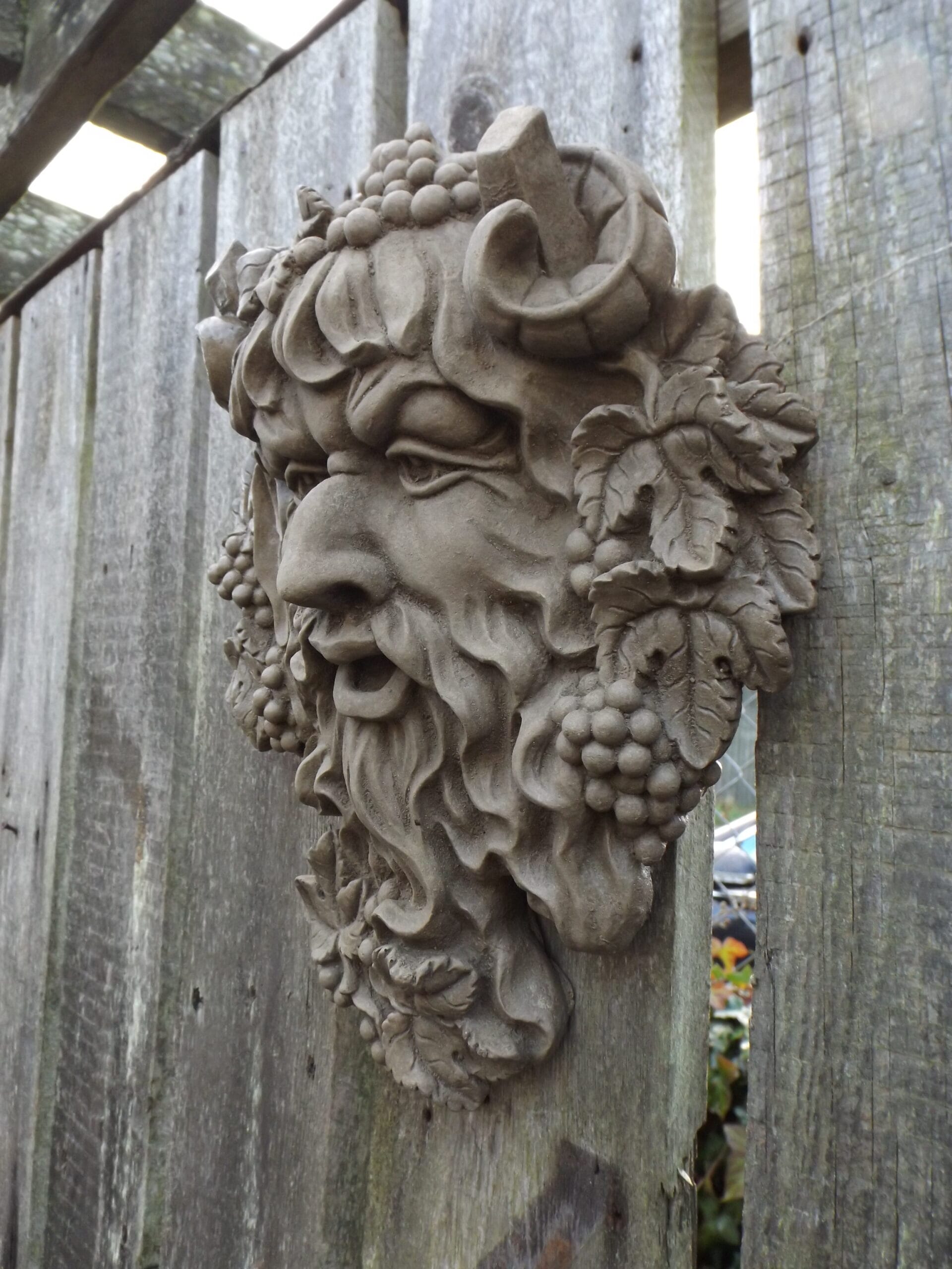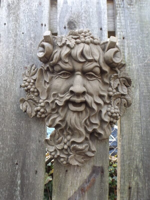 The Bacchus wall plaque – a decorative garden plaque depicting the God of Wine with horns and surrounded by grapes and vine leaves.