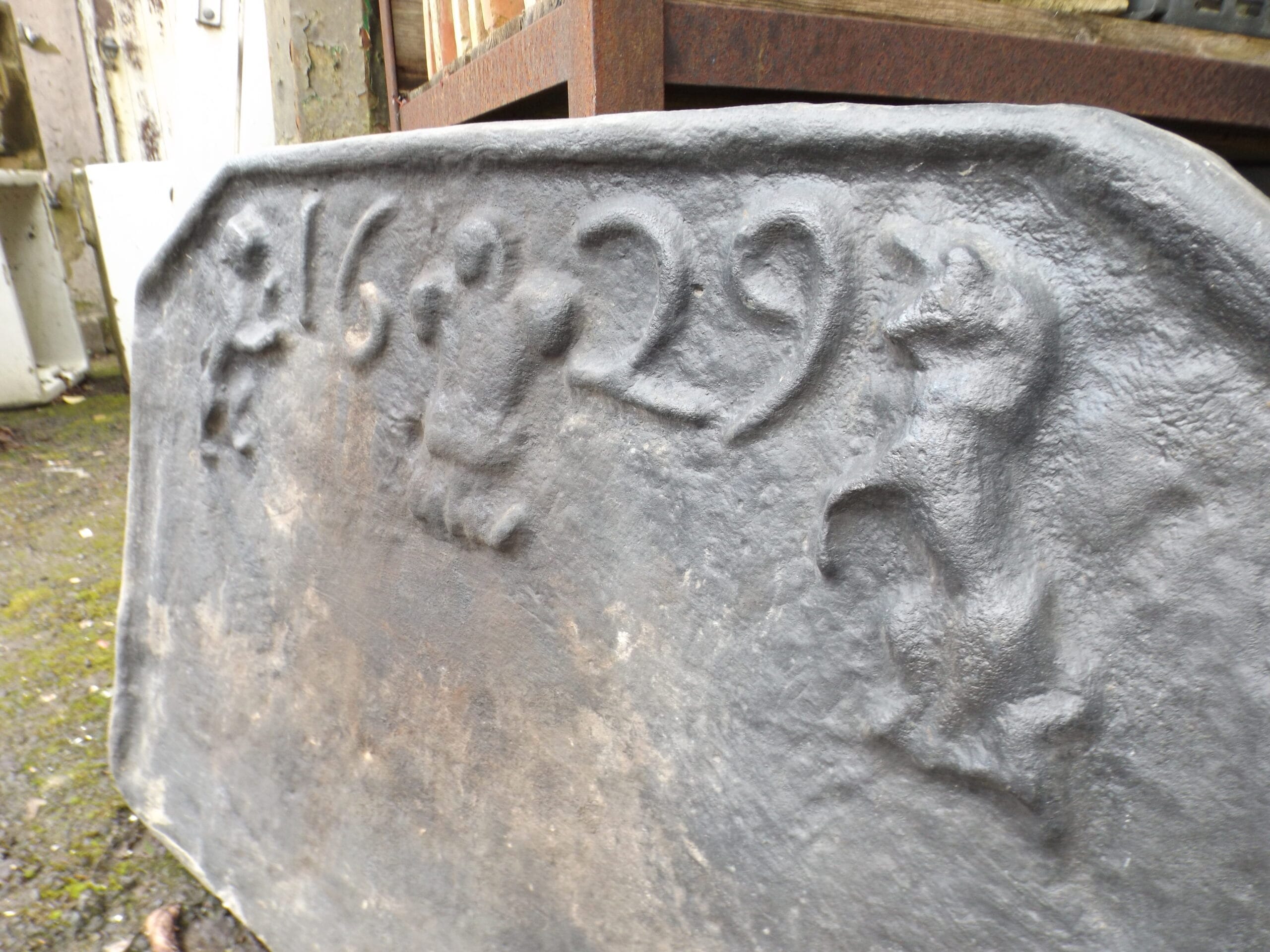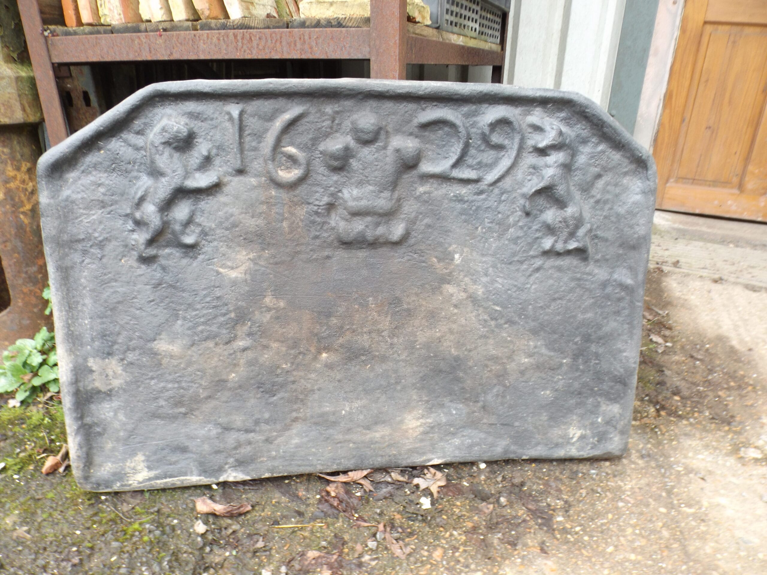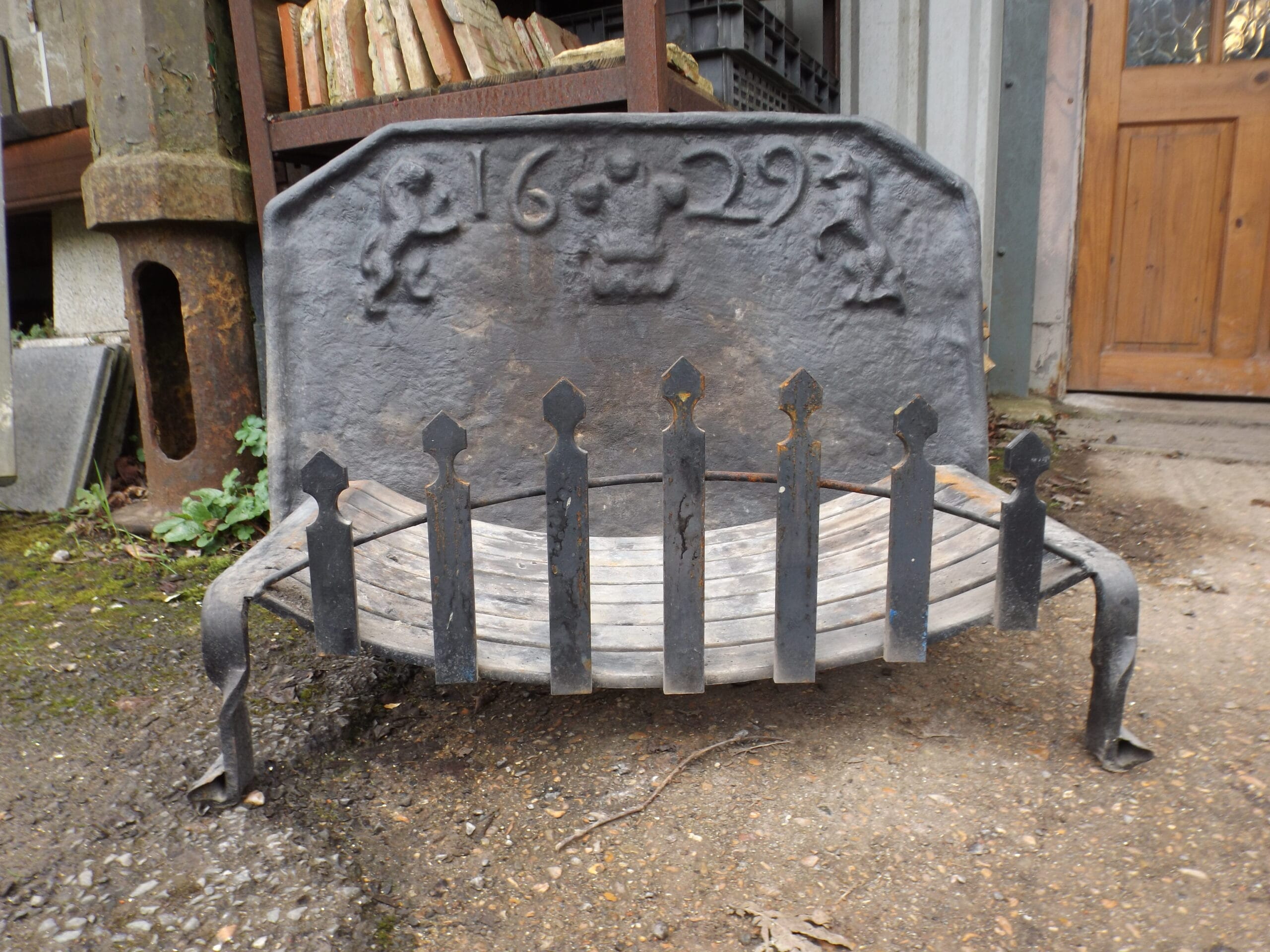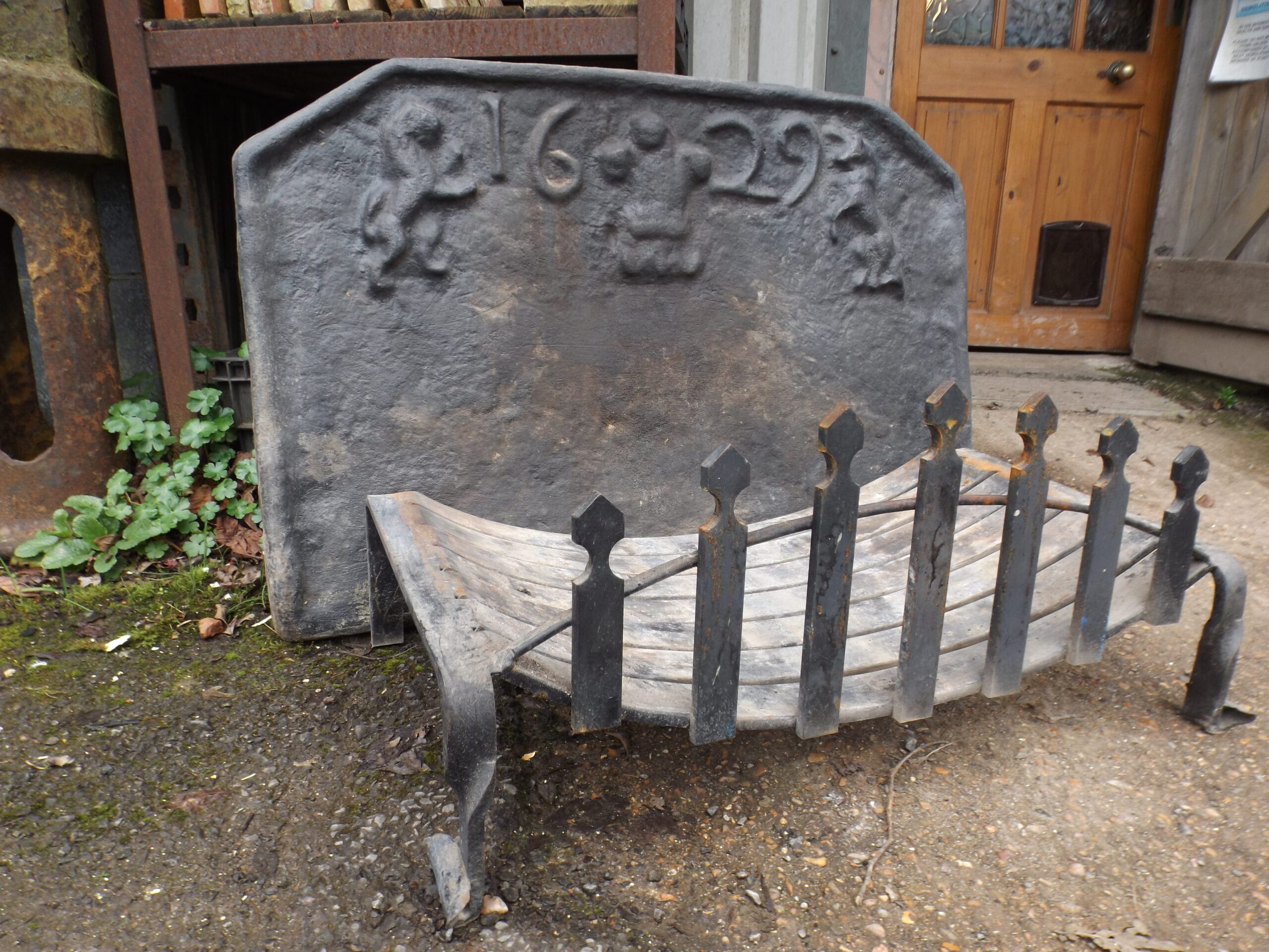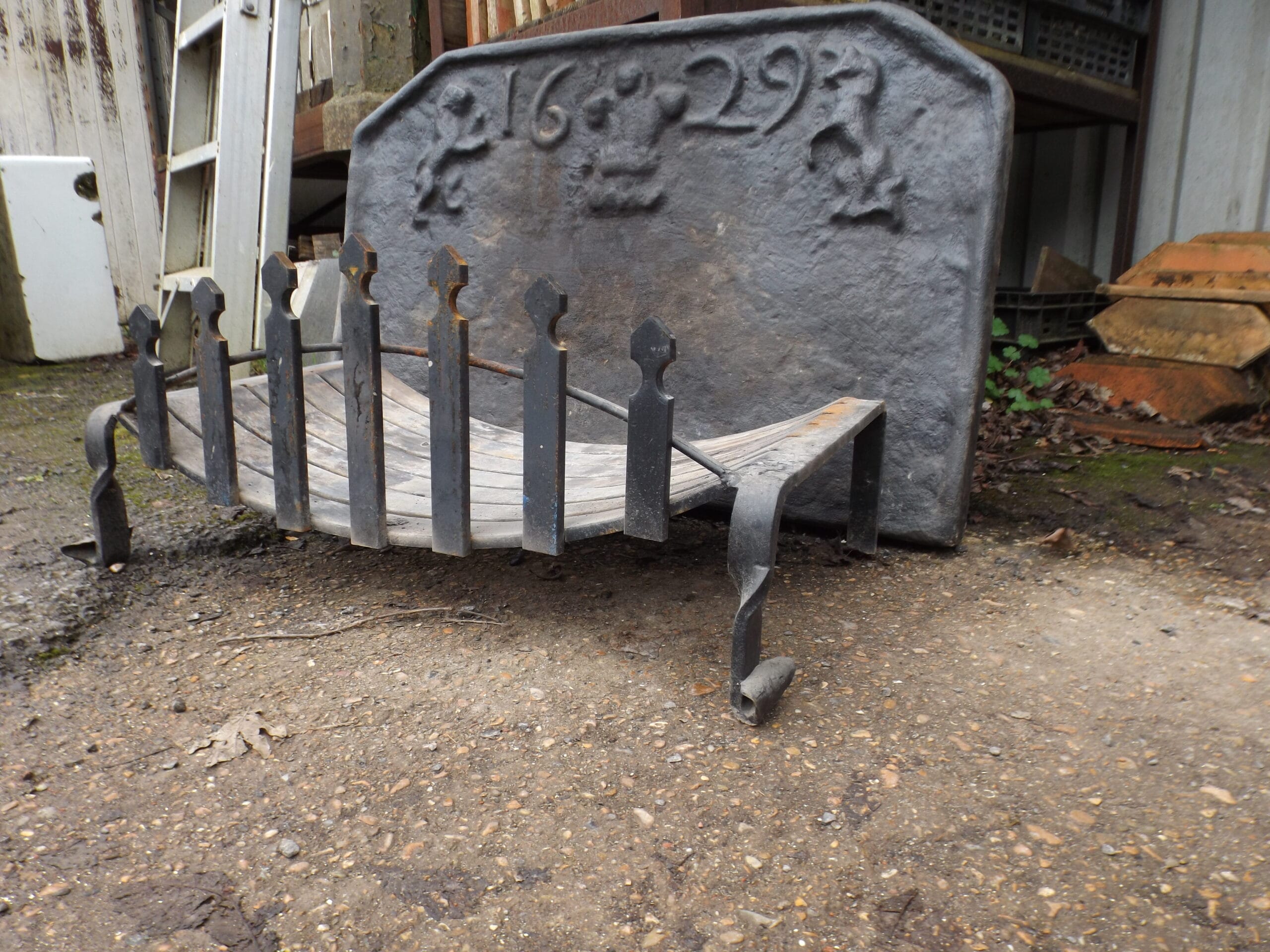 A reclaimed reproduction dated fireback with swans nest fire basket.  Both of these items were made by Mark Ripleys Forge in Robertsbridge with the fireback being cast from an original.  Both in excellent solid condition.