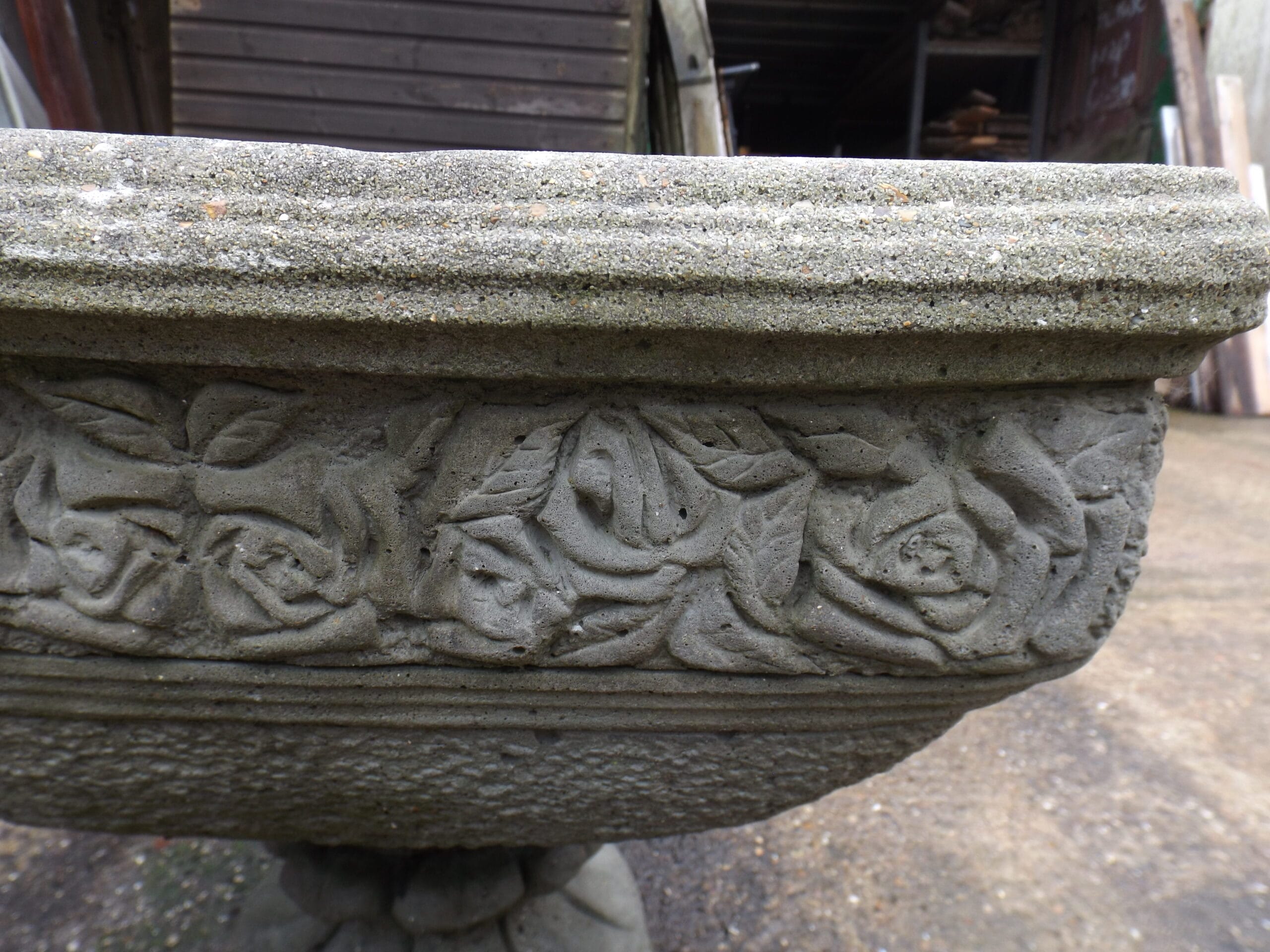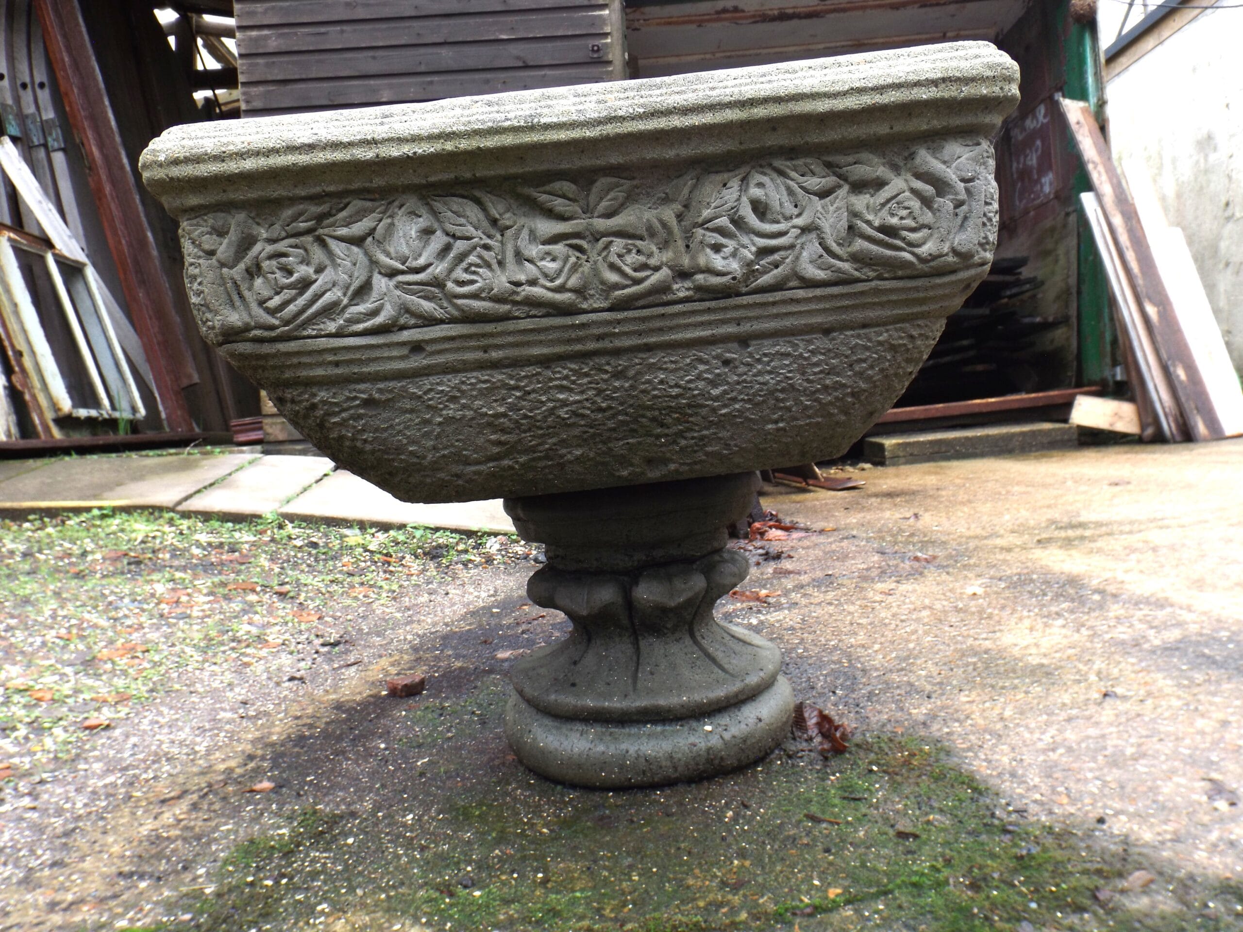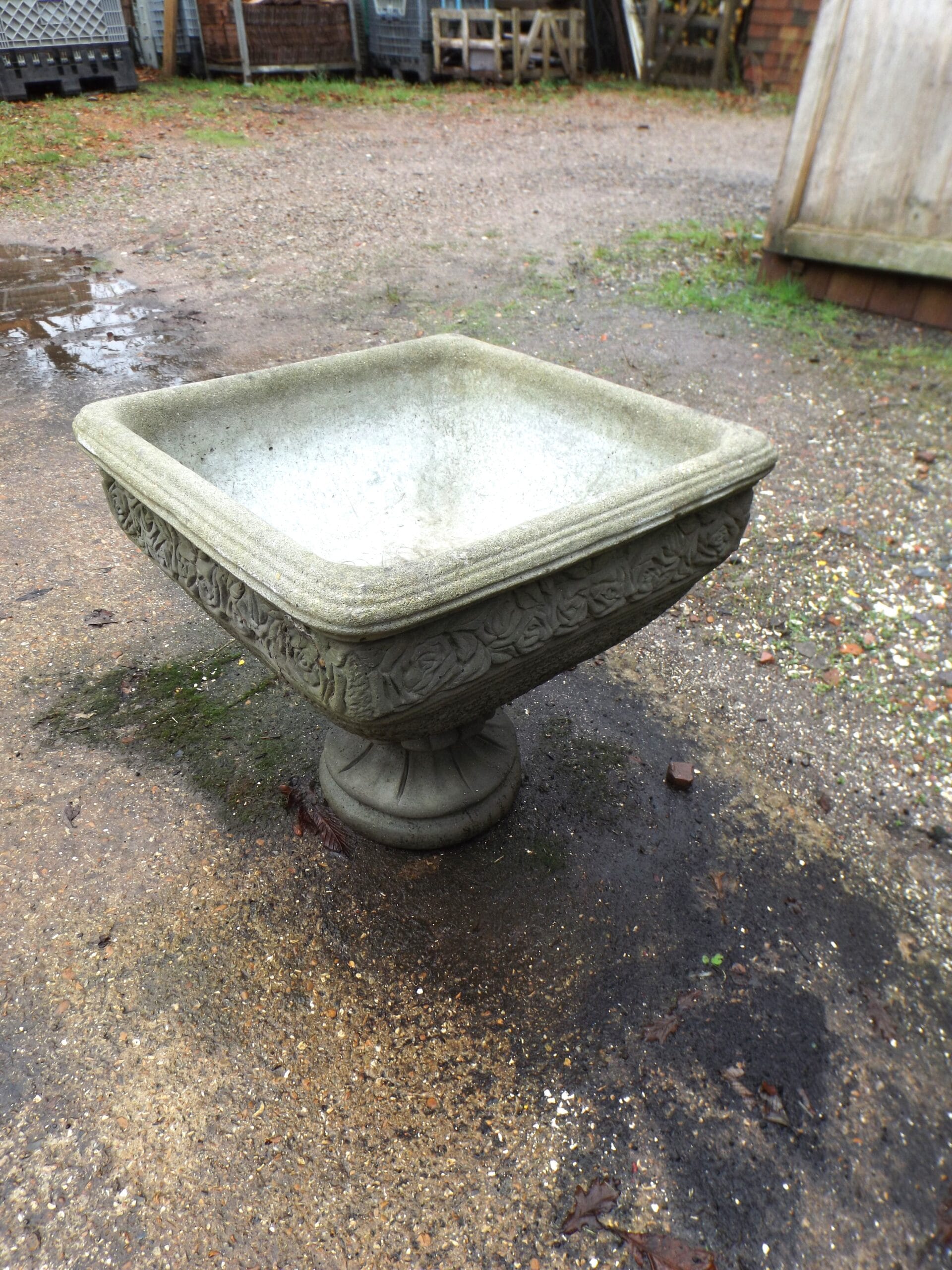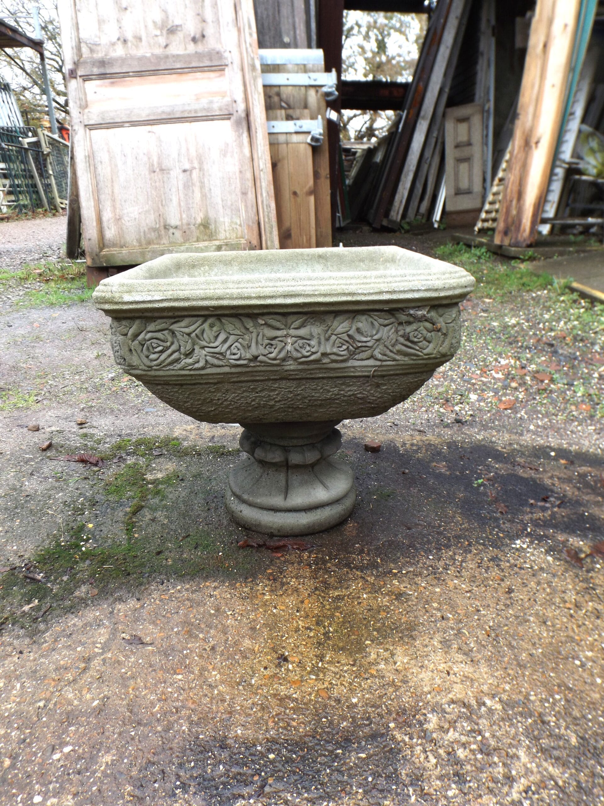 A lovely decorative square urn by Pan Art.  With a roses motif around the top and sitting on a round foot.  It is nicely detailed, lightly age worn and weathering nicely.