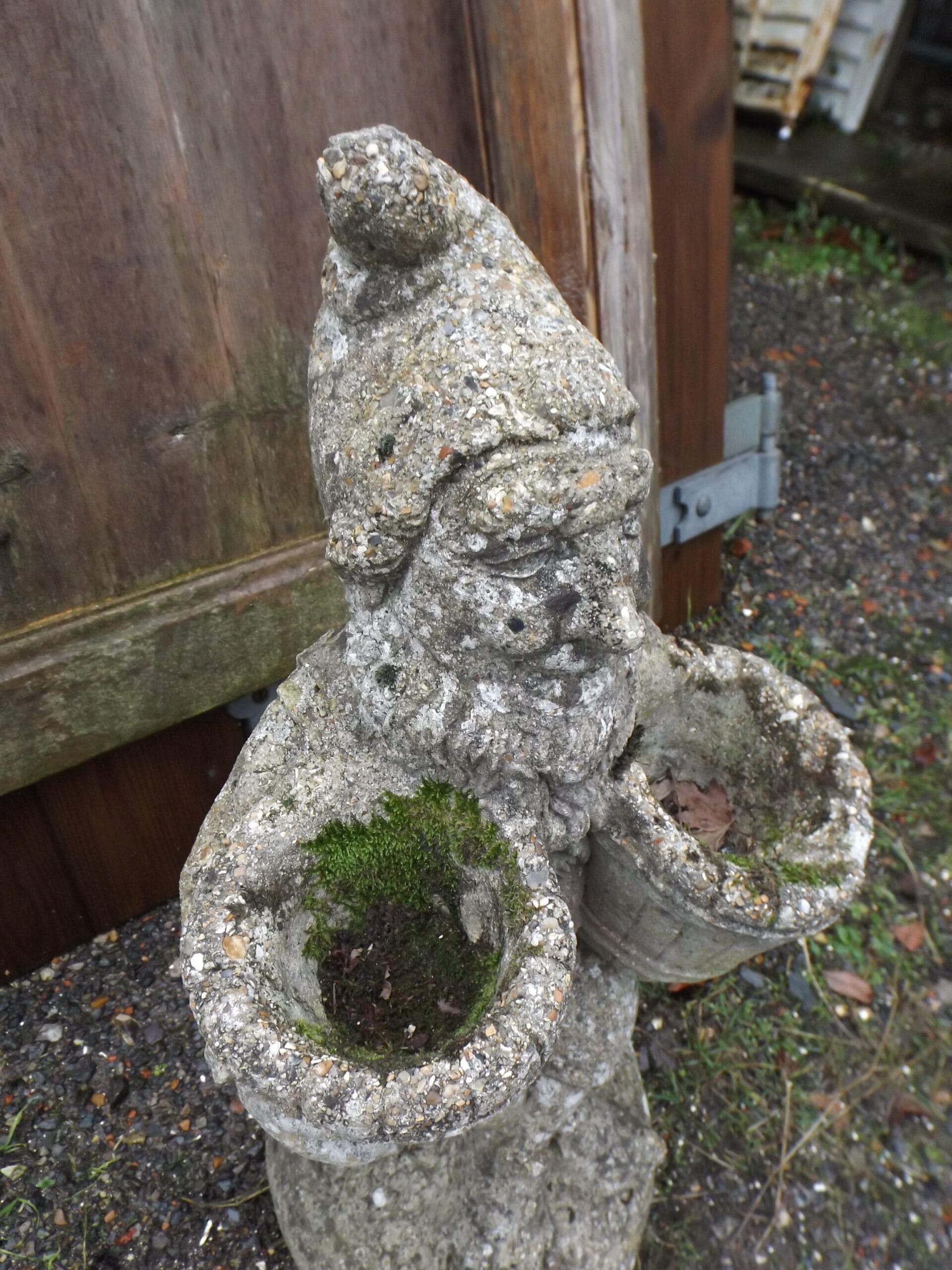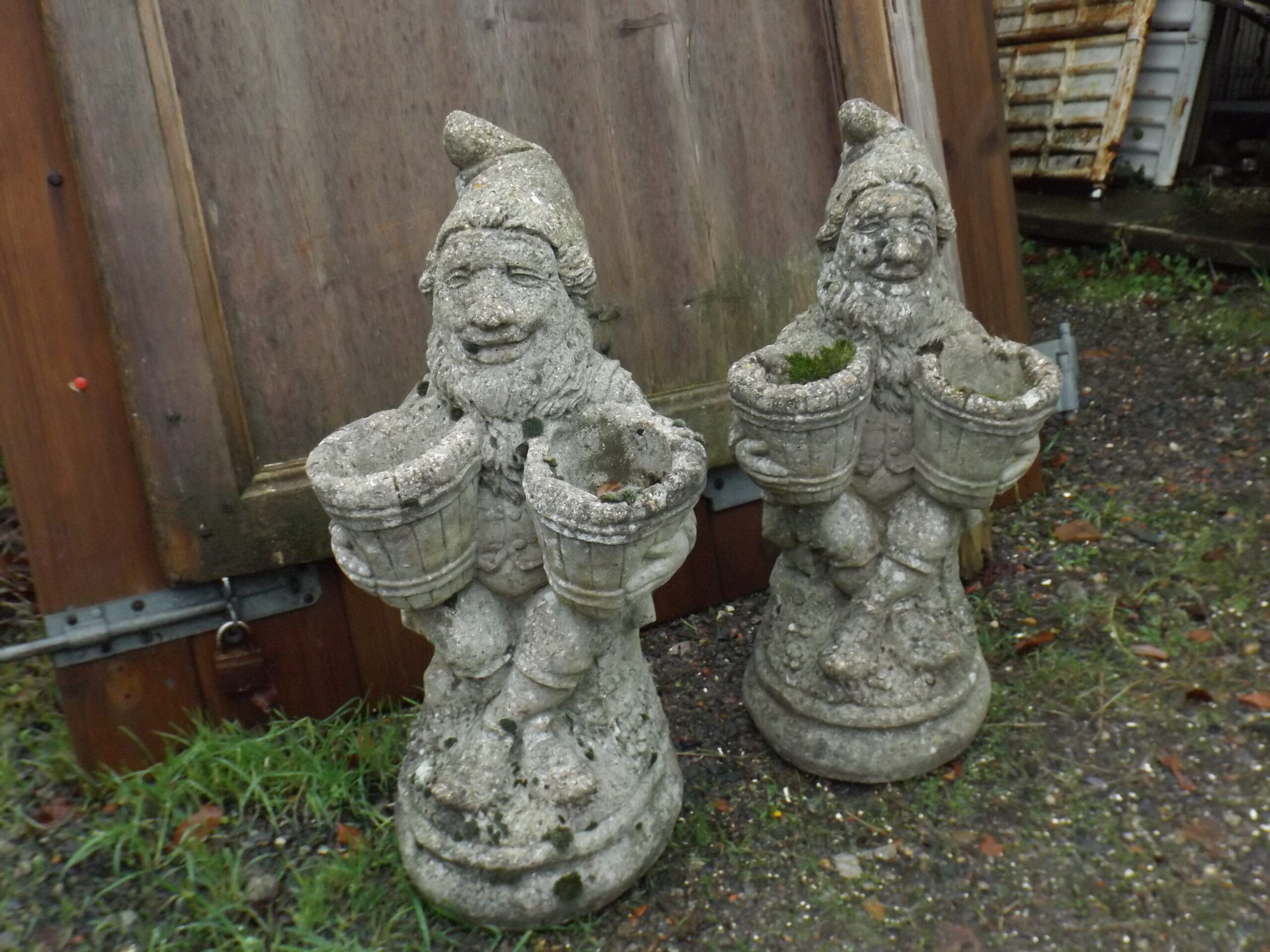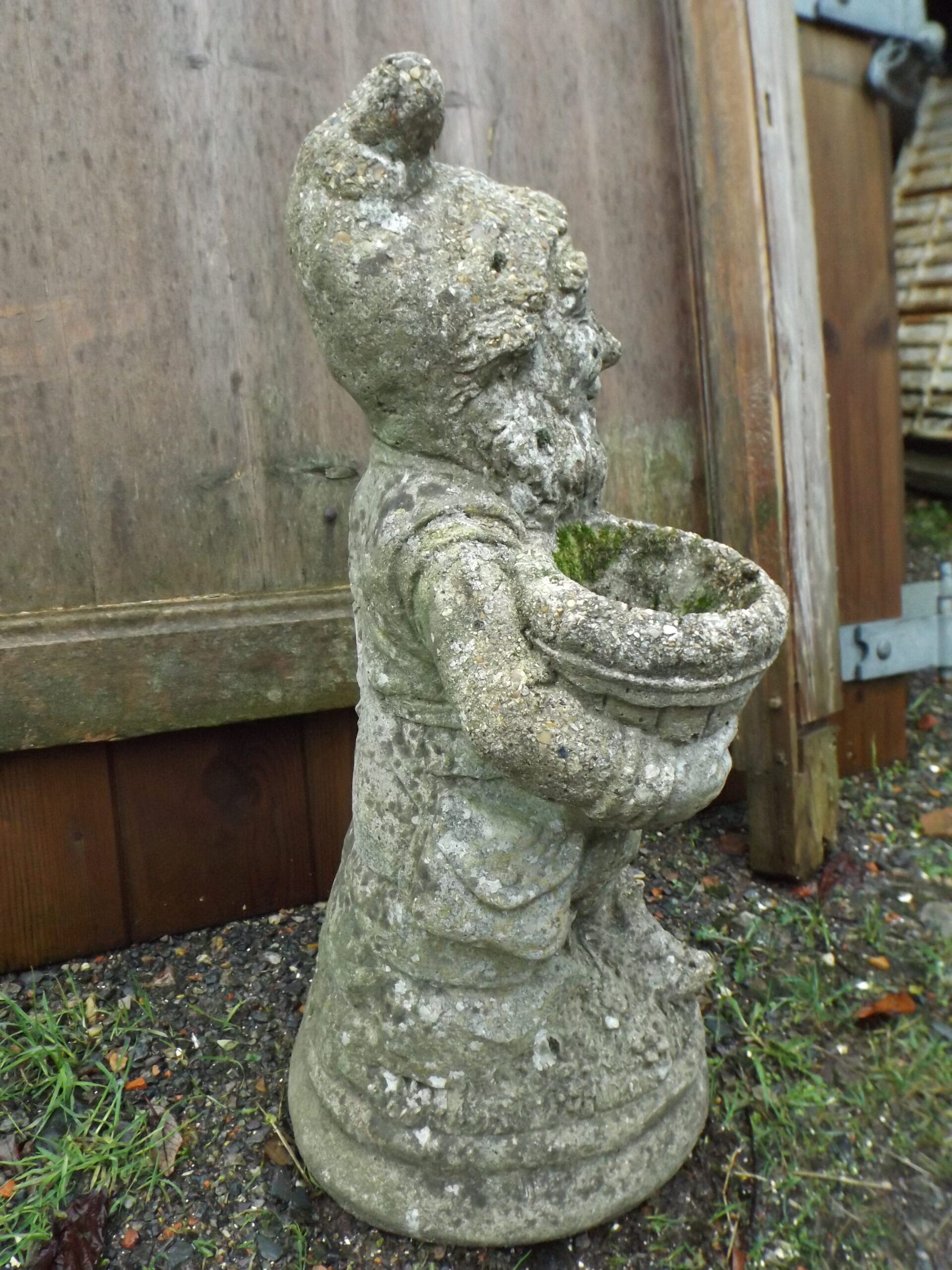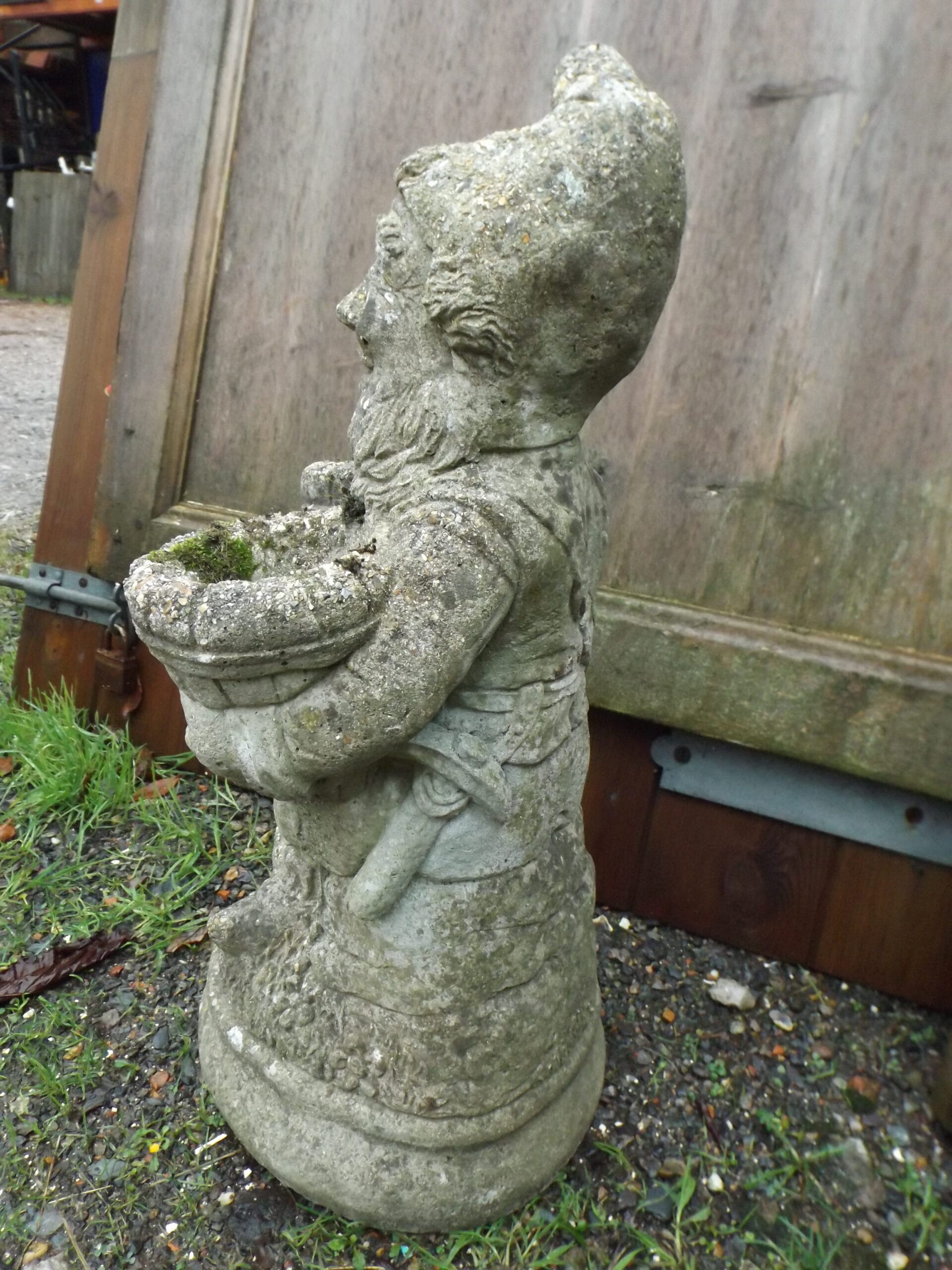 An impressively large antique gnome statue.  Holding two buckets, with a bag hanging on his right, an axe hanging on his left and sitting cross legged on a pile of stone.  Crafted in concrete and wonderfully time worn with mosses and lichens.