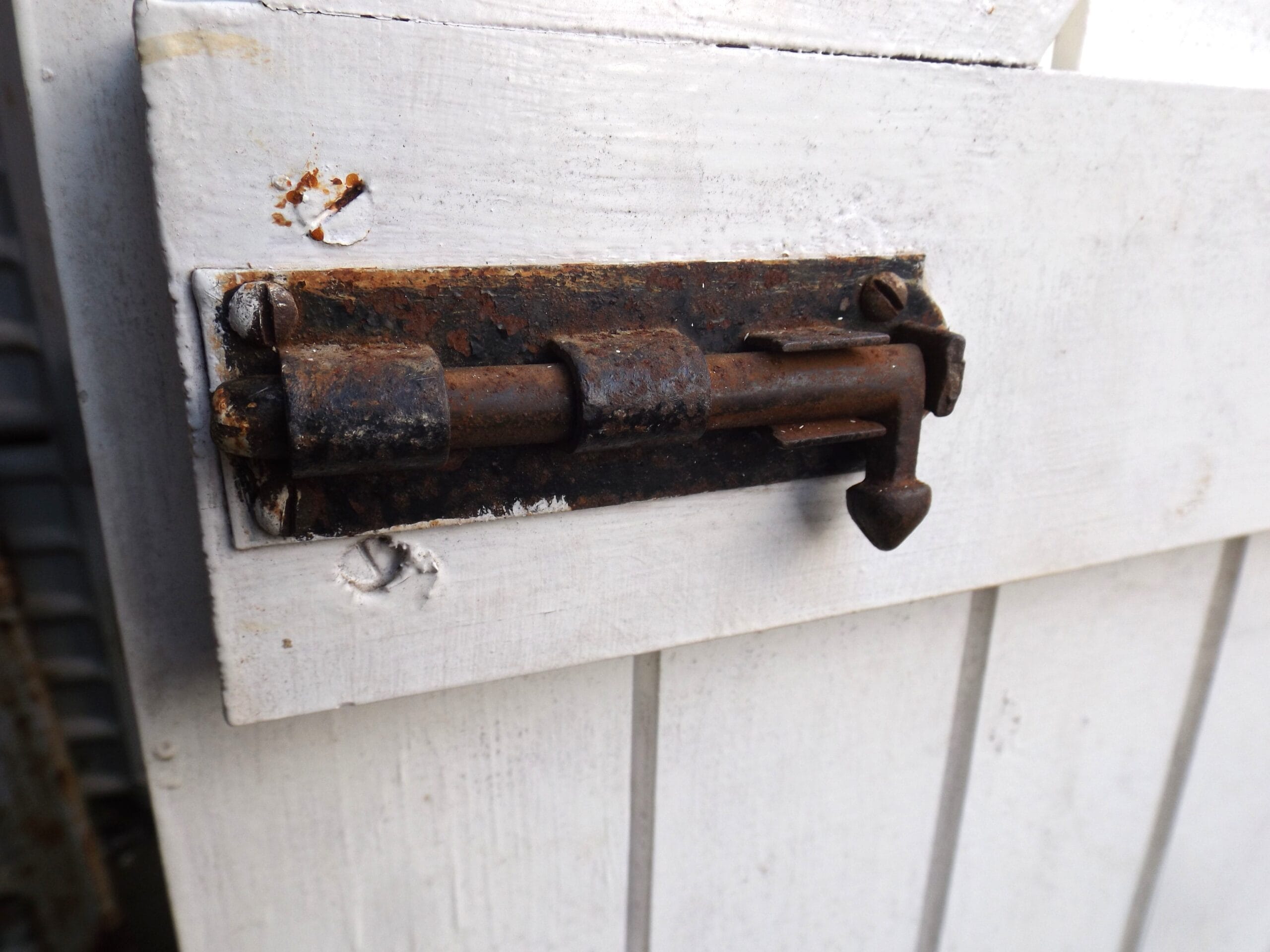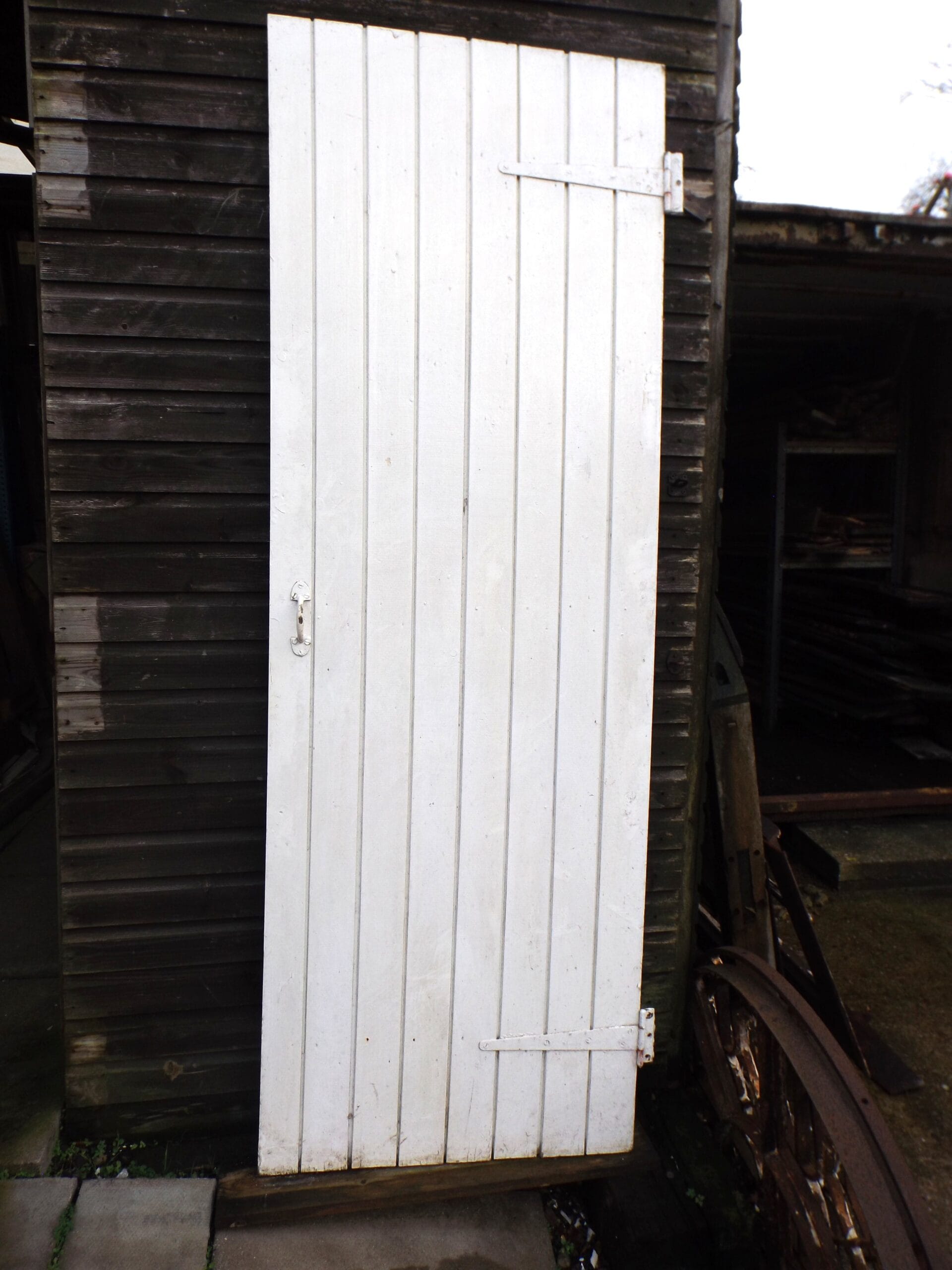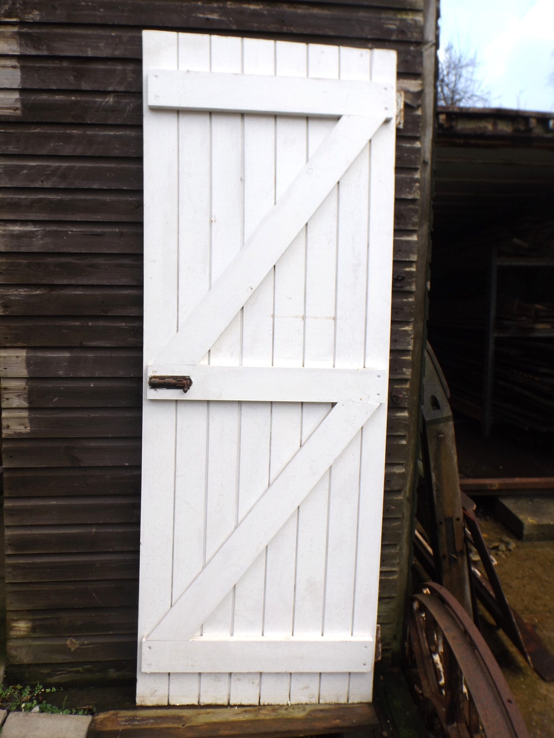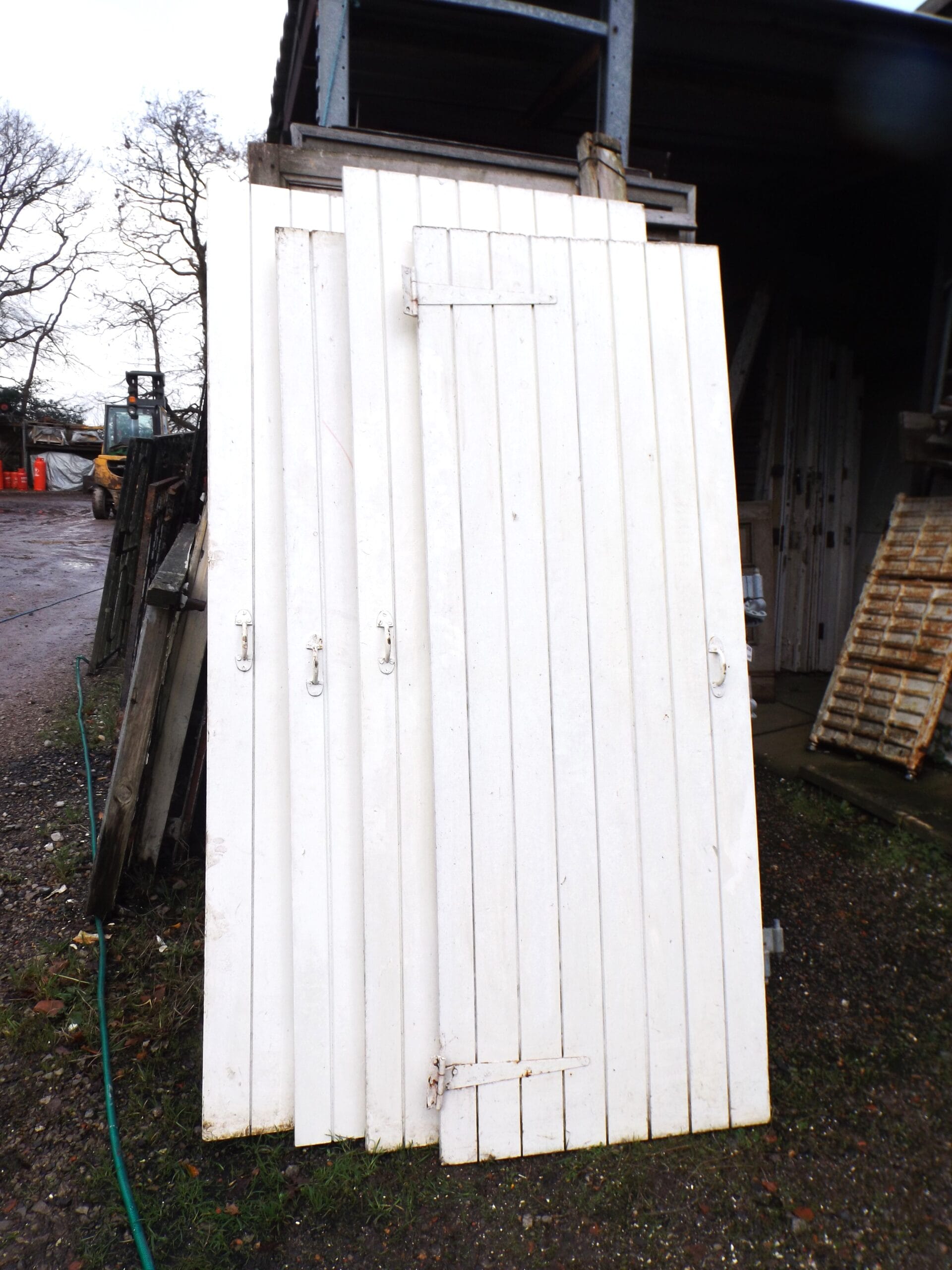 Four matching ledge and brace doors with rustic iron grab handles and iron bolts (no keep). Some hinges intact but not all.