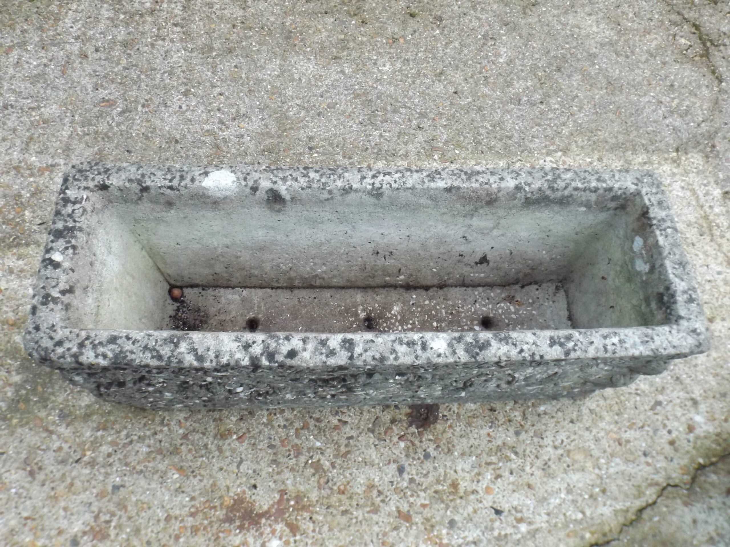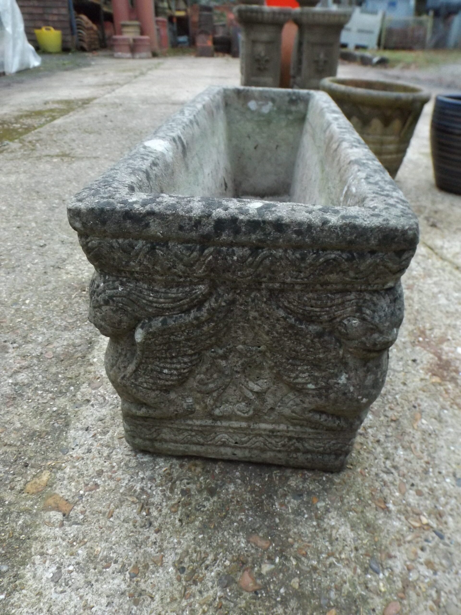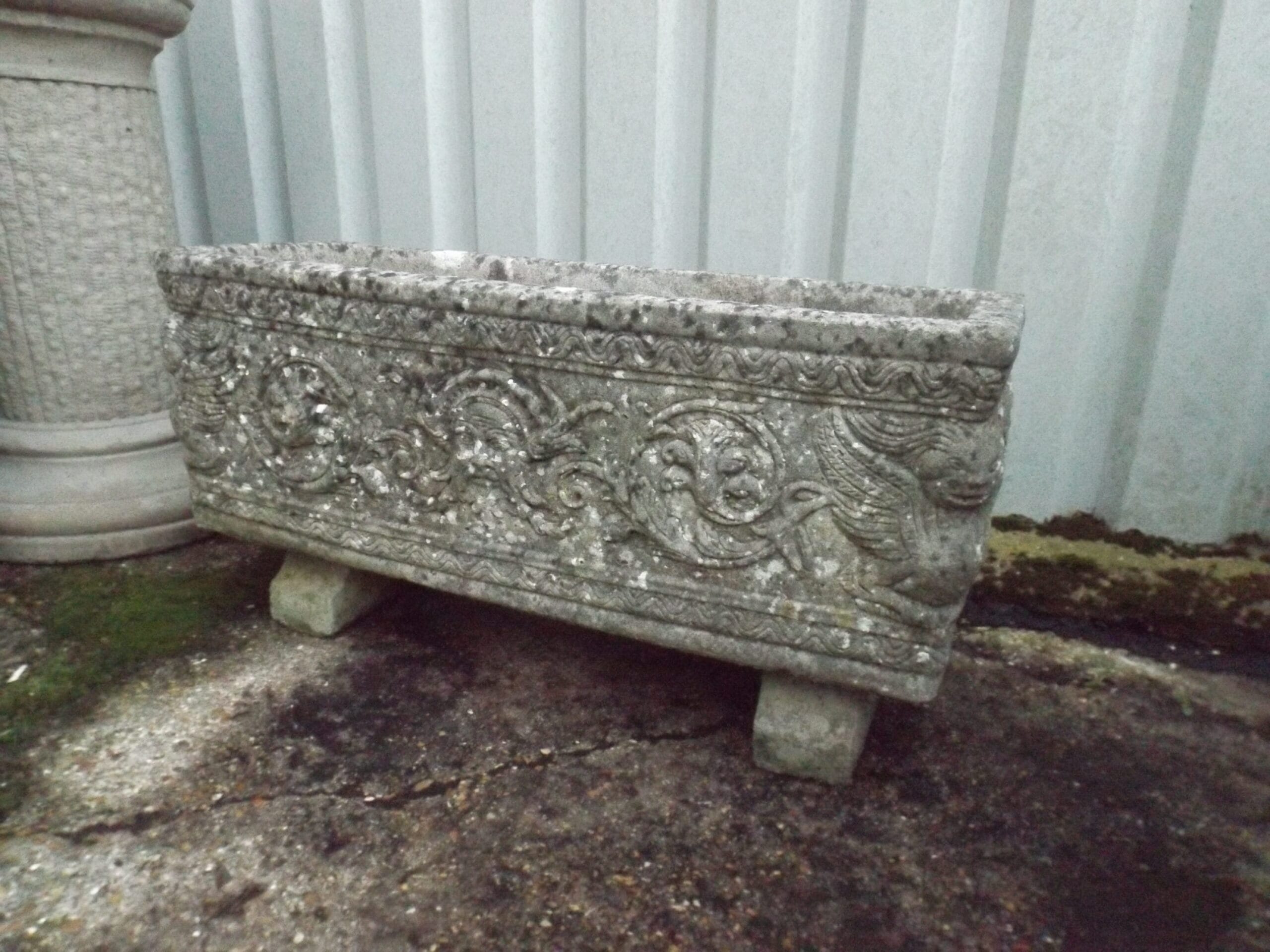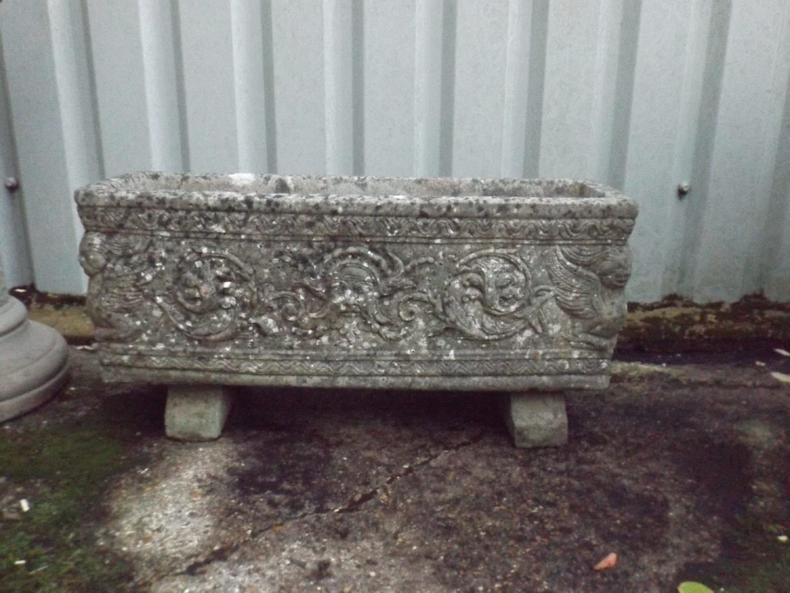 A Mayan inspired planter on feet with stylised figures and faces, incorporating subtle designs. Beautifully age worn and very well weathered (not so much on the back).