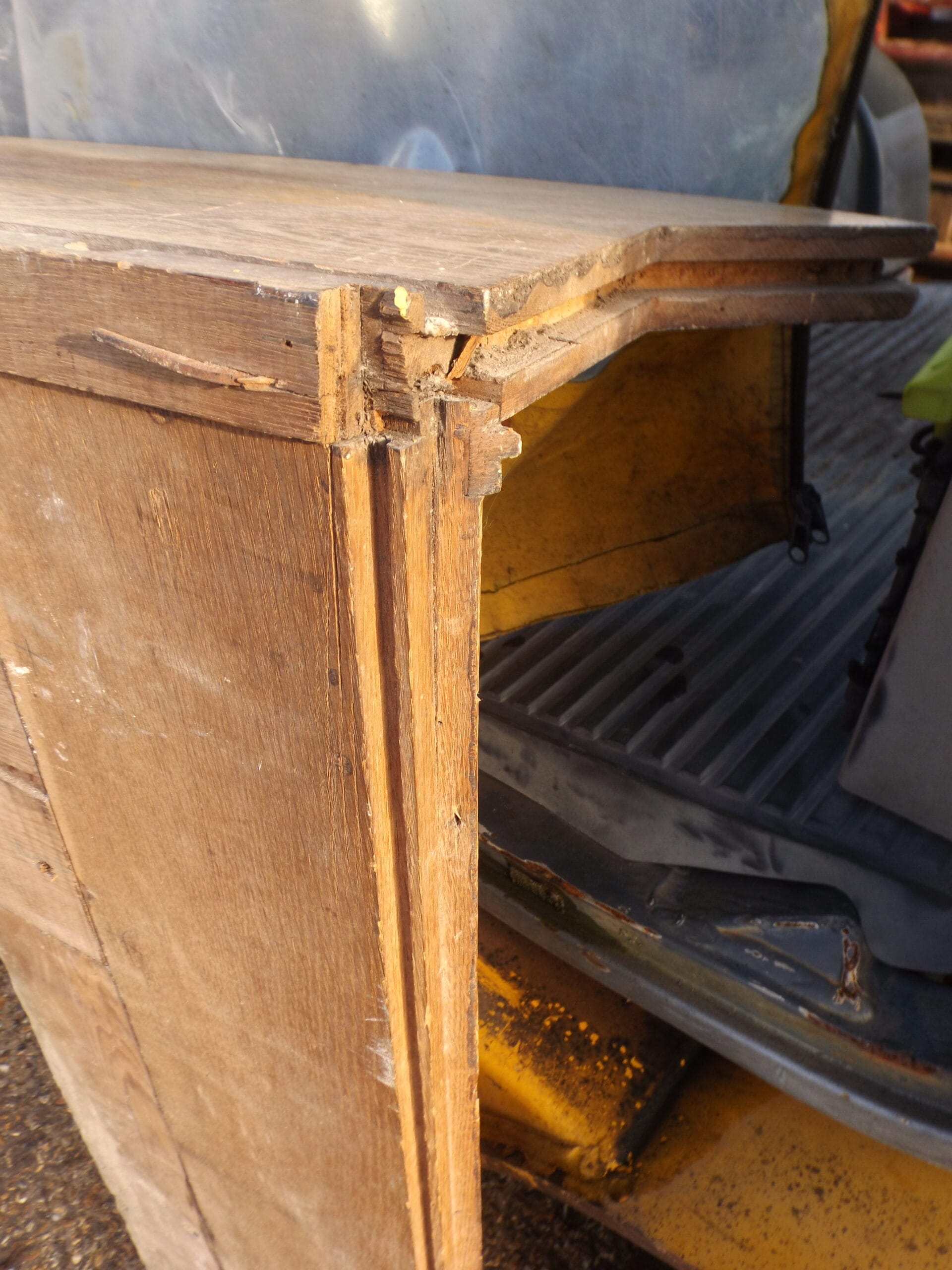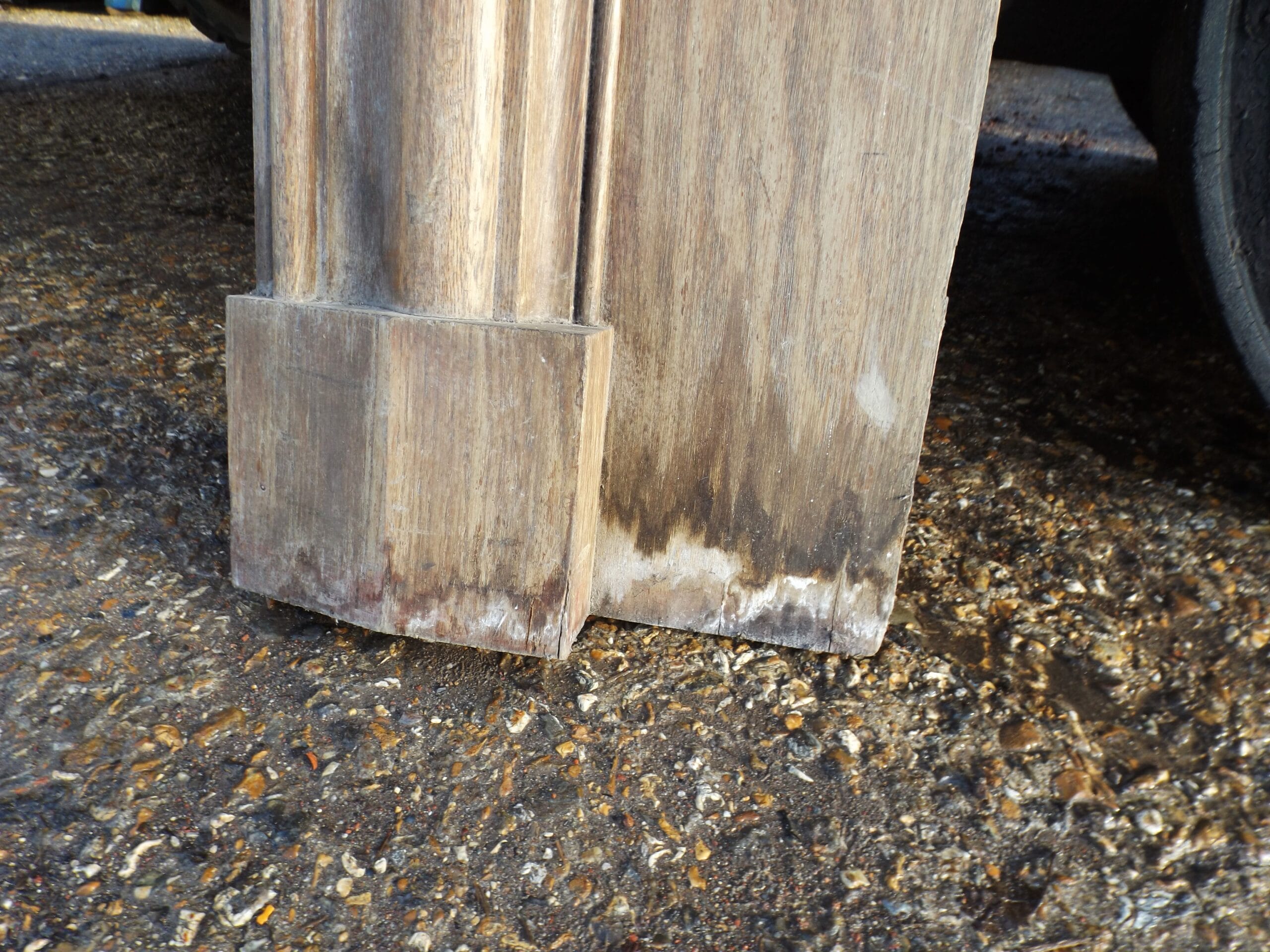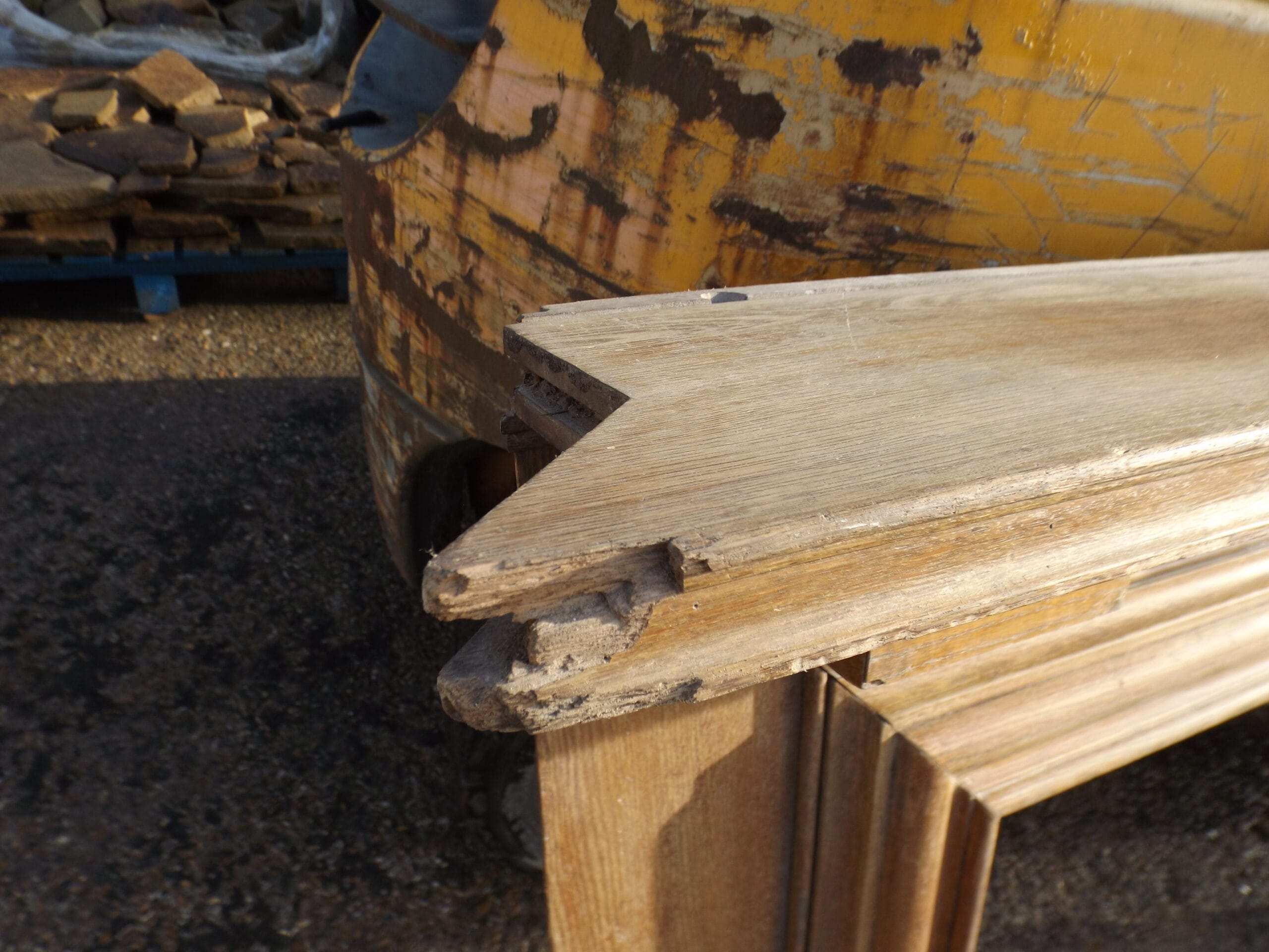 In good solid ex-site condition, this item would originally have integrated into a panelled room and hence has grooving at the rear of the mantel shelf and on the sides of the jambs to fit as such, the mantel shelf is also shaped at the ends. One of the square corbels is missing, there is some damage to the mantel ends and there is water marking at the bottom of one foot (please see photos).