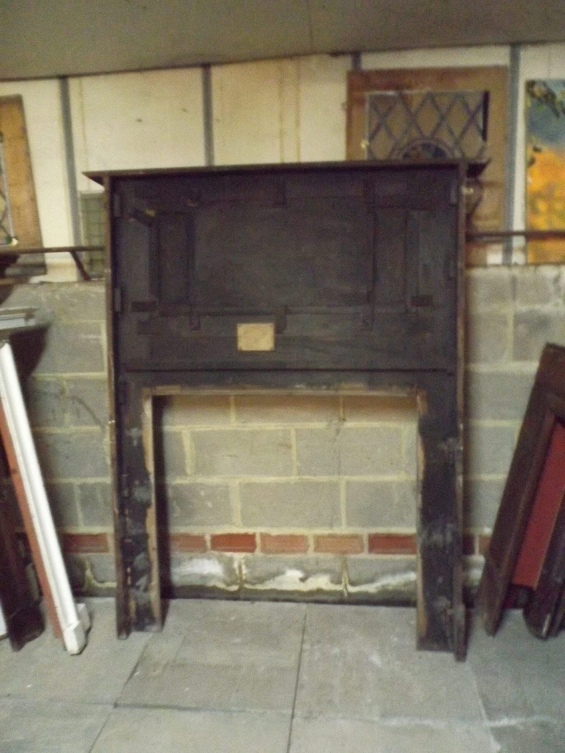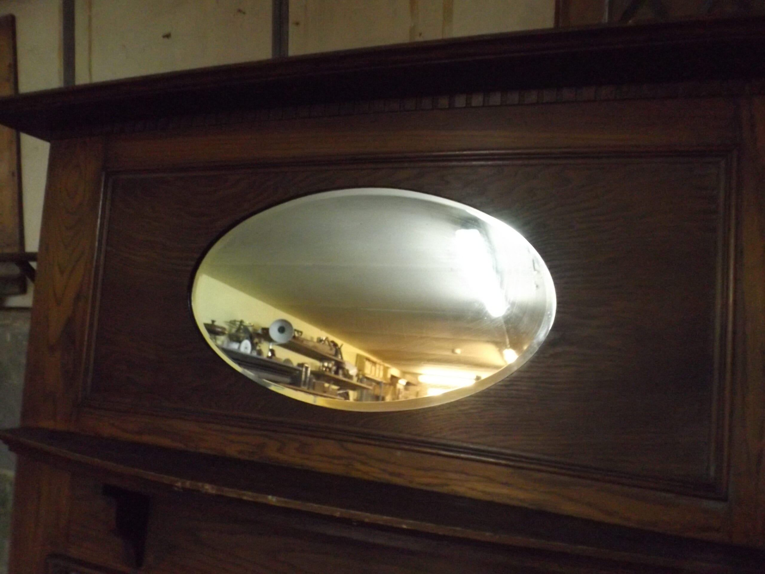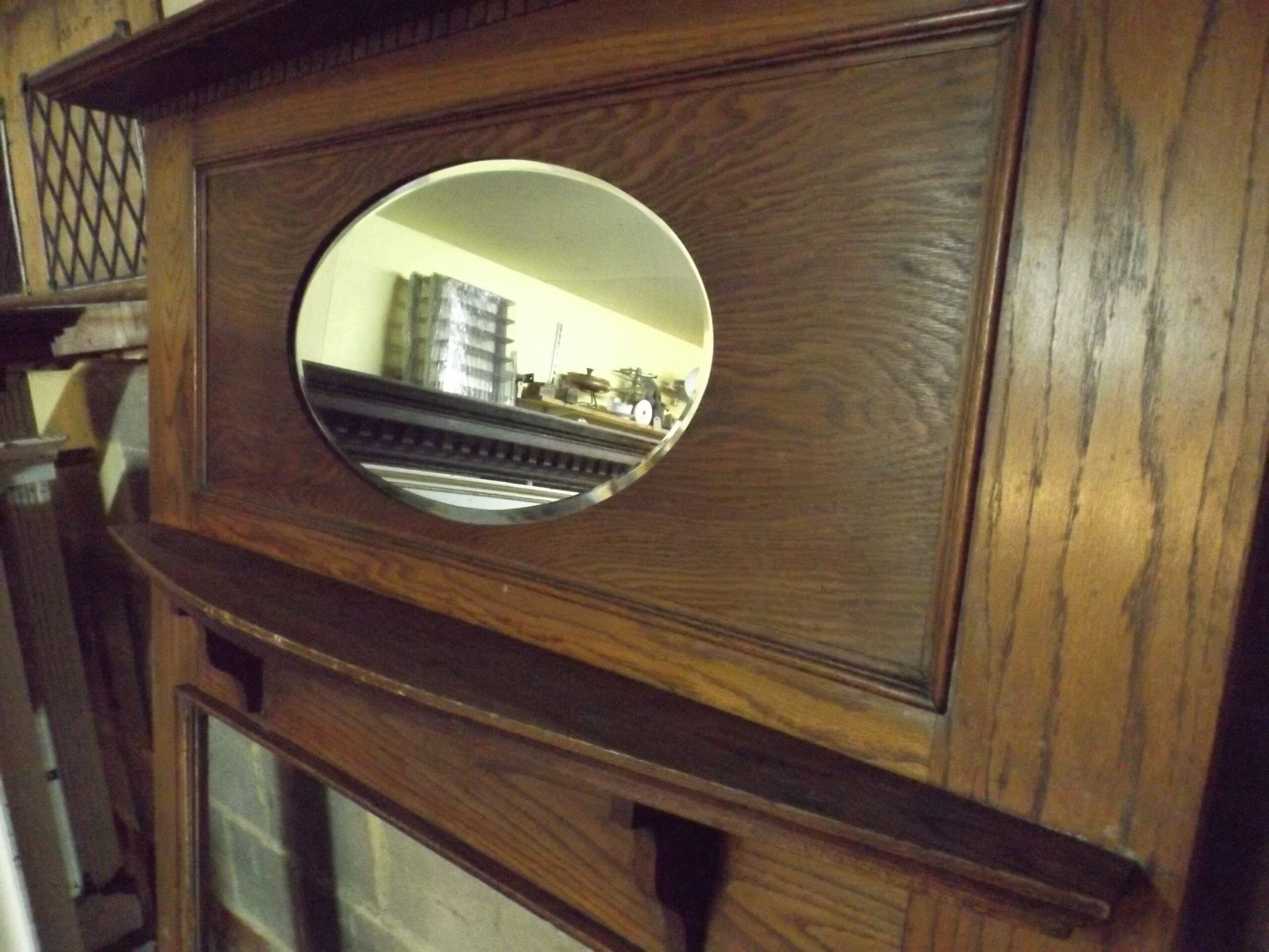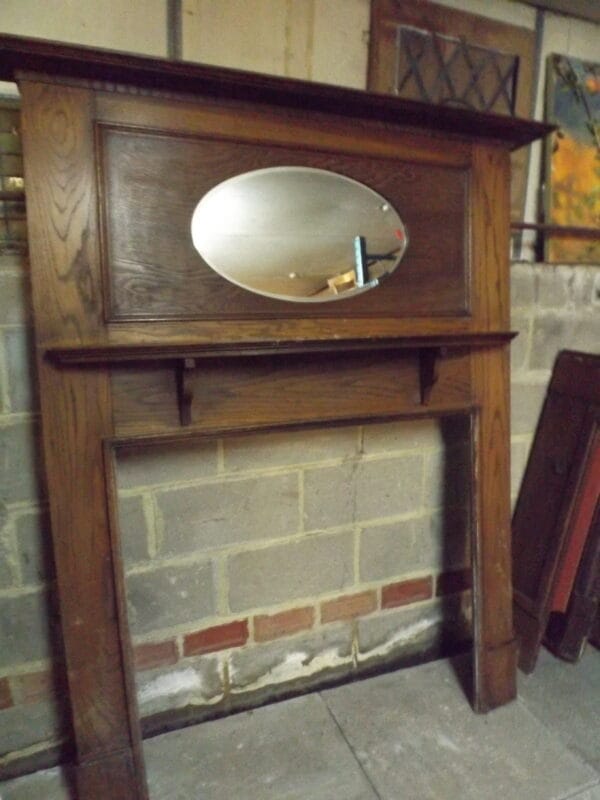 A nicely shaped mantel shelf with dentil moulding below and an oval bevelled mirror to the centre of the frieze. There is a gently curved shelf below the frieze with two simply carved corbels and a moulded trim around the opening. In good solid ex-site and unrestored condition, there are some scuffs and scratches to deal with. This fireplace has a slight twist to it which would be dealt with when attaching in place.