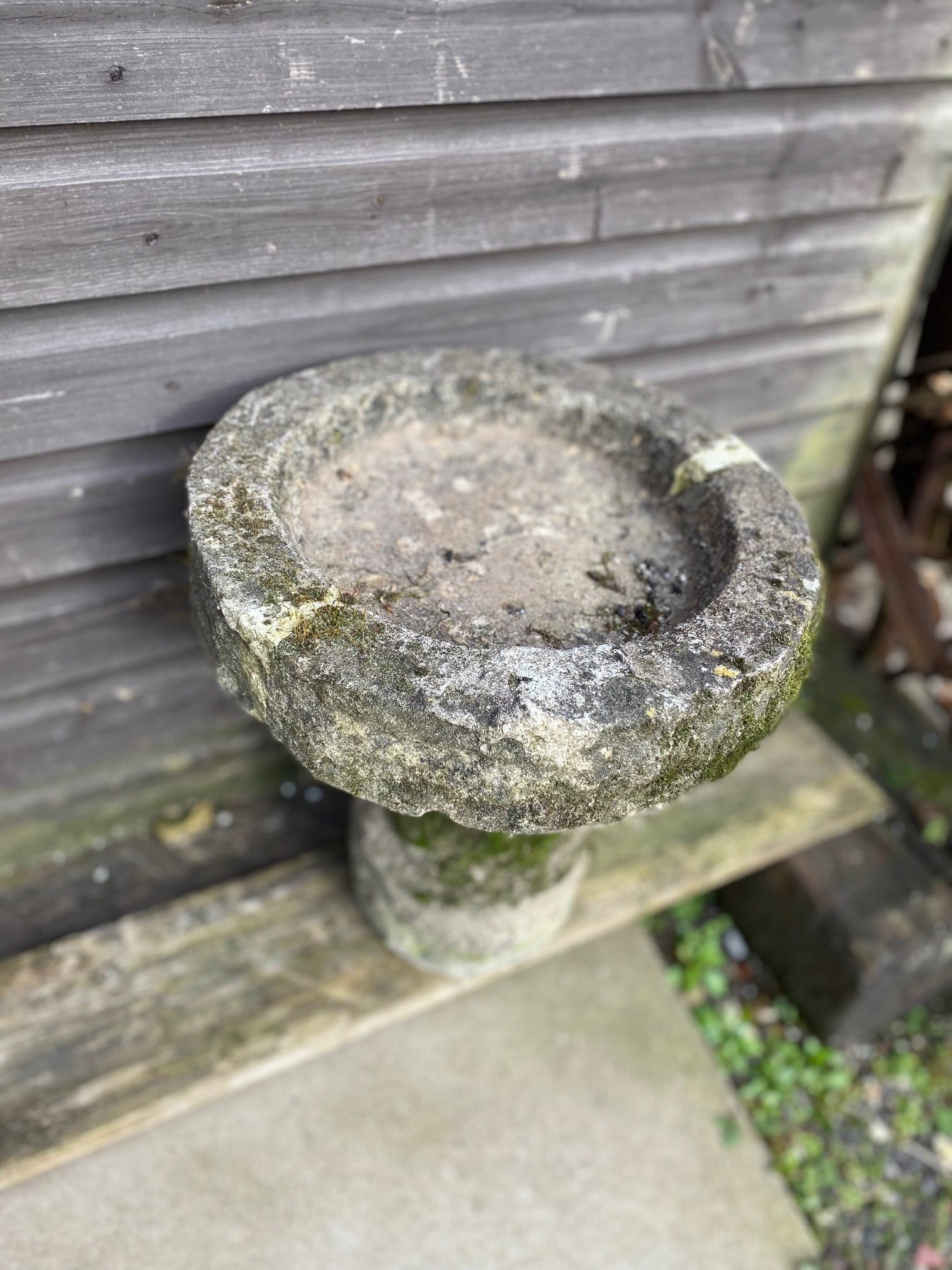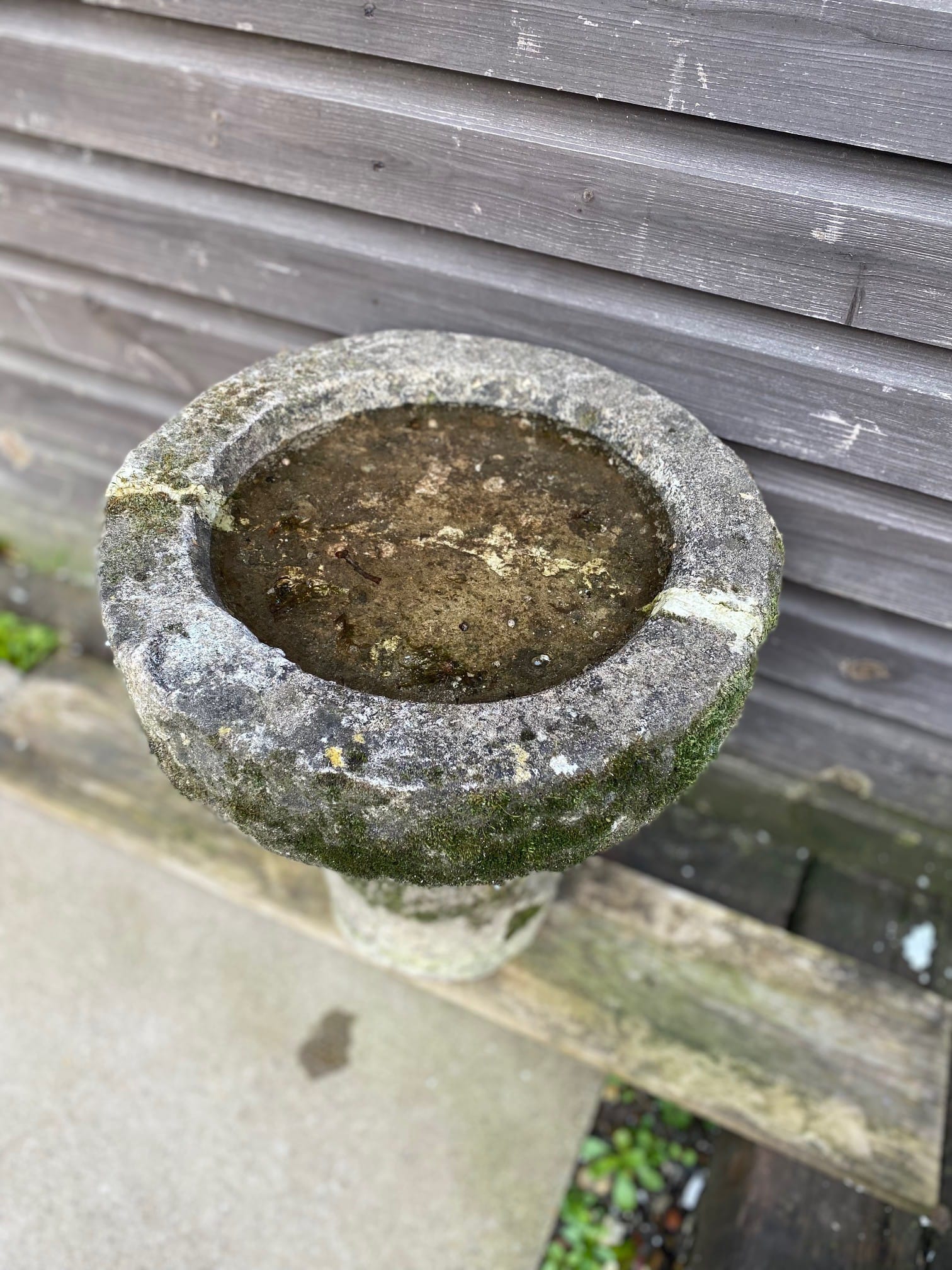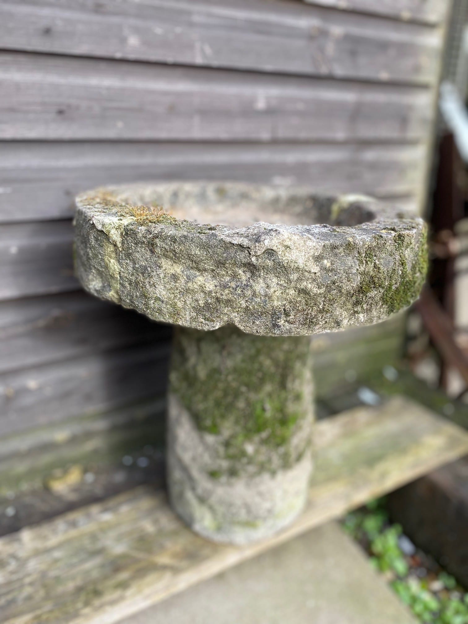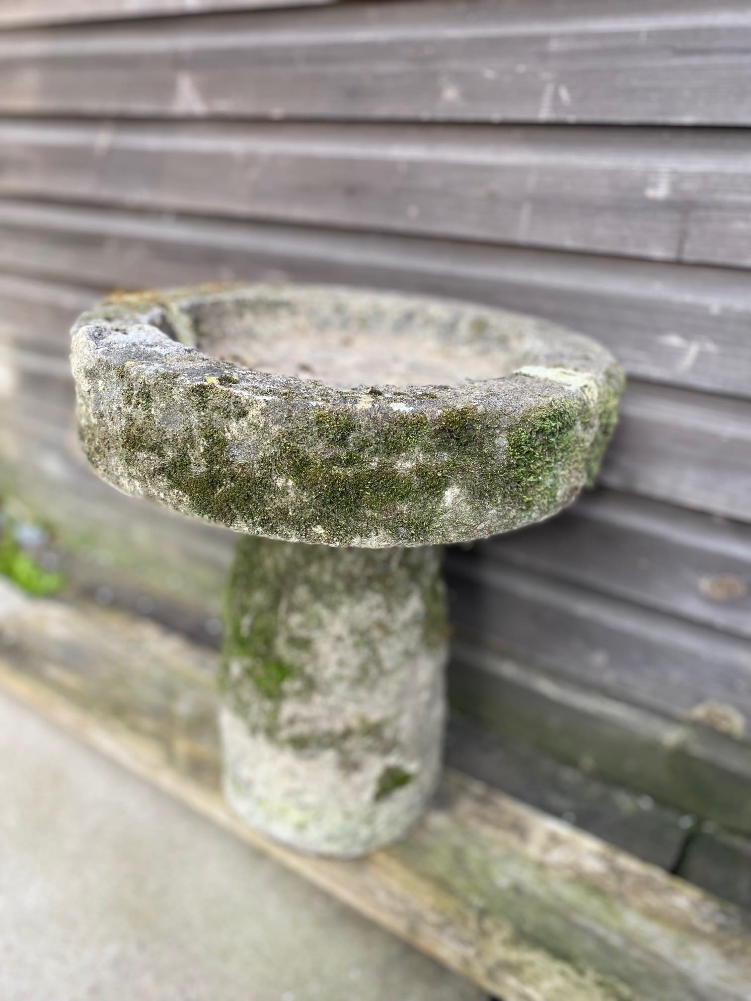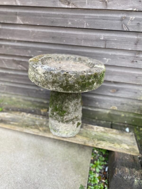 A small and primitive stone bird bath with plenty of moss and bags of character. Simple, unfussy and folksy.