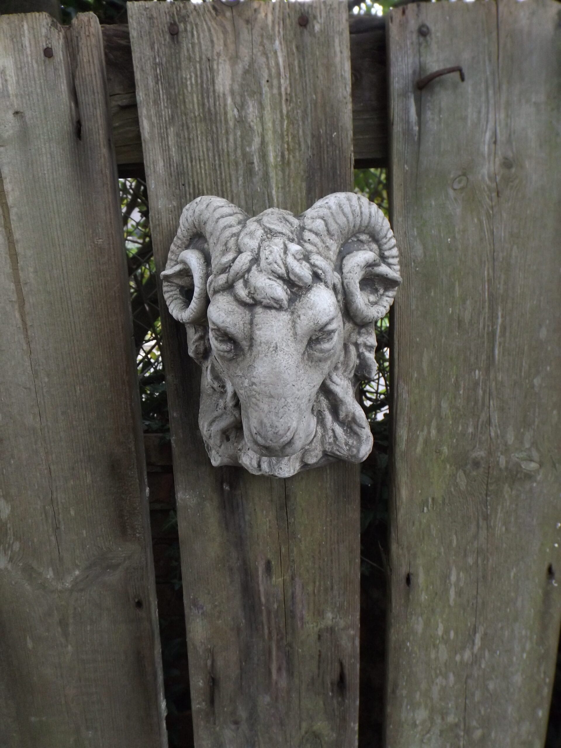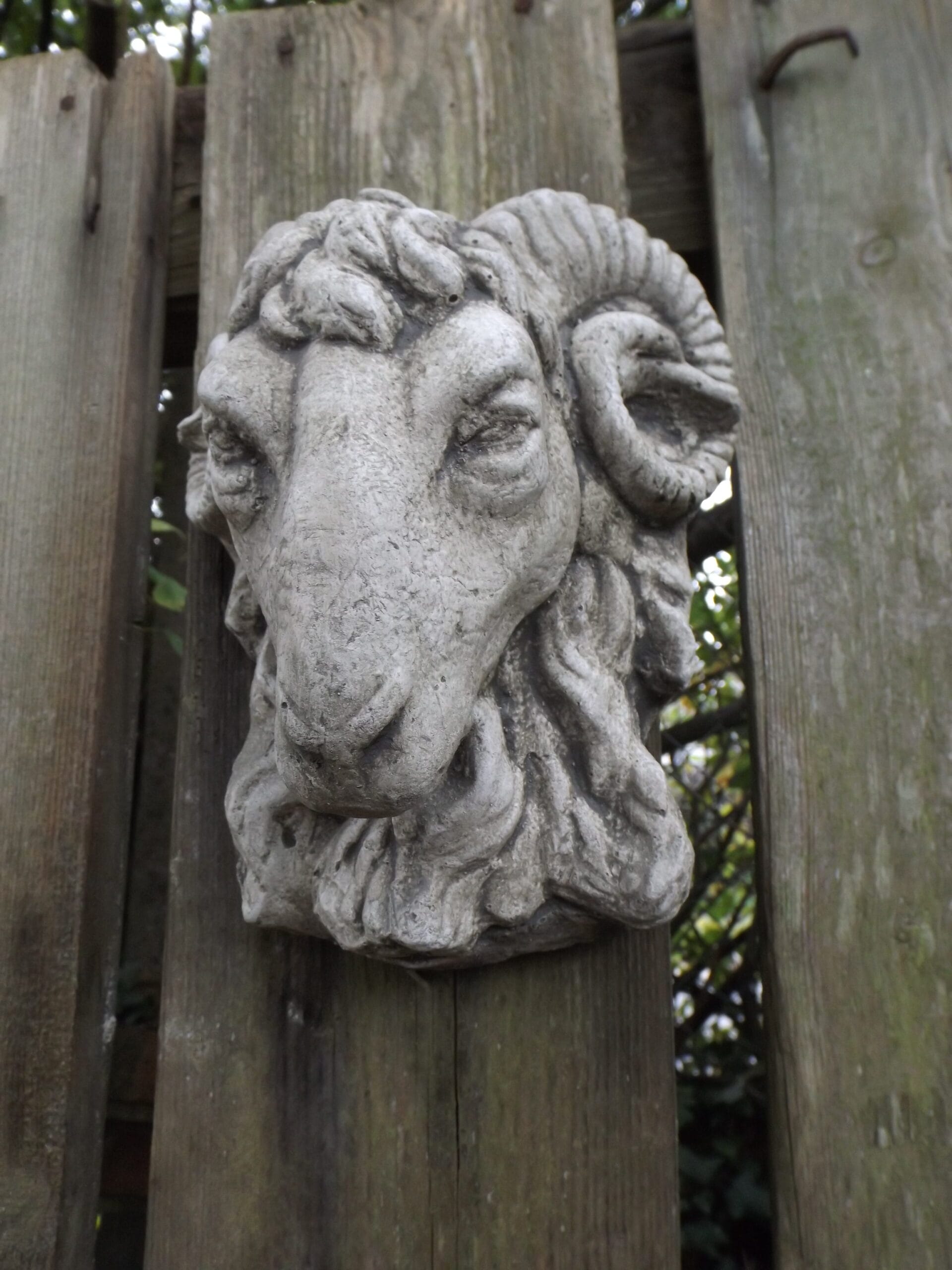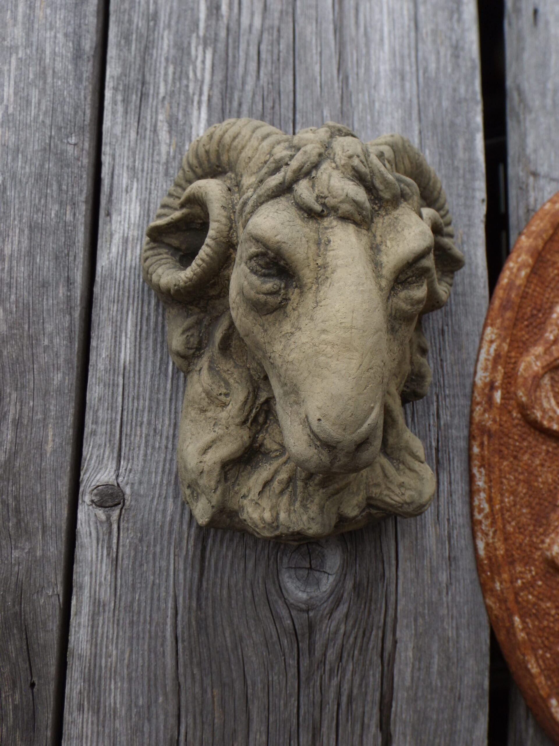 A nicely detailed rams head wall plaque moulded from a lead original. Hand cast in Sussex in frost proof reconstituted stone and available in either aged sandstone or white finish. Strong wire hanger embedded in back. because this item is handmade, colour/finish can vary slightly from that shown.