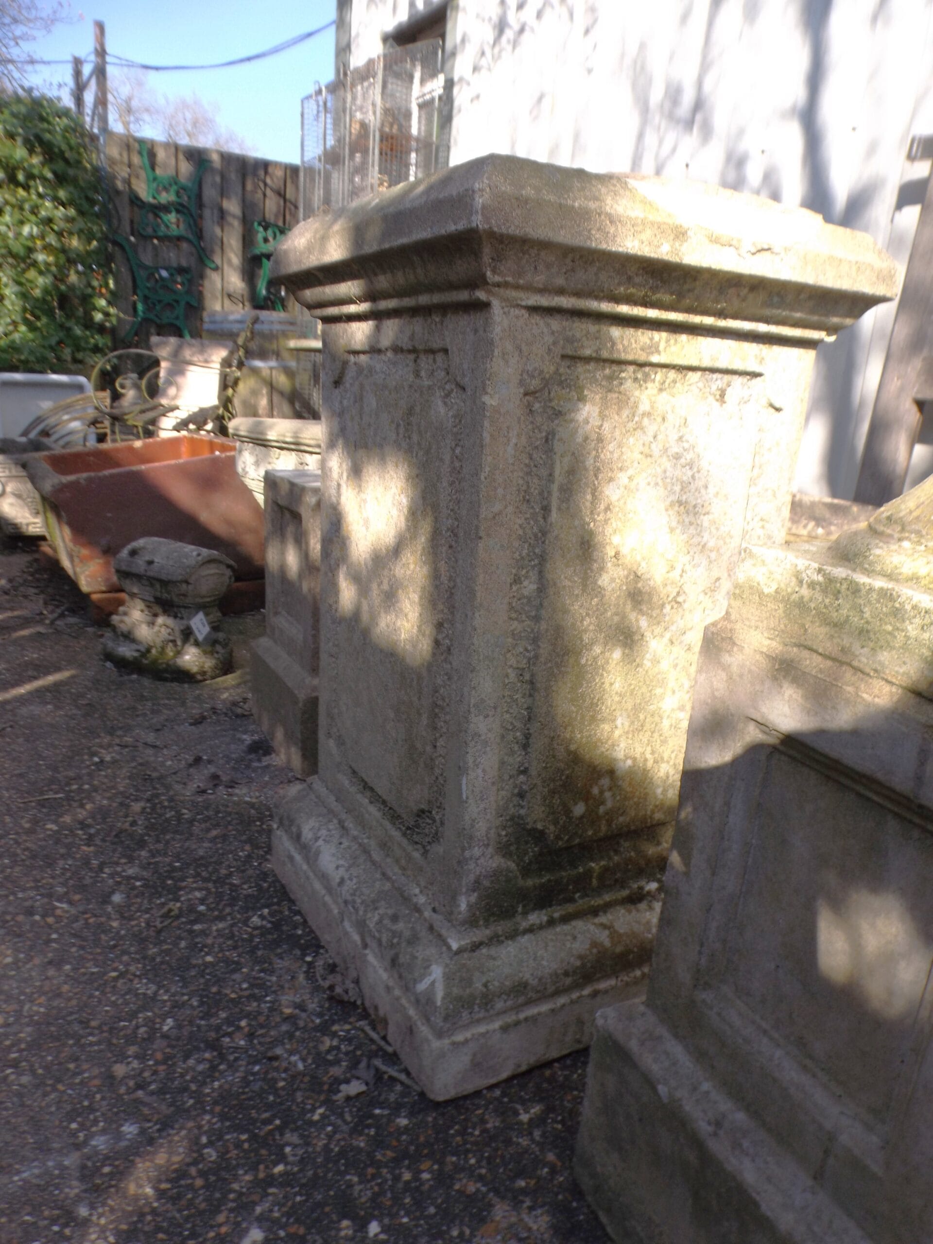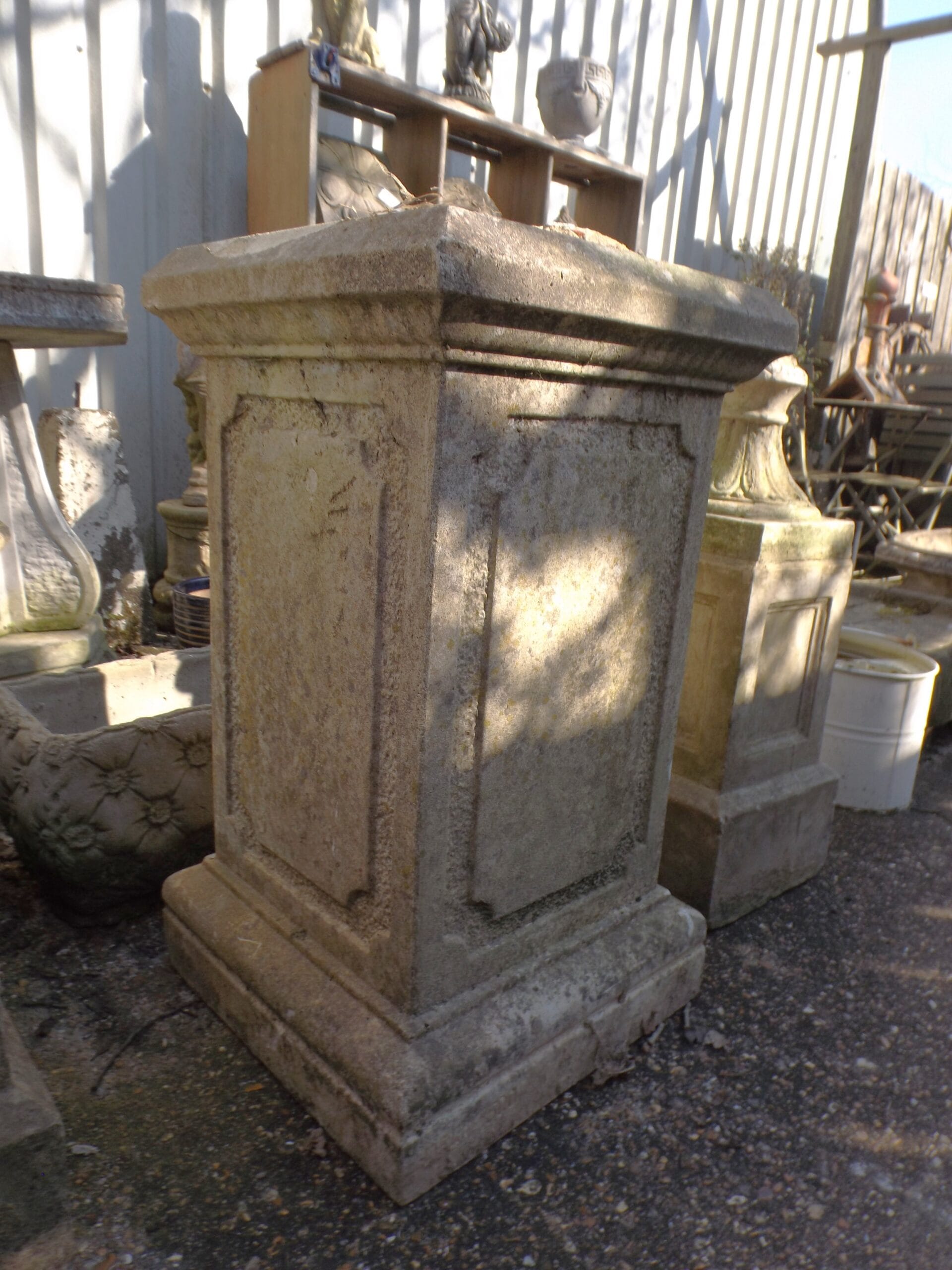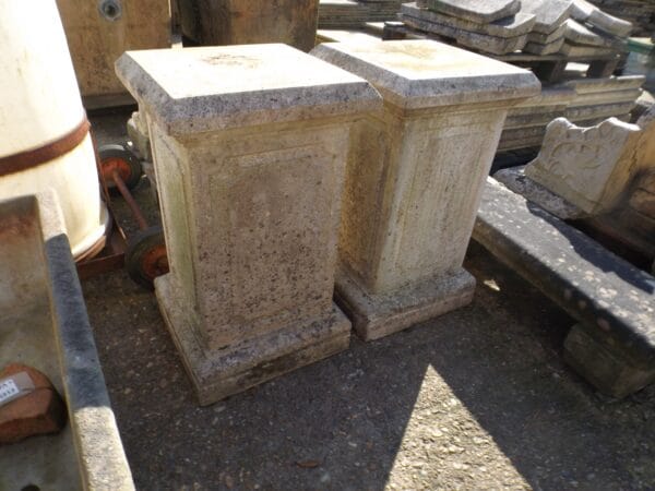 We have three of theses elegant and well weathered reclaimed classical garden plinths. Large, impressive and a statement feature for the garden. In good solid condition, typical signs of age with a few chips and scuffs and one has cement remaining on top.
