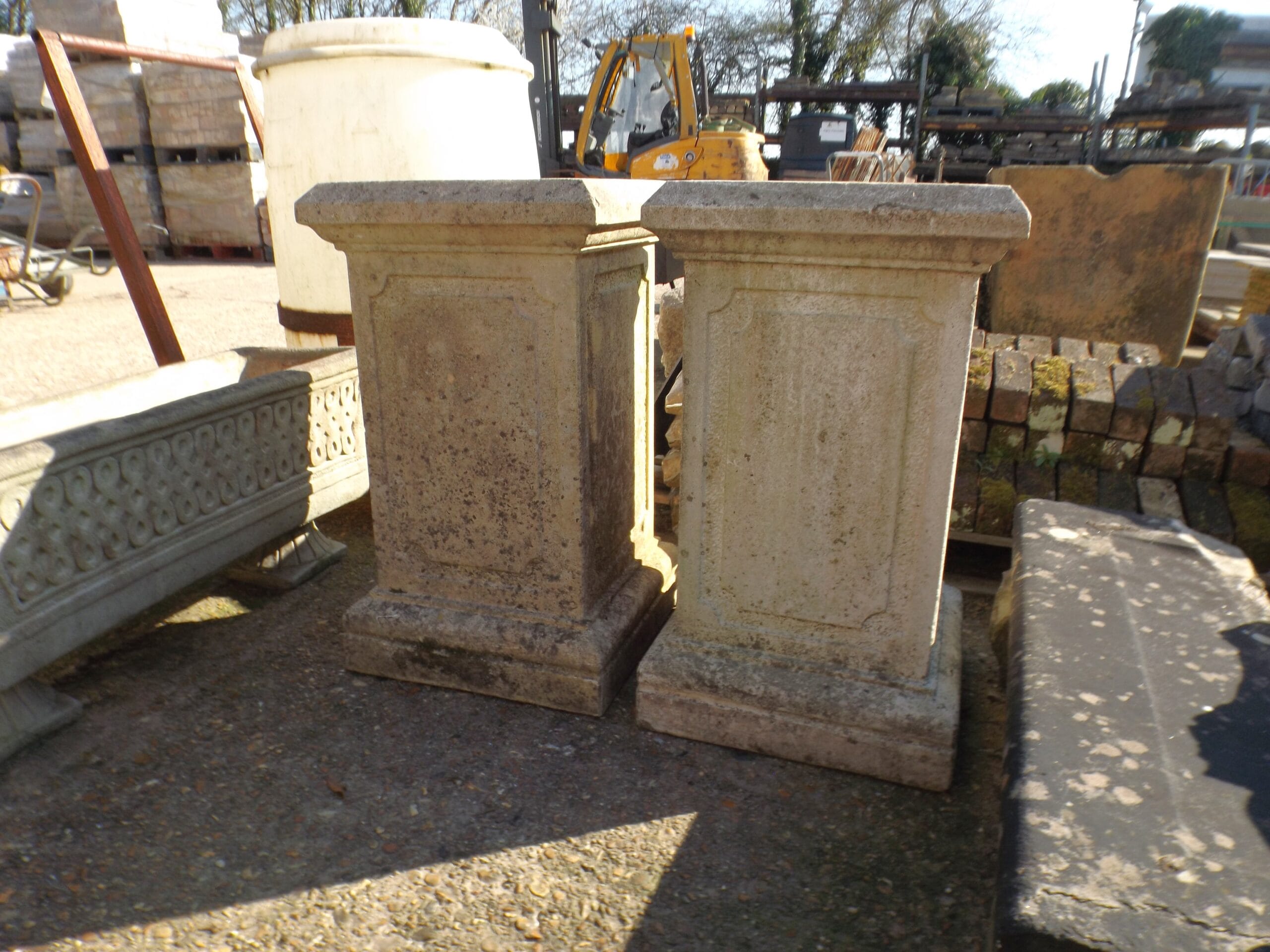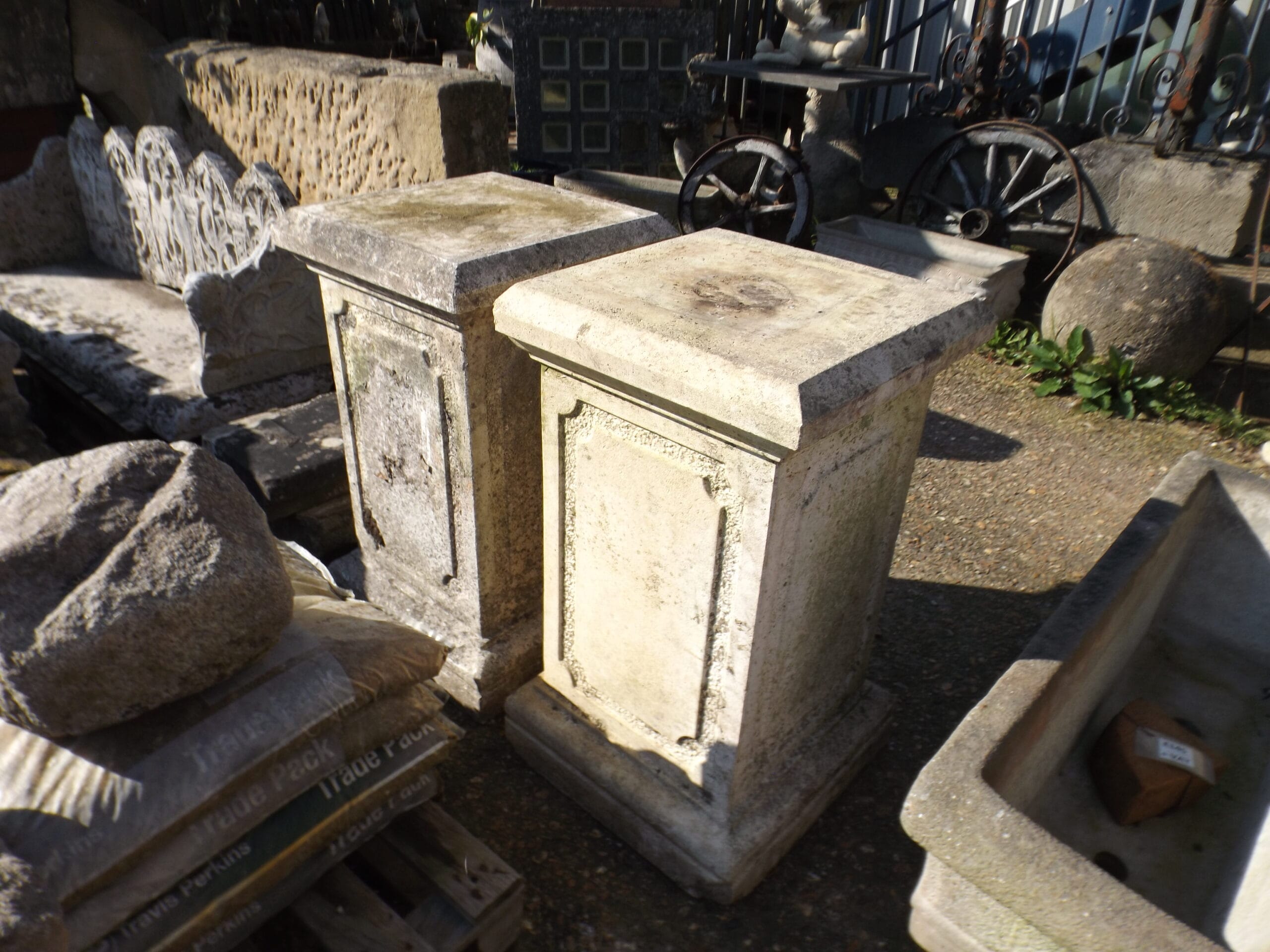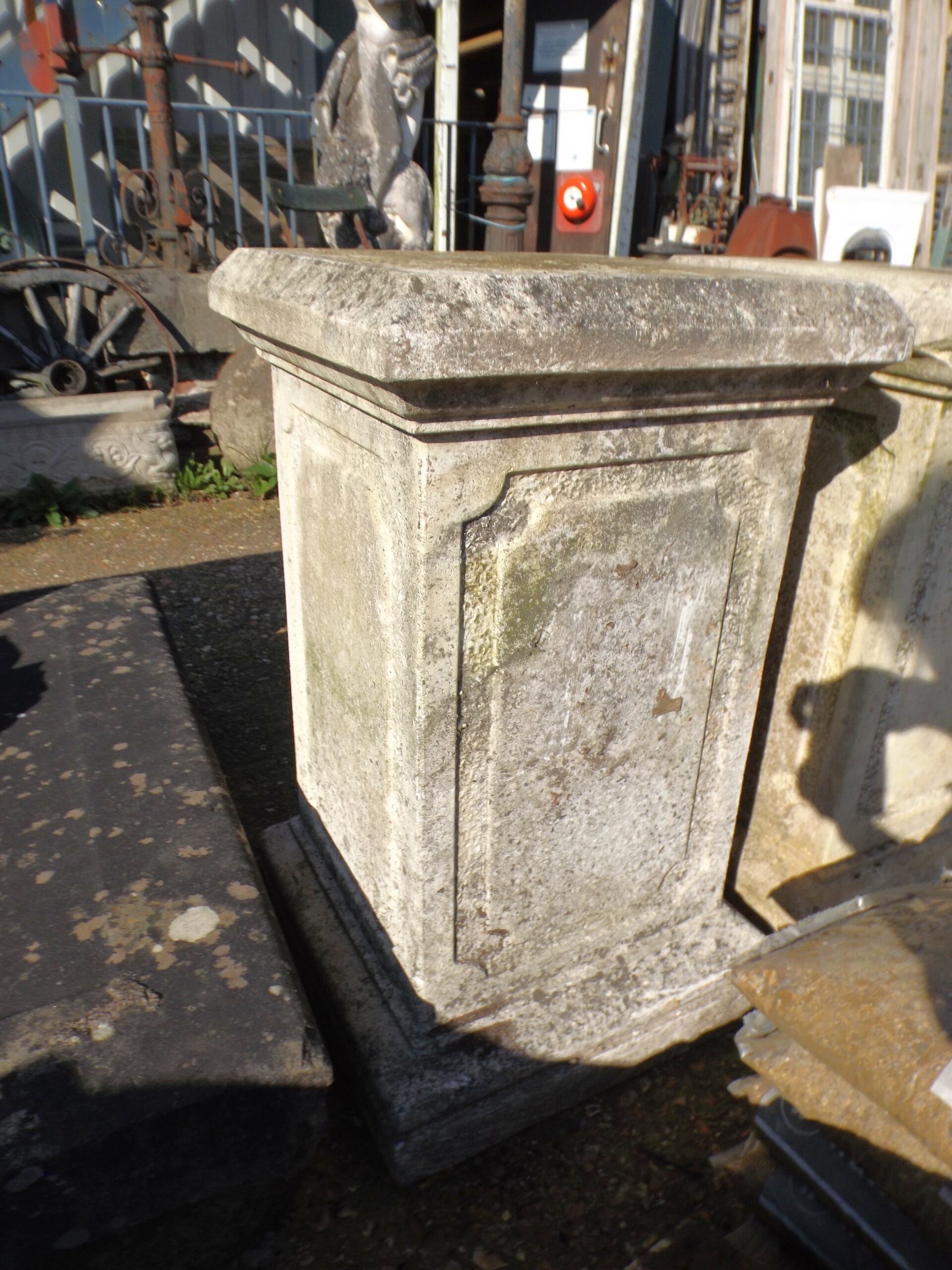 We have three of theses elegant and well weathered reclaimed classical garden plinths. Large, impressive and a statement feature for the garden. In good solid condition, typical signs of age with a few chips and scuffs and one has cement remaining on top.