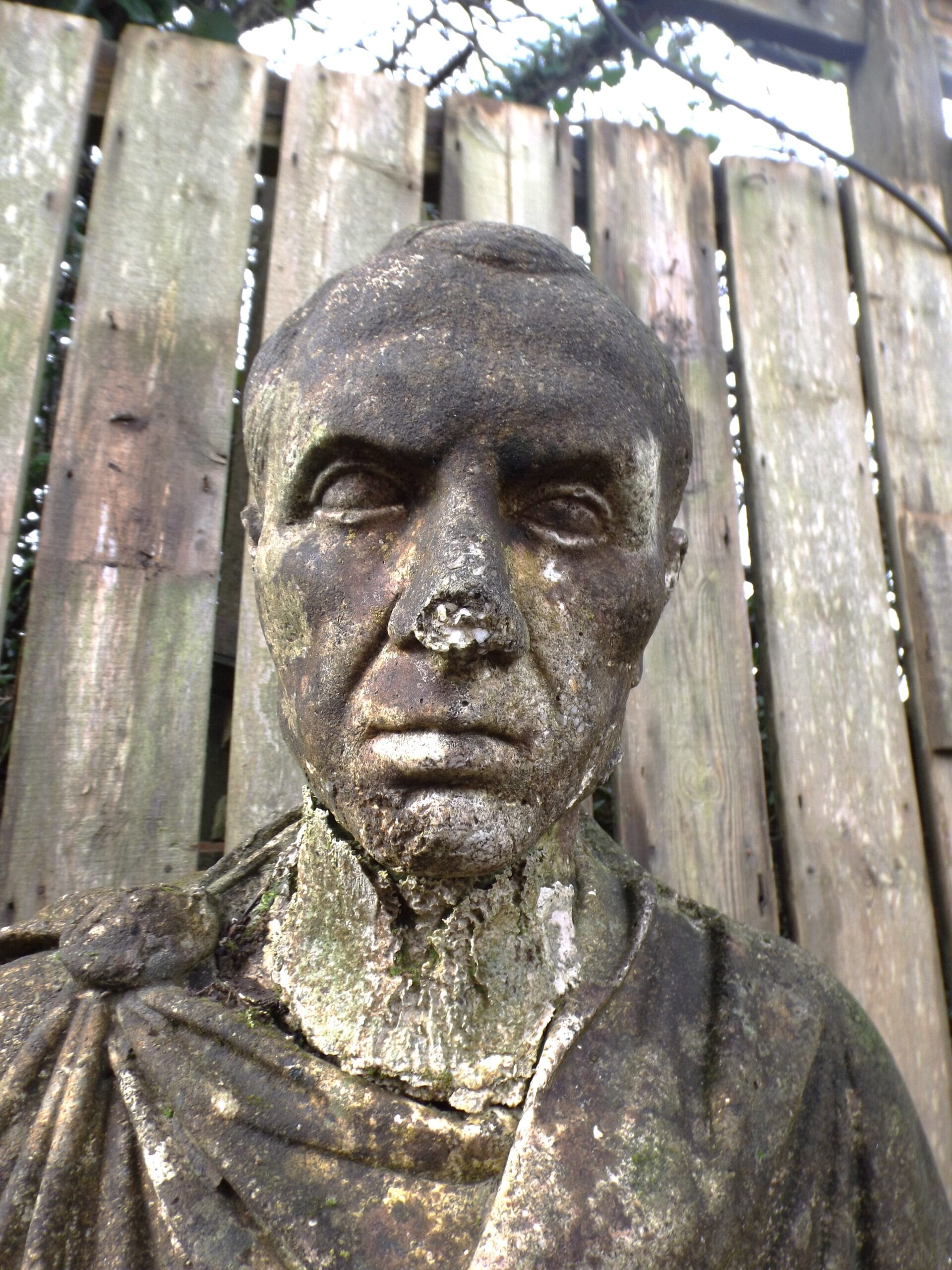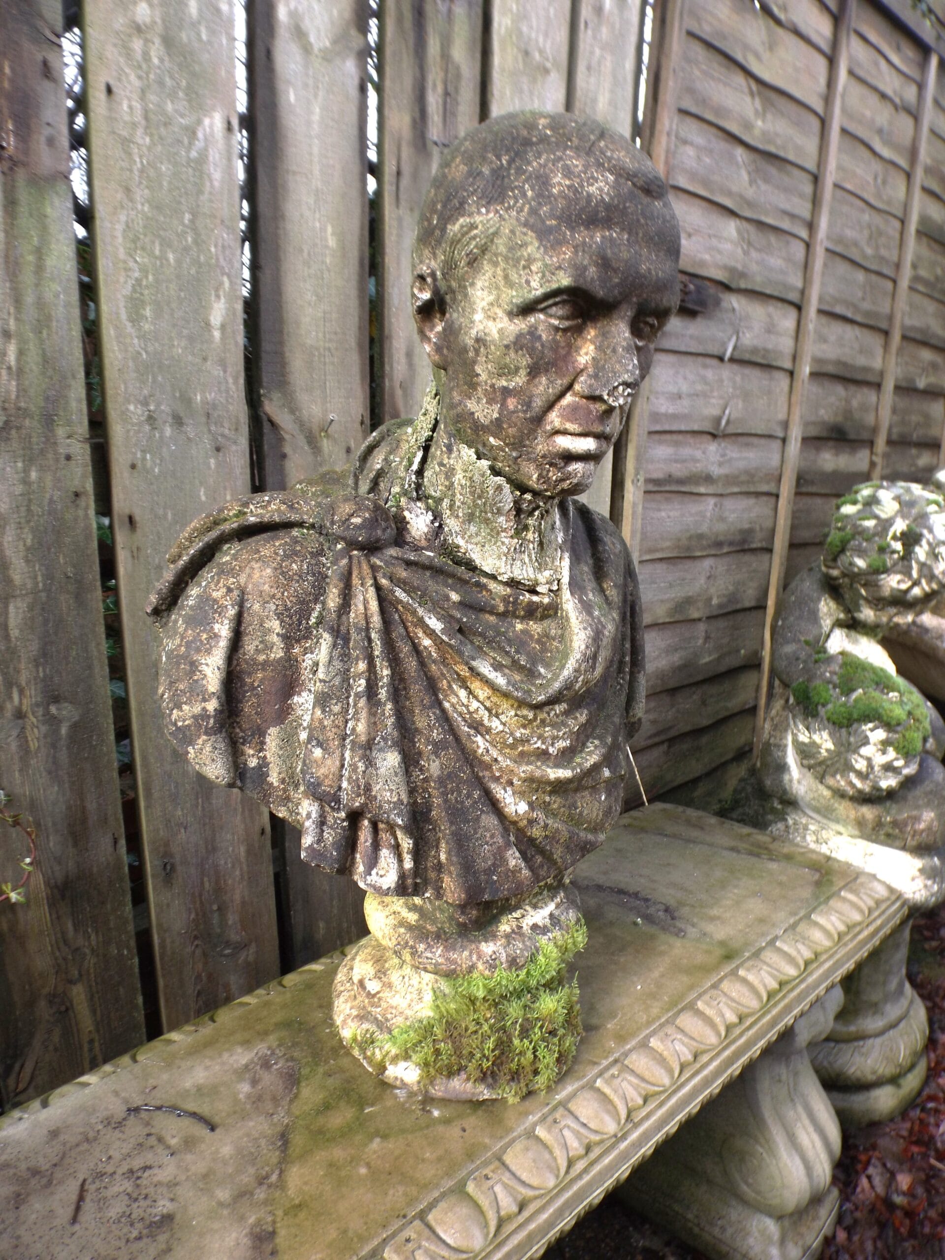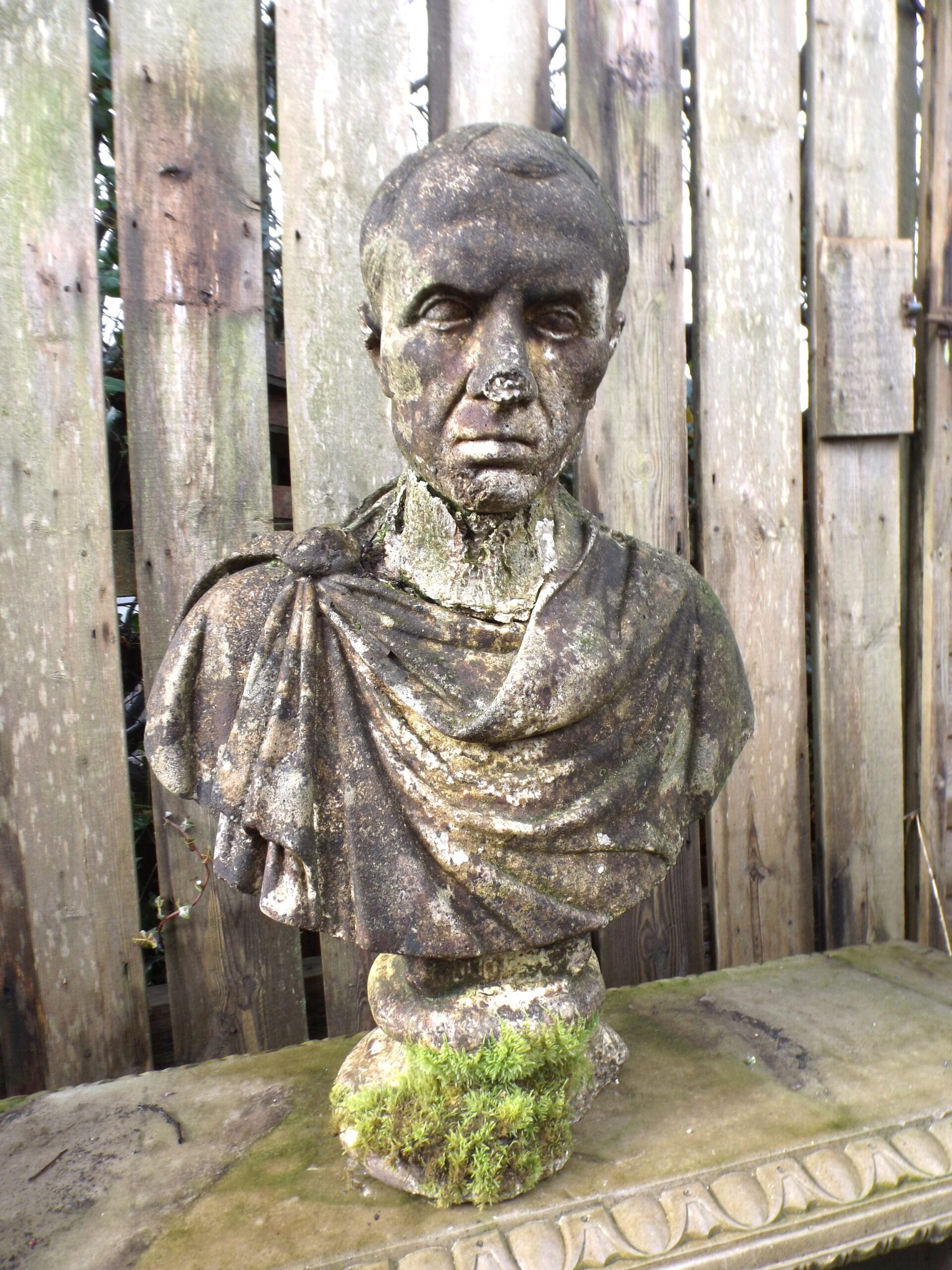 A striking reclaimed Julius Caesar bust beautifully weathered and with some wonderful moss and lichen patina.