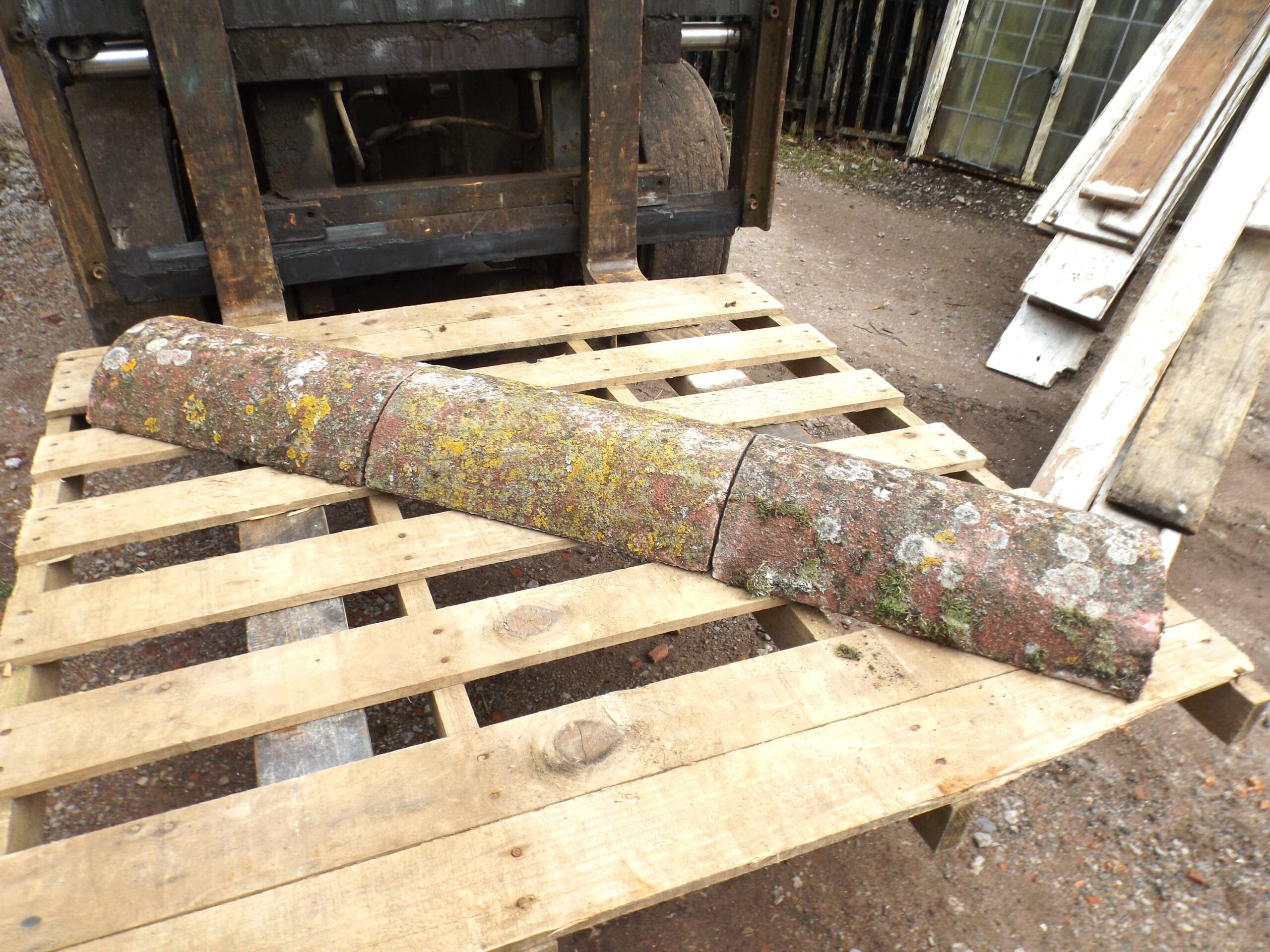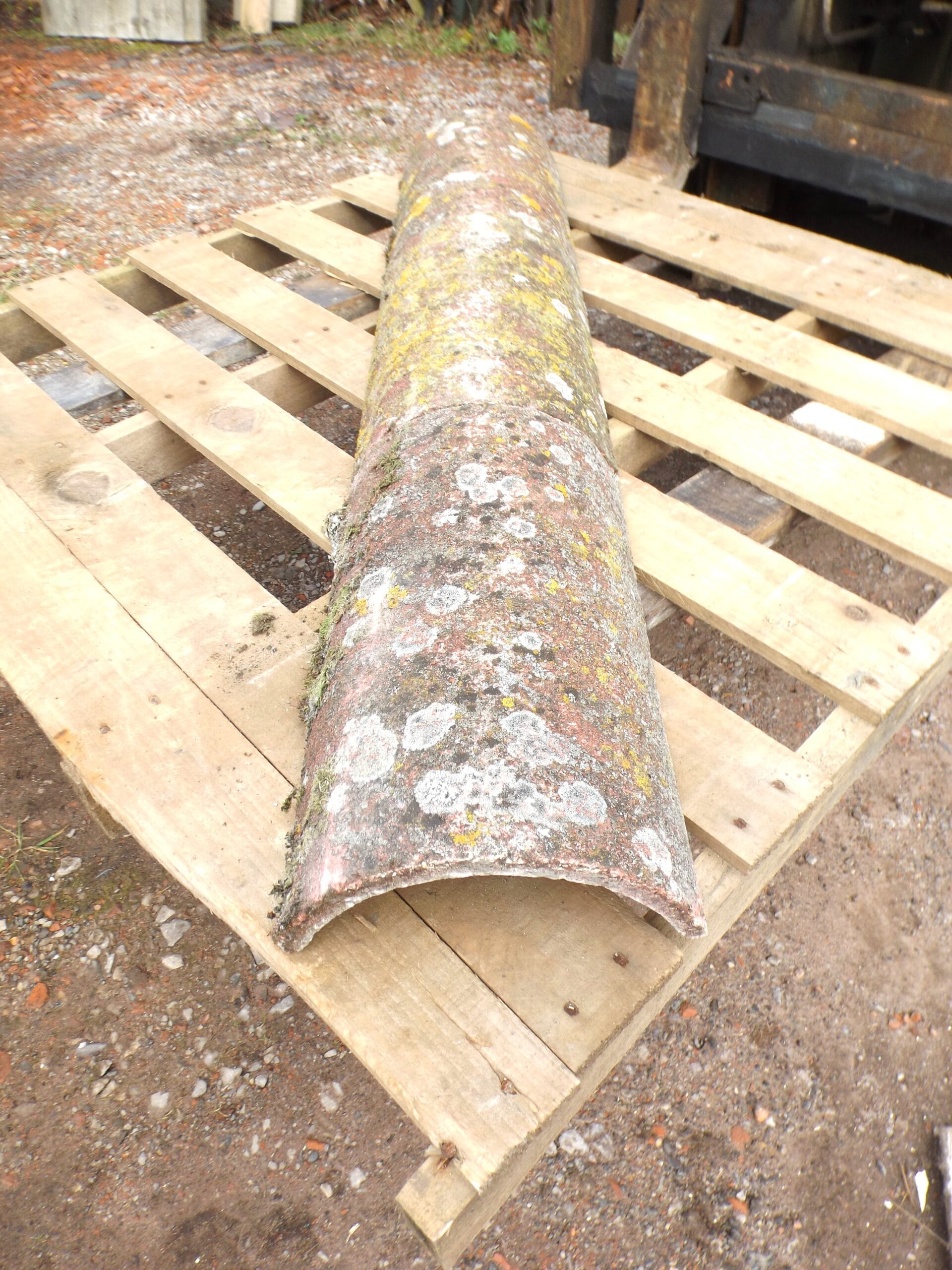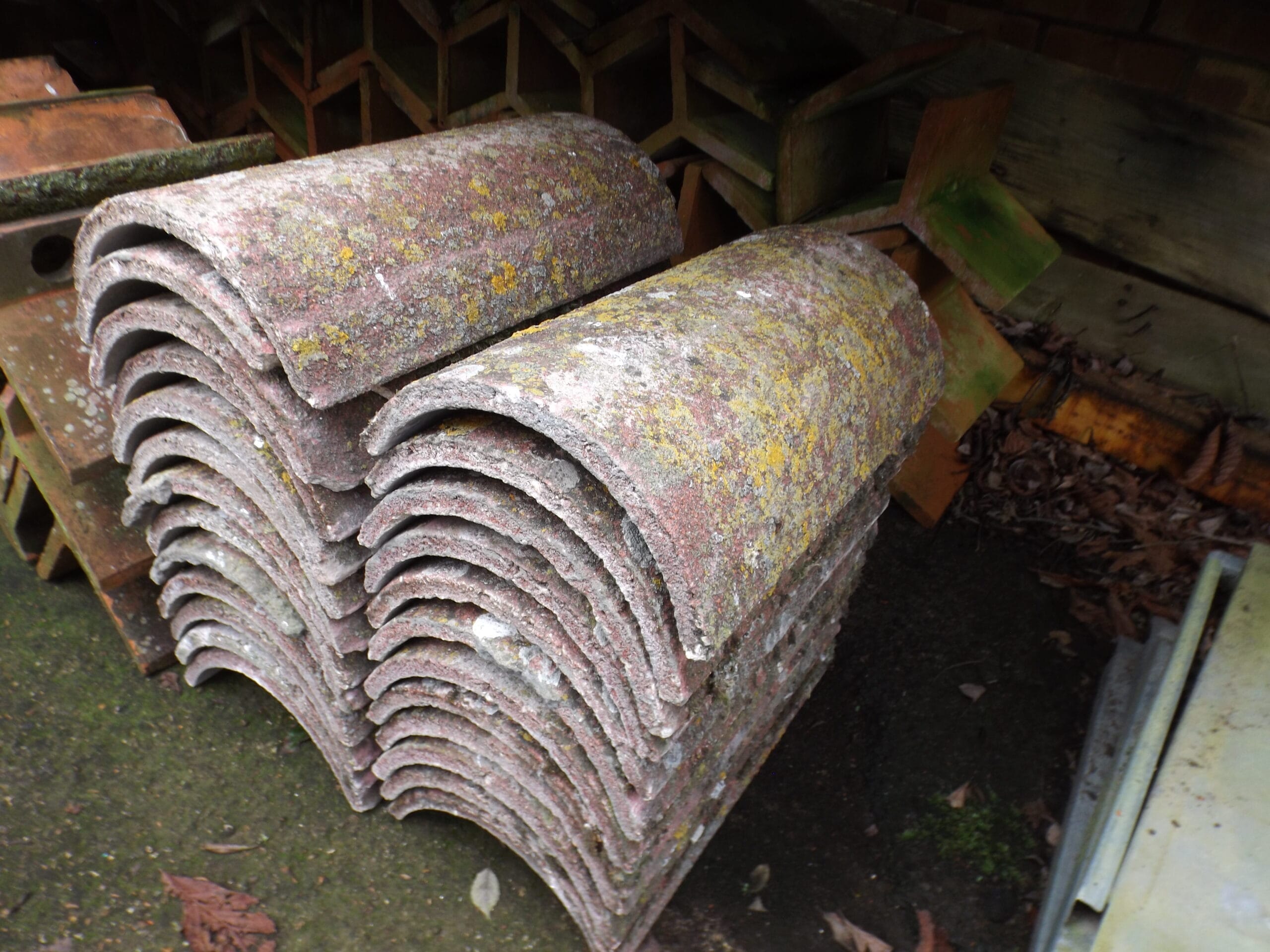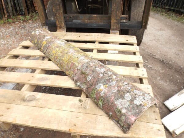 A small batch of reclaimed Redland ridge tiles in a worn red colouring. Standard half rounds with plenty of lichen, moss and weathering.