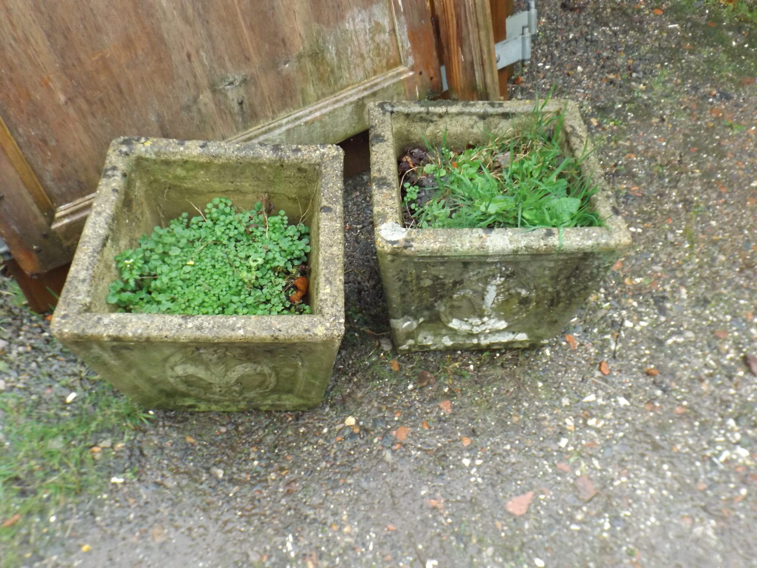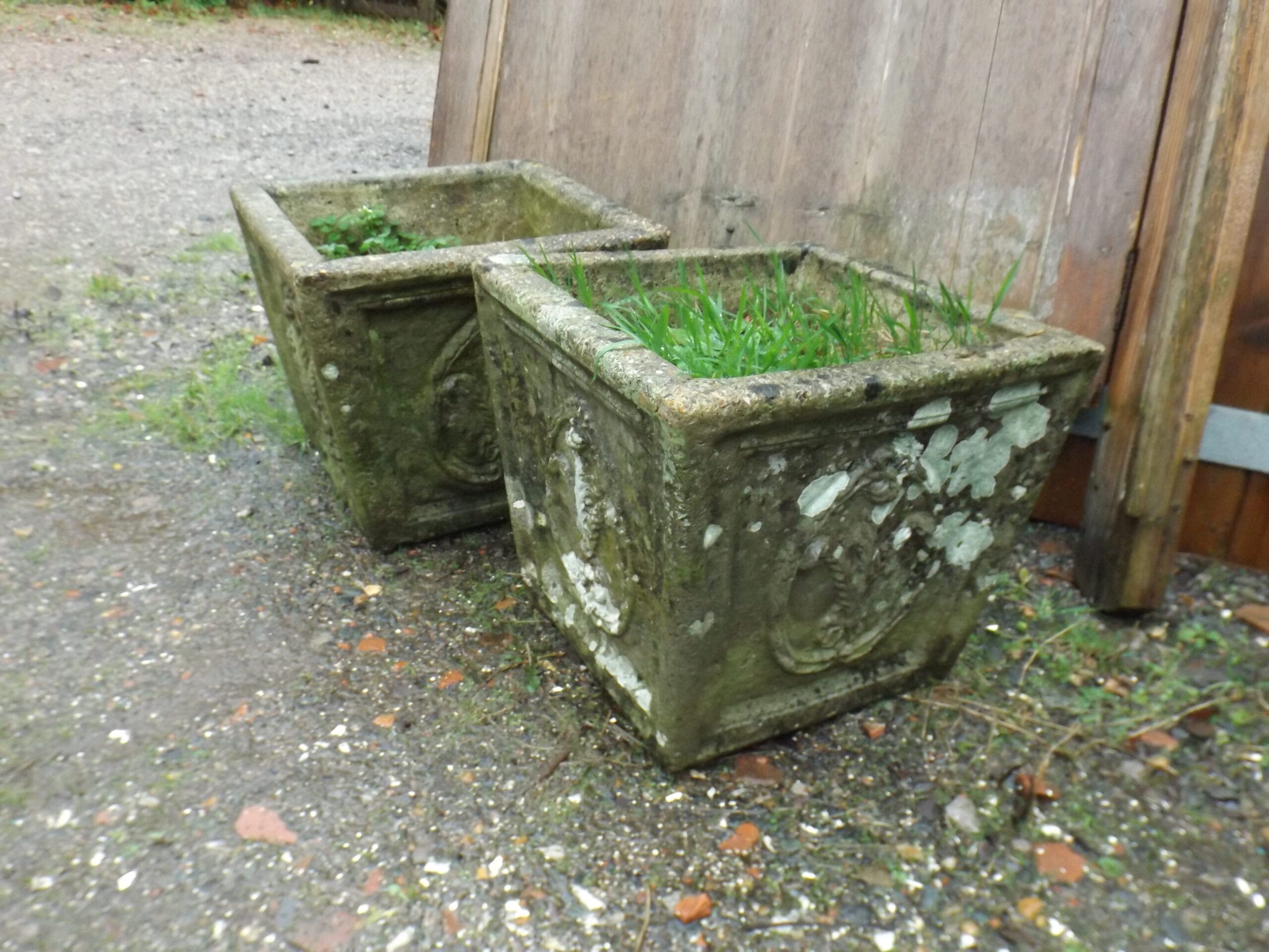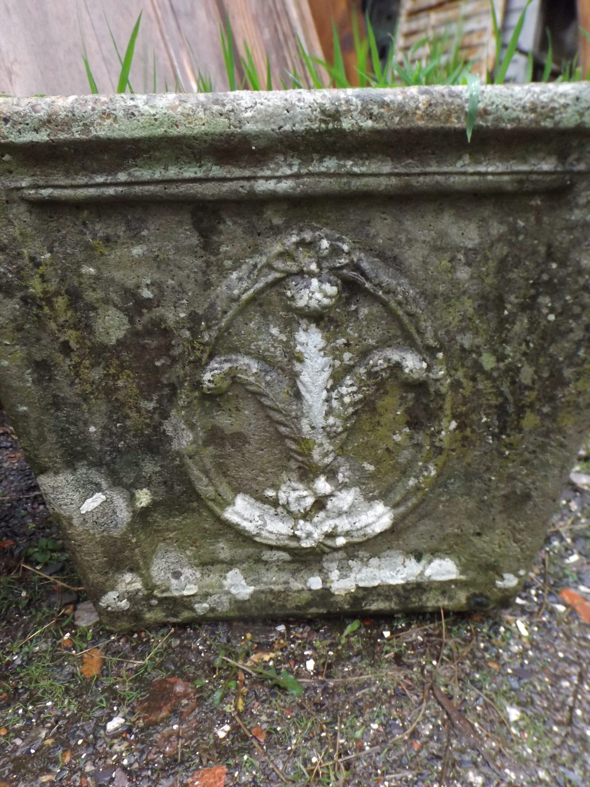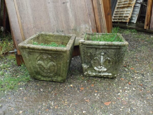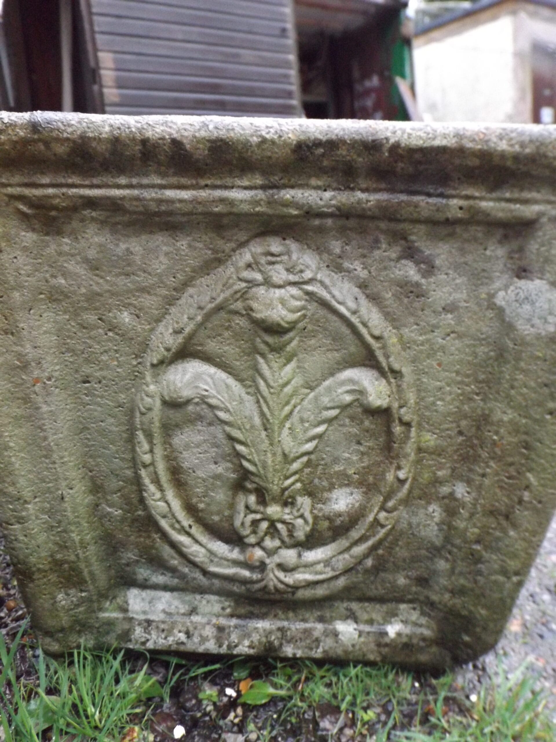 We have two of these reclaimed square planters with a feather crest on all four sides.  Well weathered and nicely detailed with some lovely well established lichen.