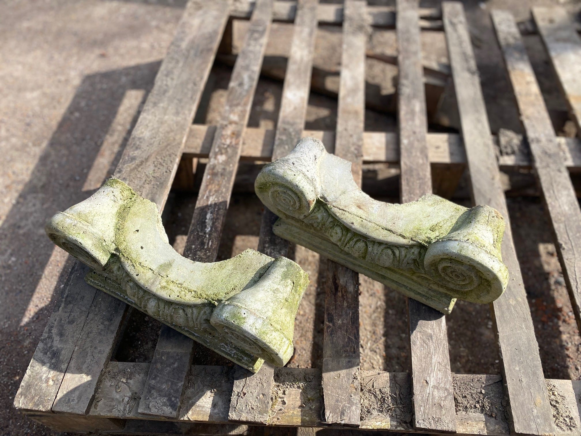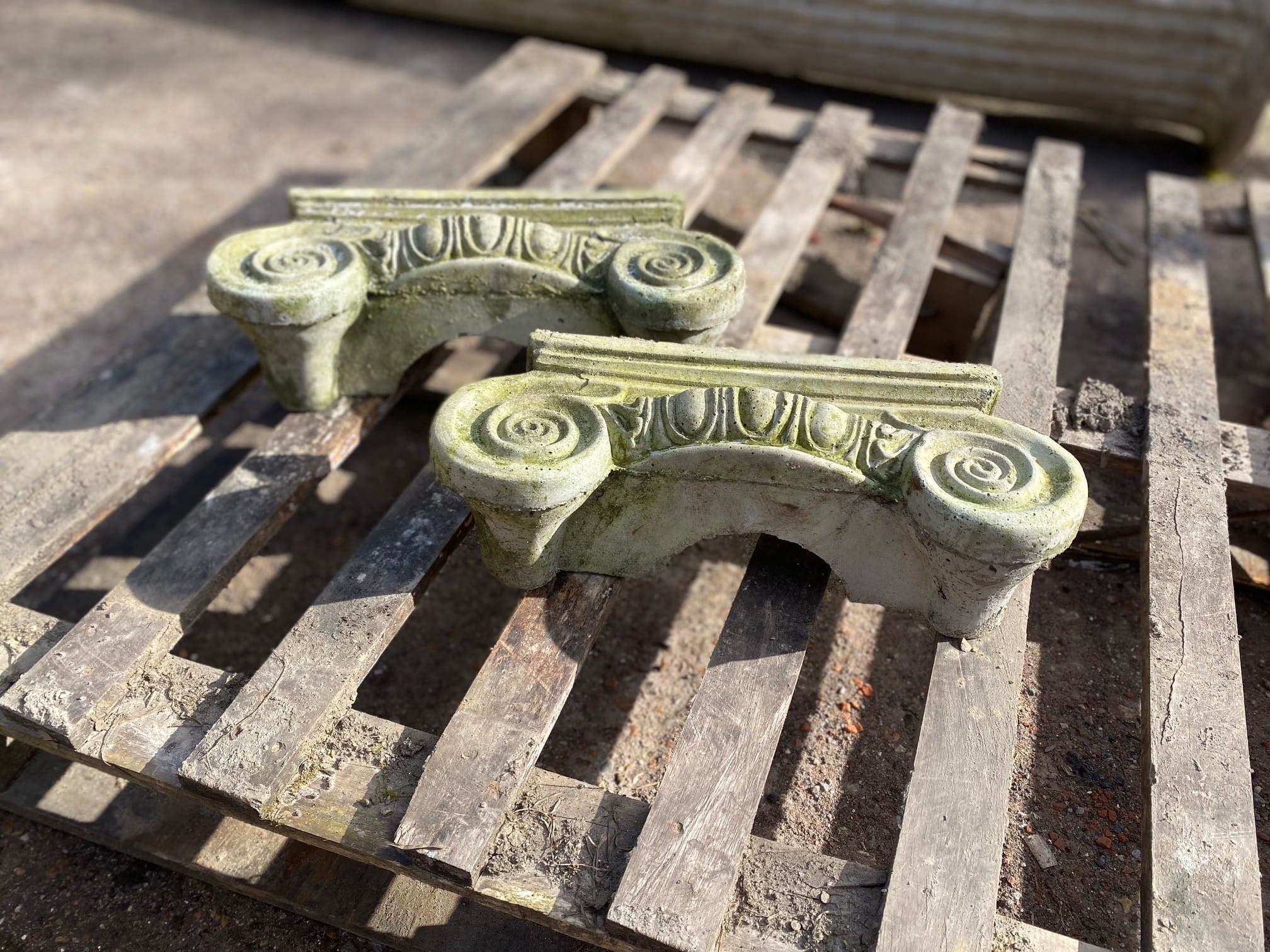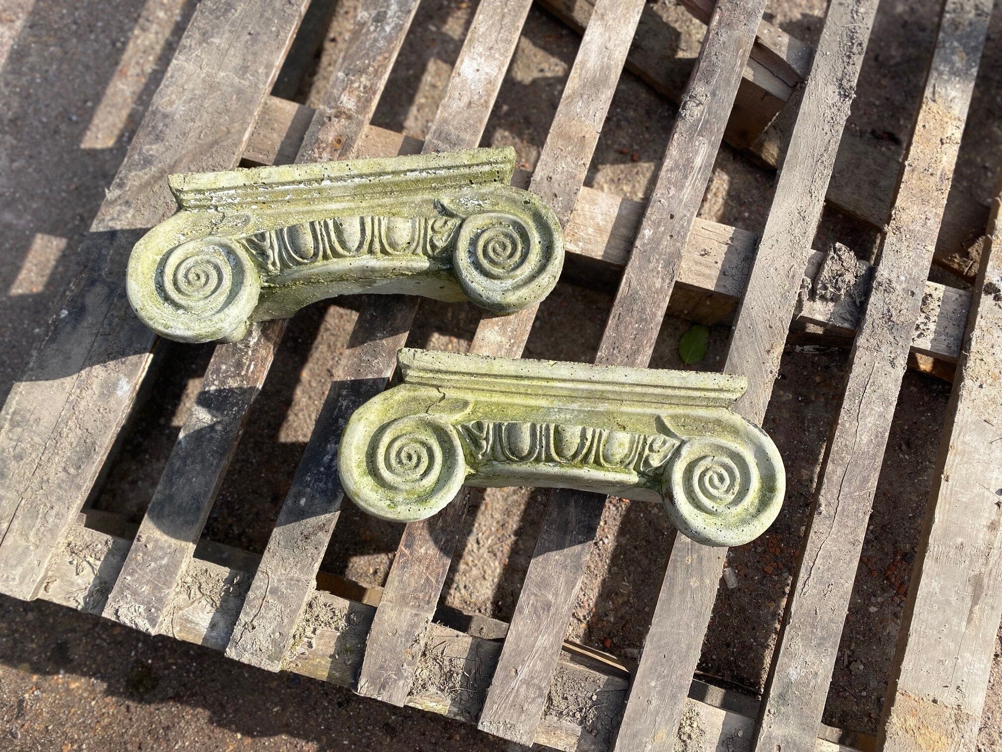 A pair of reclaimed replica Ionic half capitals in excellent condition and with some light weathering. In sound condition and nicely detailed.