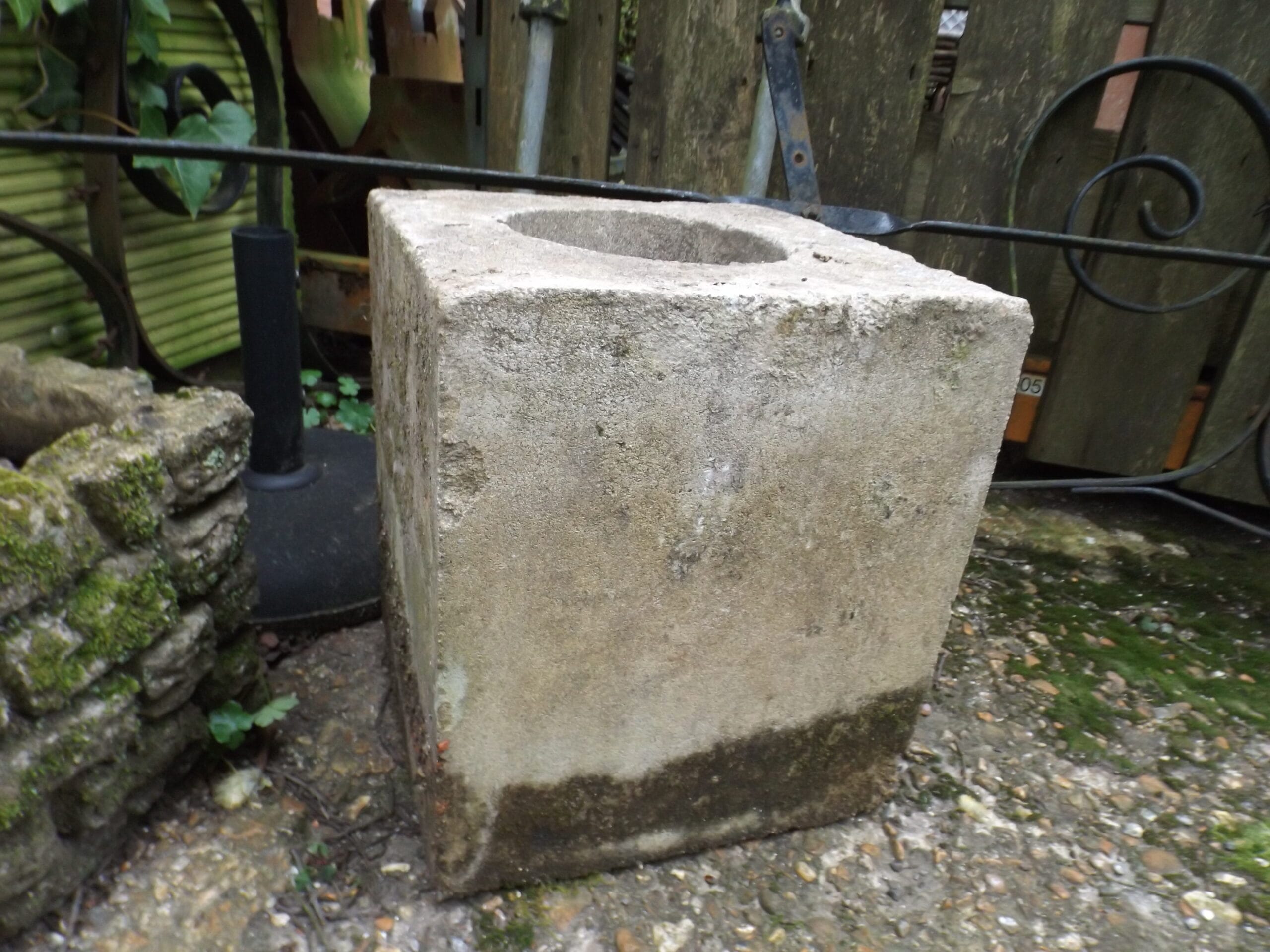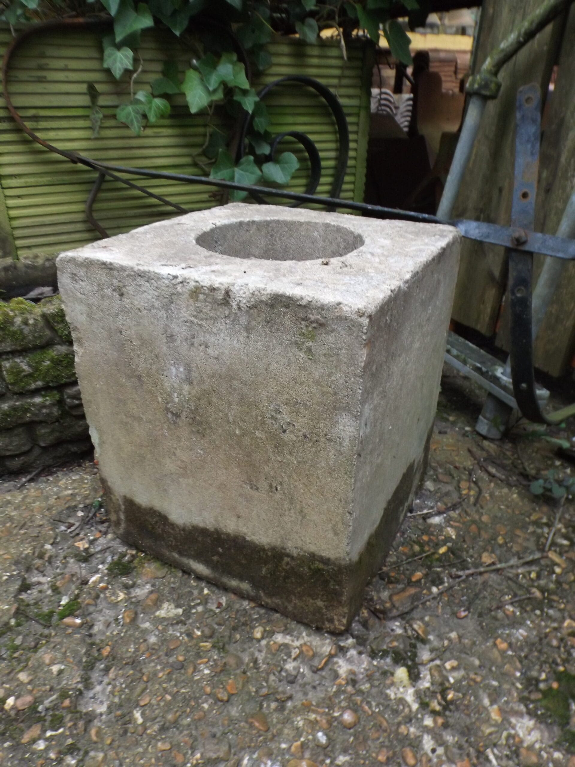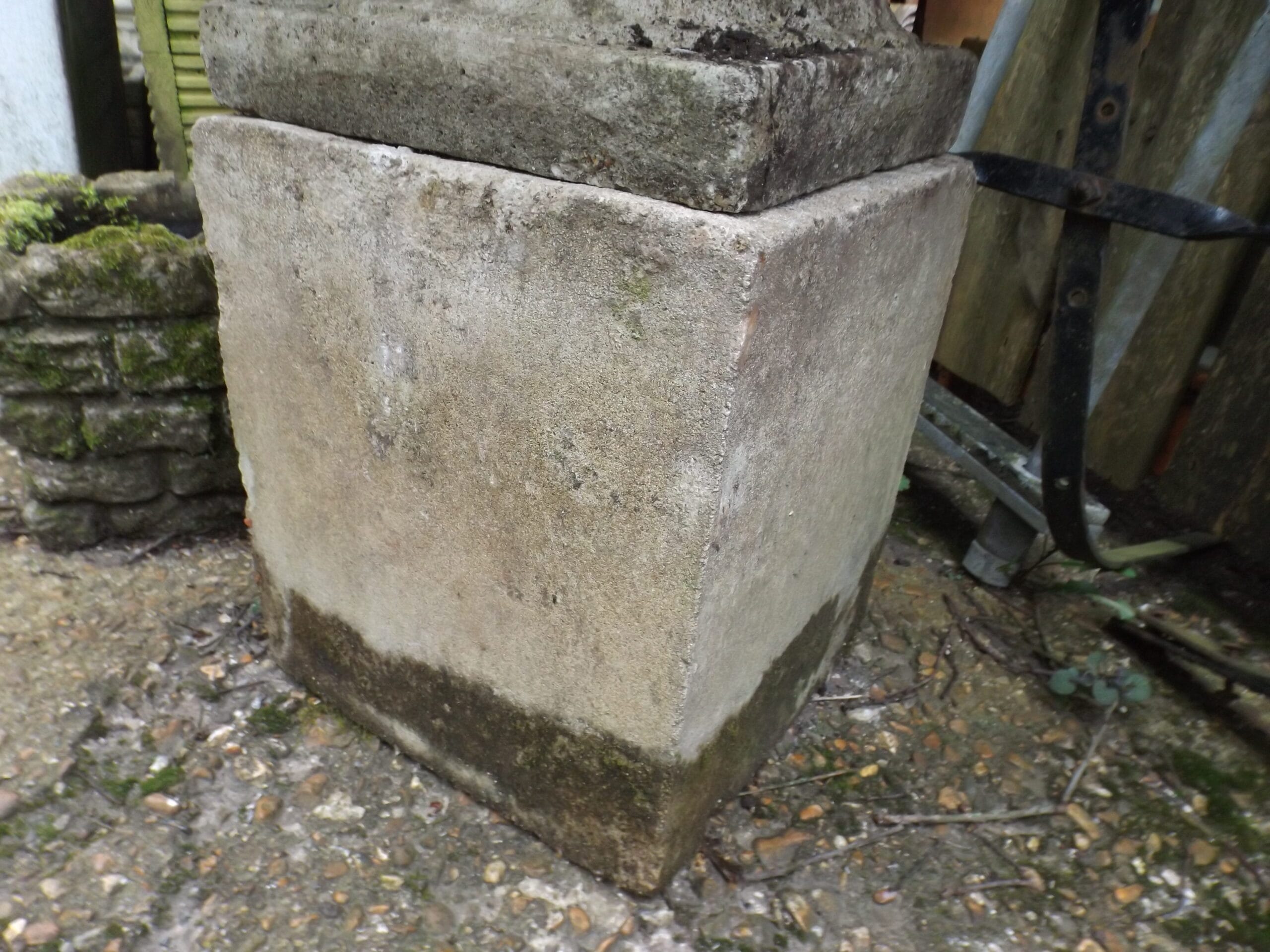 A simple stone plinth with some mosses around the base. Heavy and stable and suitable for weighty urns or statues.