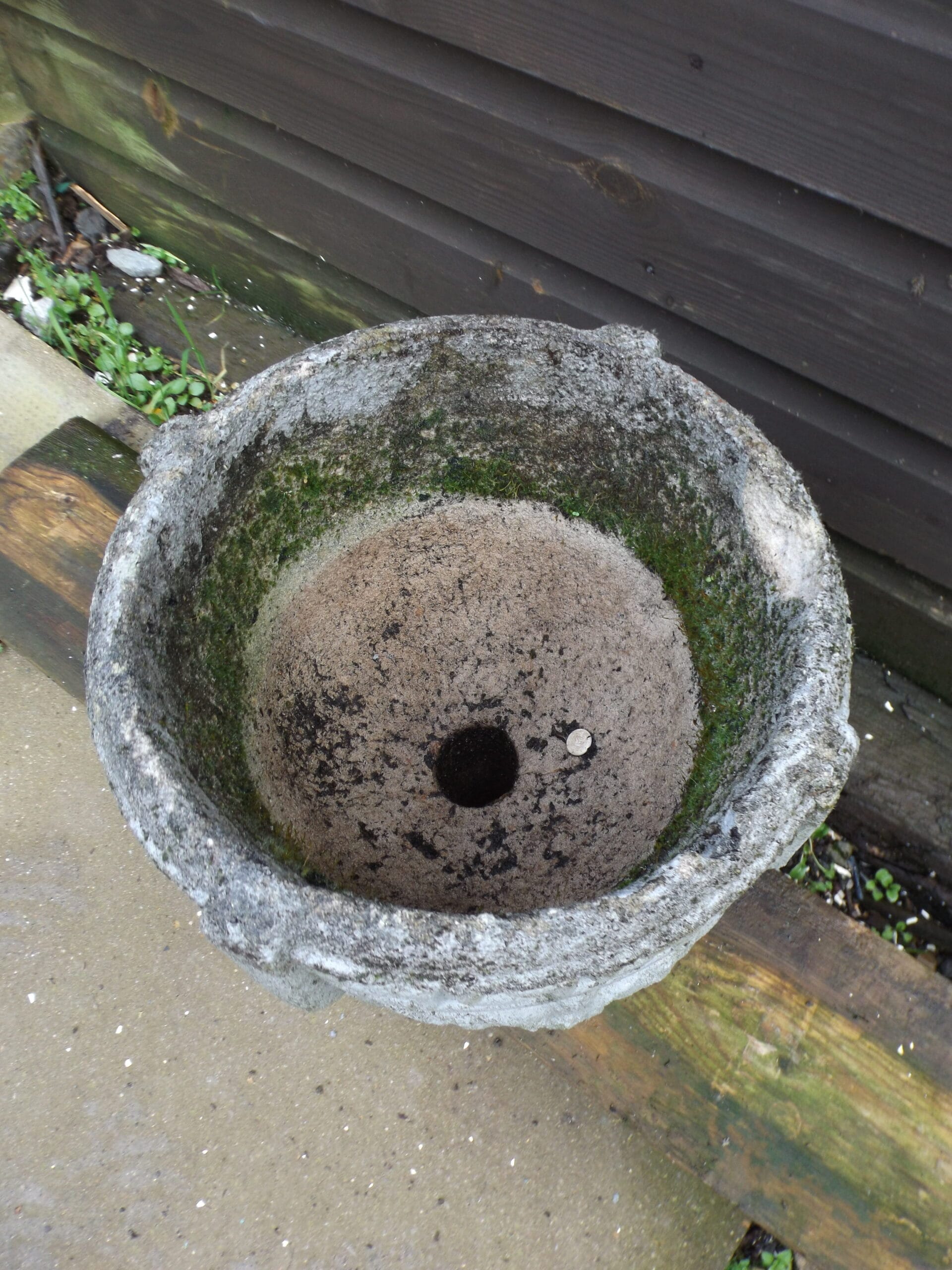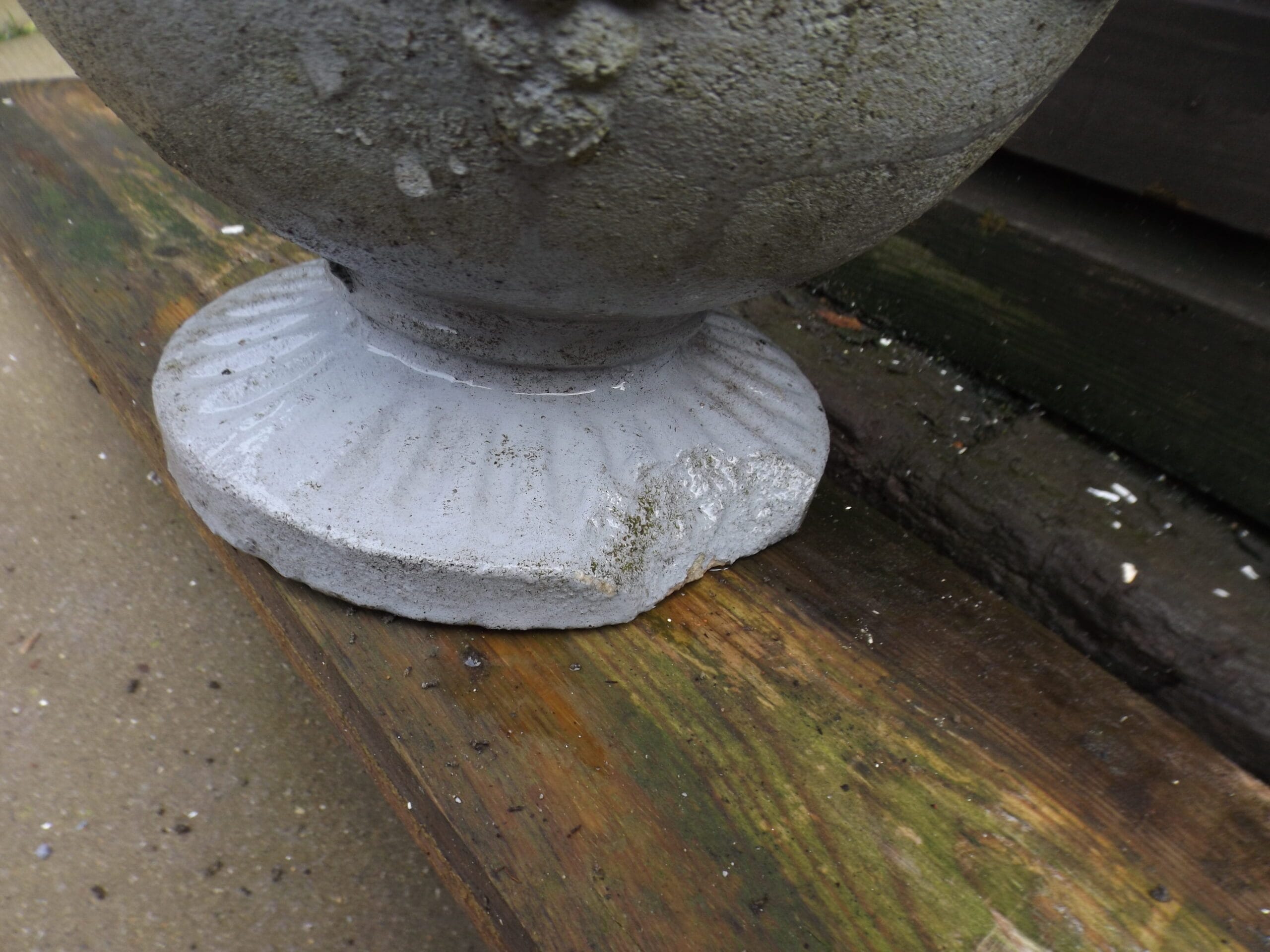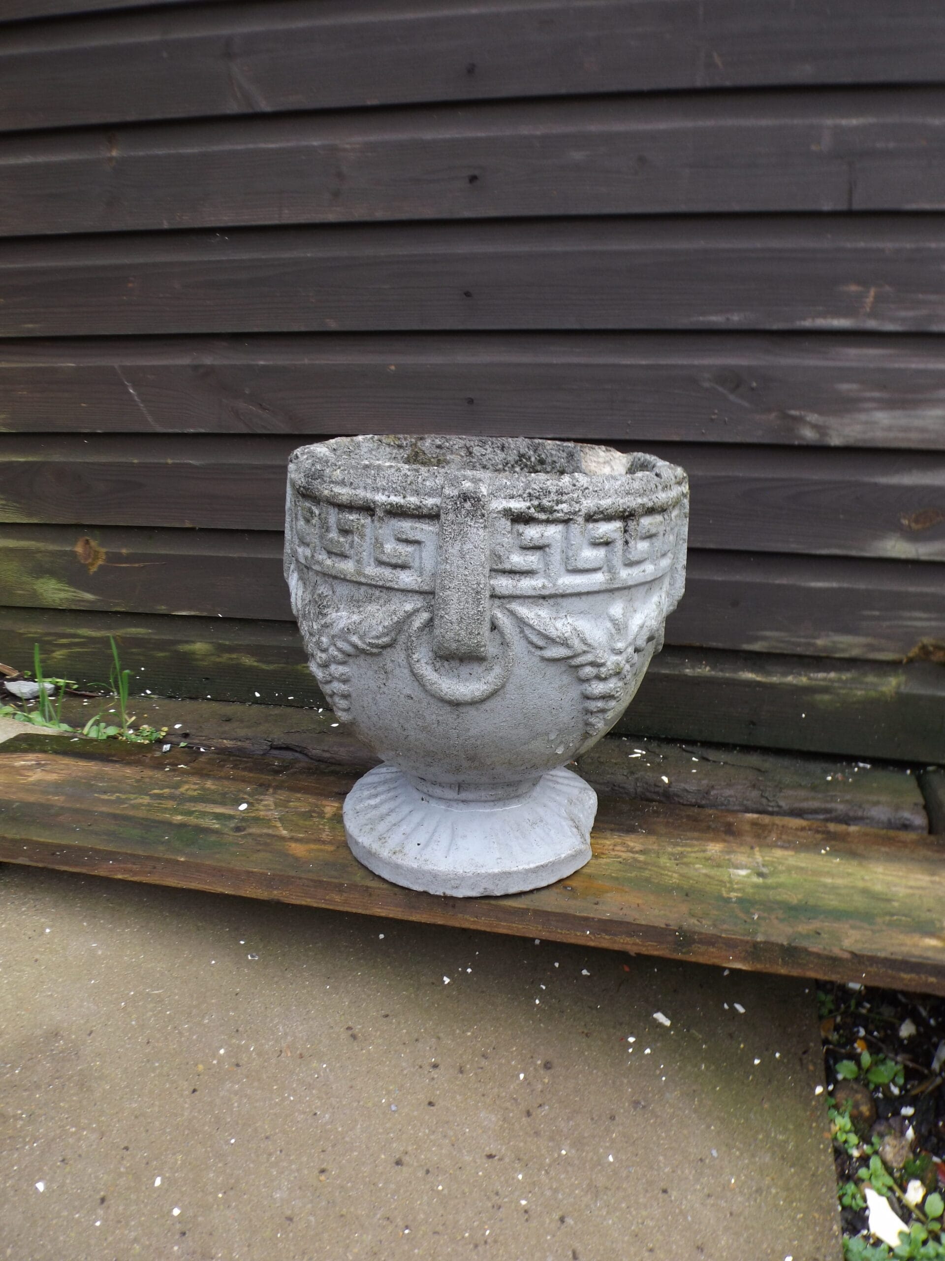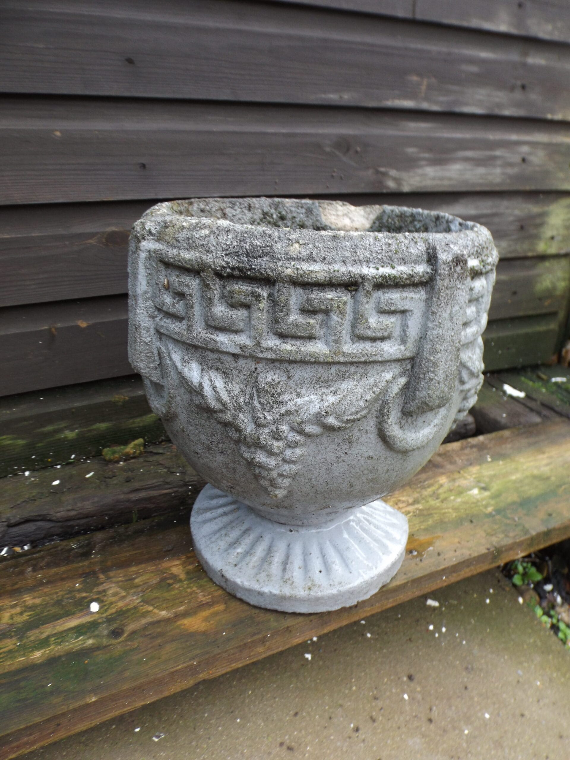 A small Greek key garden urn, painted in worn grey paint. Reconstituted stone with a Greek key band around the top and swags with hanging grapes. Some chipping around the top rim and an historic chip to the base which has been painted over.