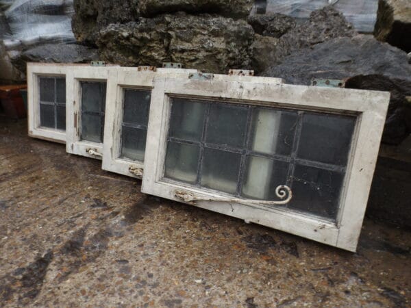 We have twelve of these small leaded toplights, four with restorable hinges and casement stays.  All in good solid condition although a few broken panes, please see below for details.