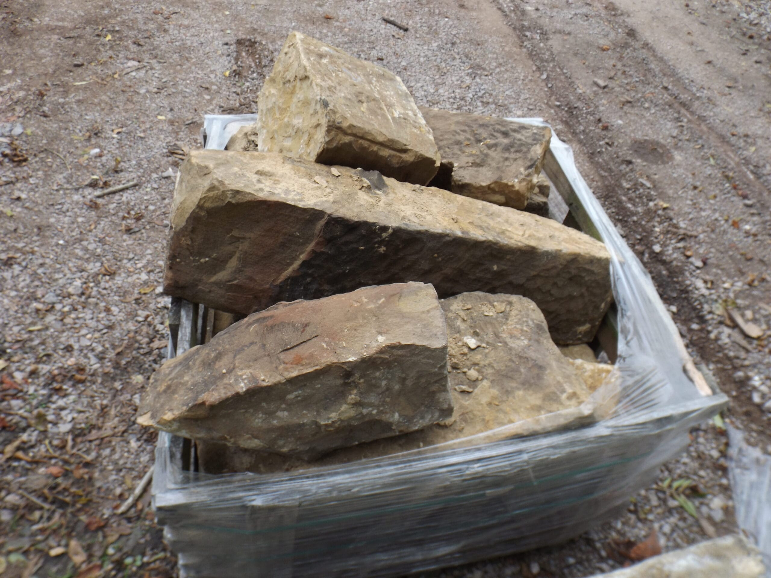 A batch of lovely weathered and dressed dark honey coloured Sussex sandstone walling. In a random size mix but including some substantial pieces.