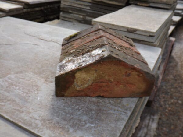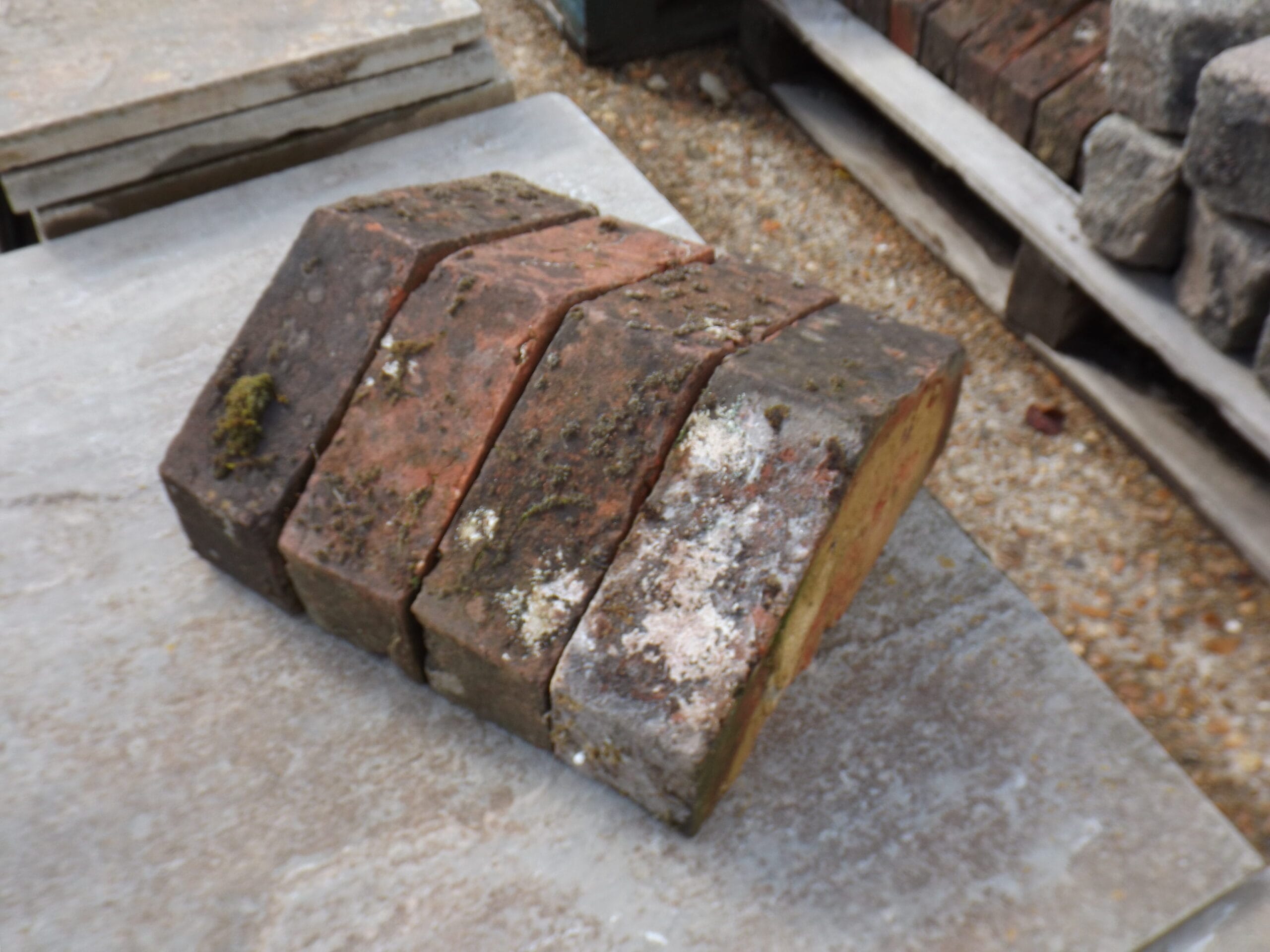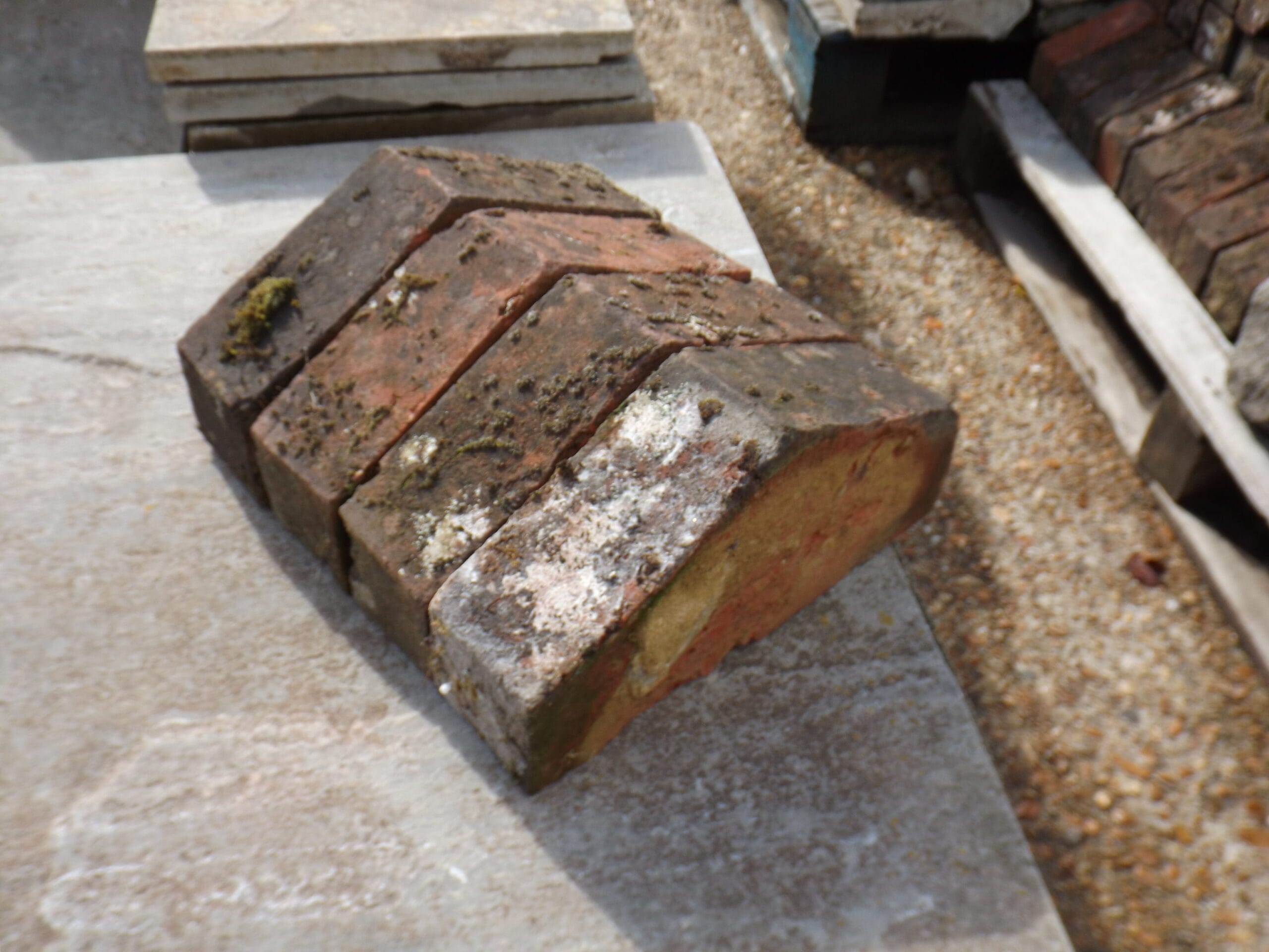 A nice batch of red kiln triangular coping bricks. Beautifully weathered with plenty of moss and lichen and very visually appealing.