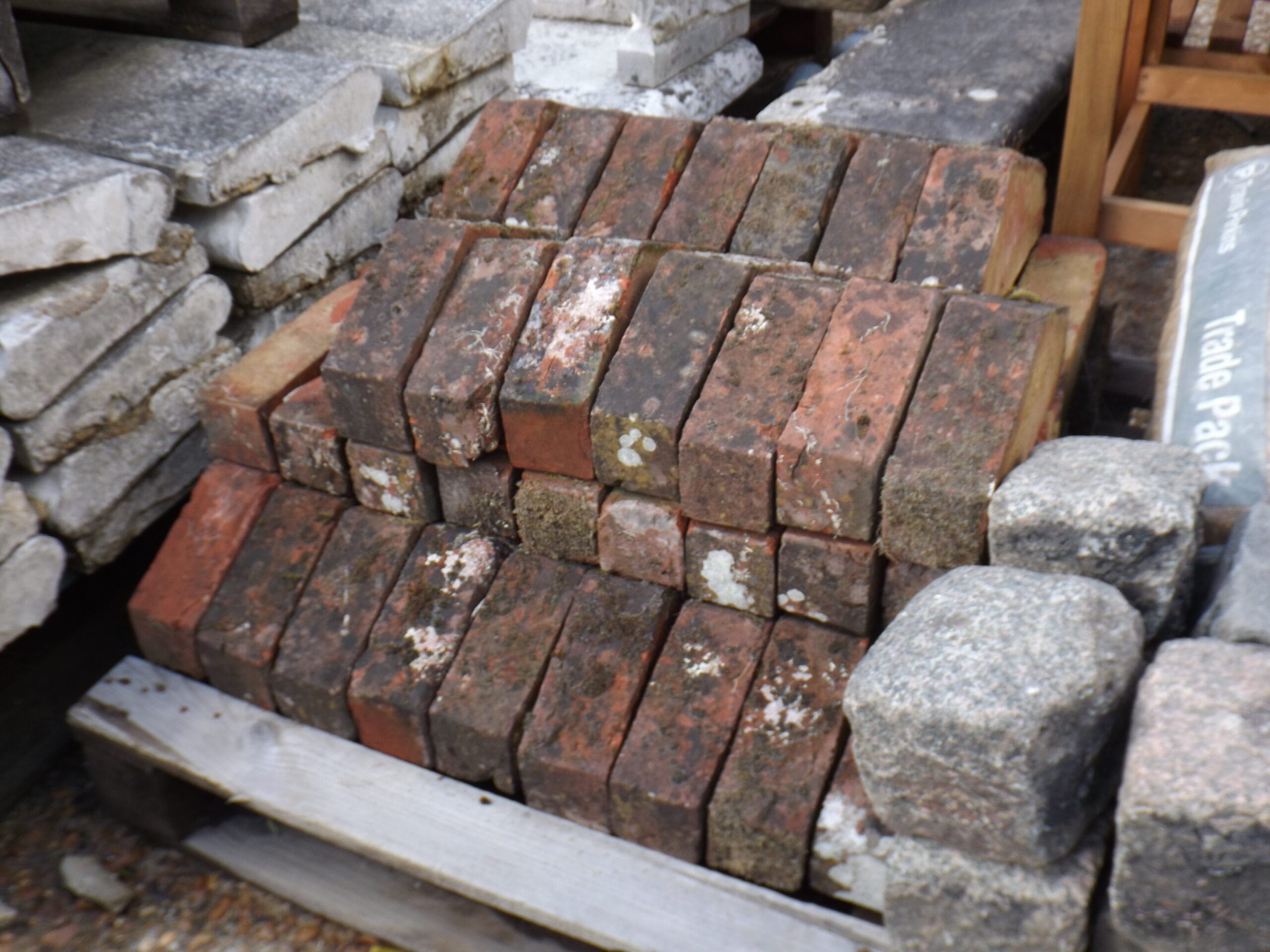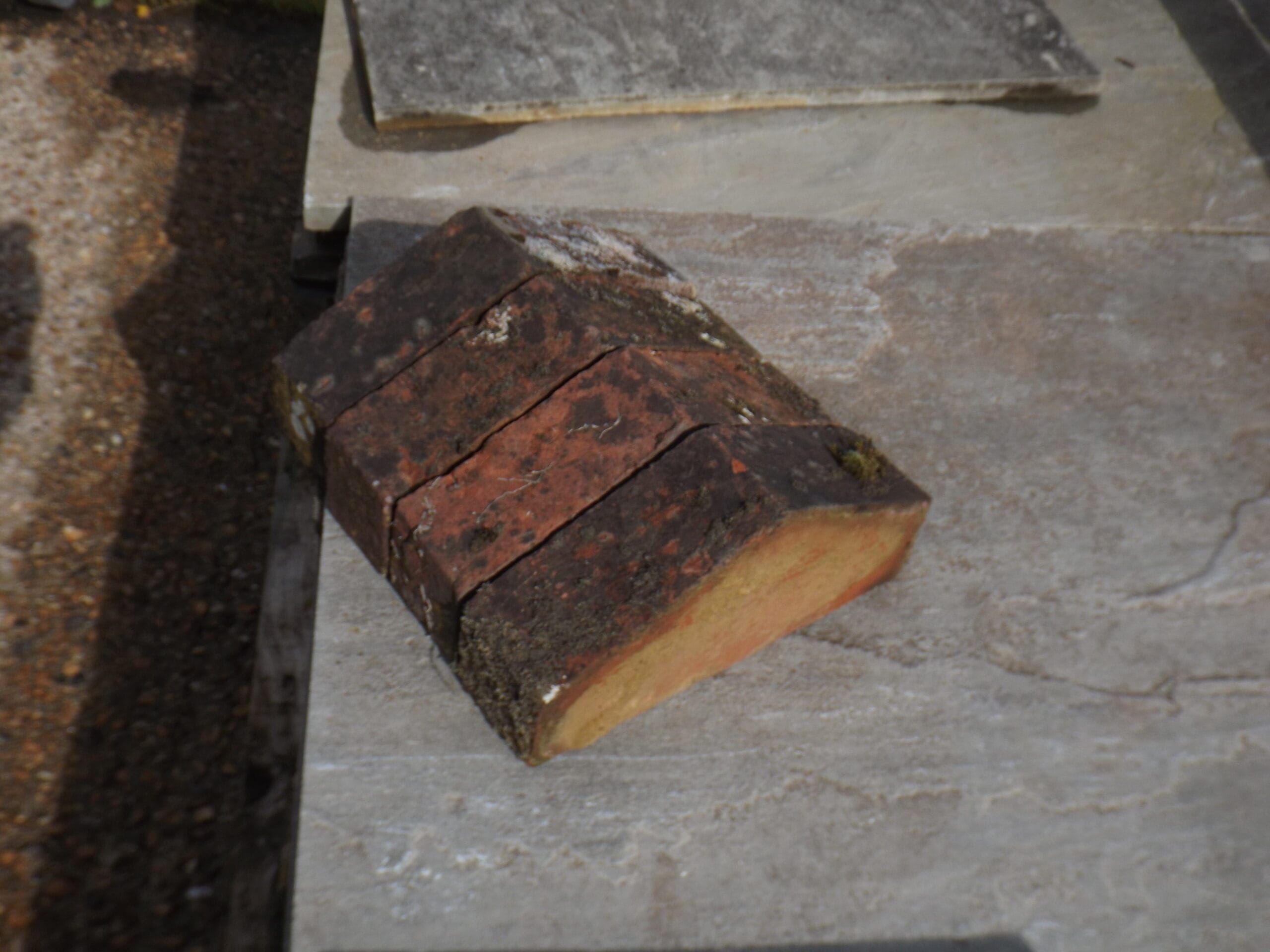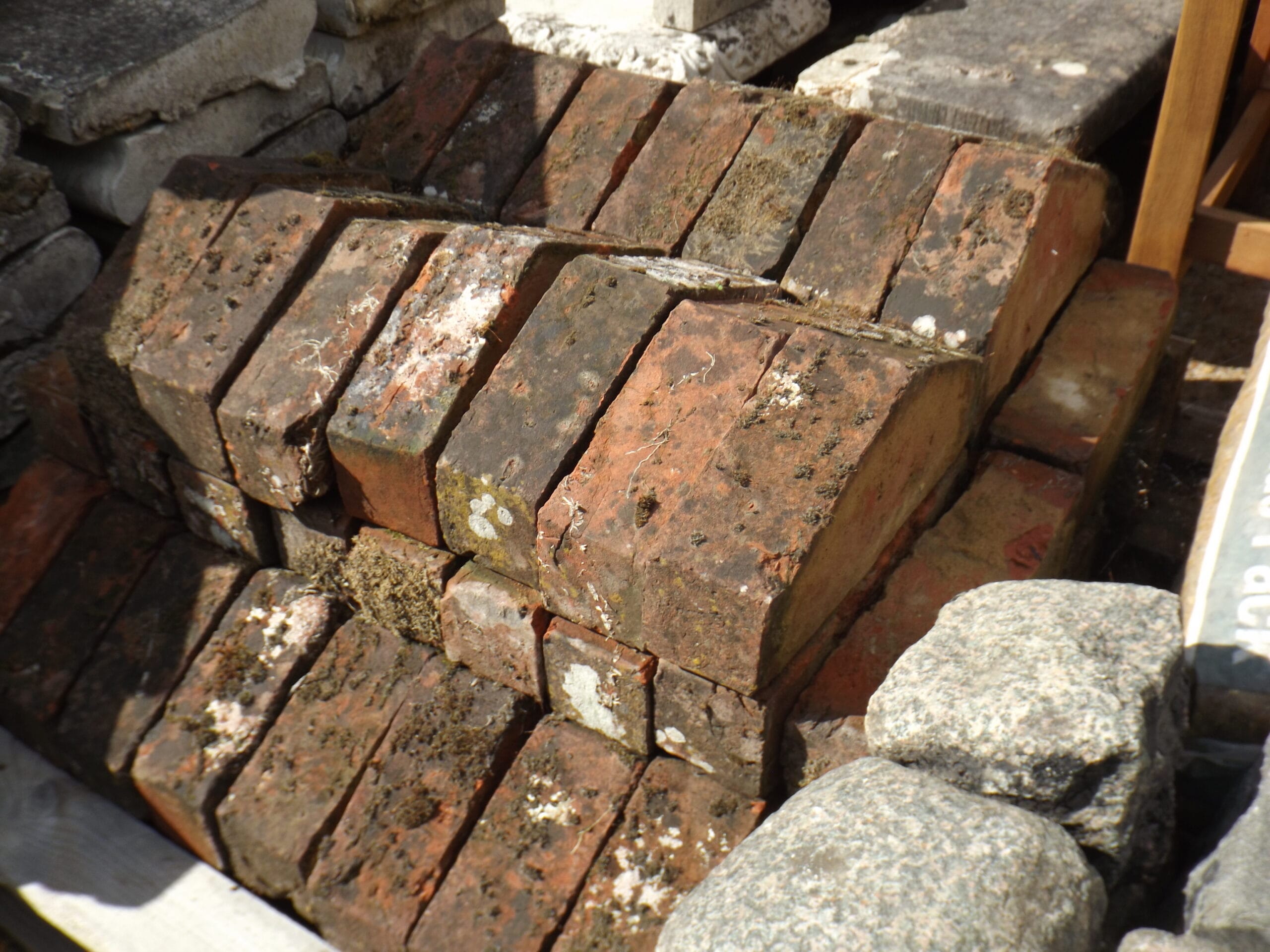 A nice batch of red kiln triangular coping bricks. Beautifully weathered with plenty of moss and lichen and very visually appealing.