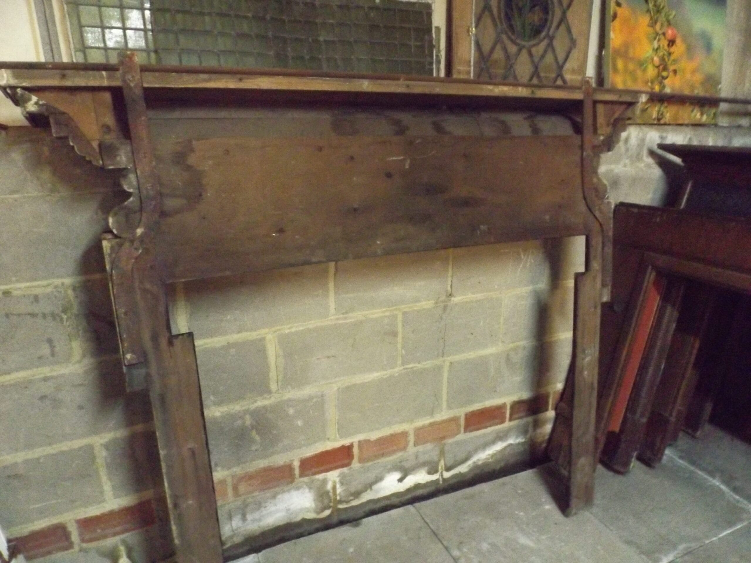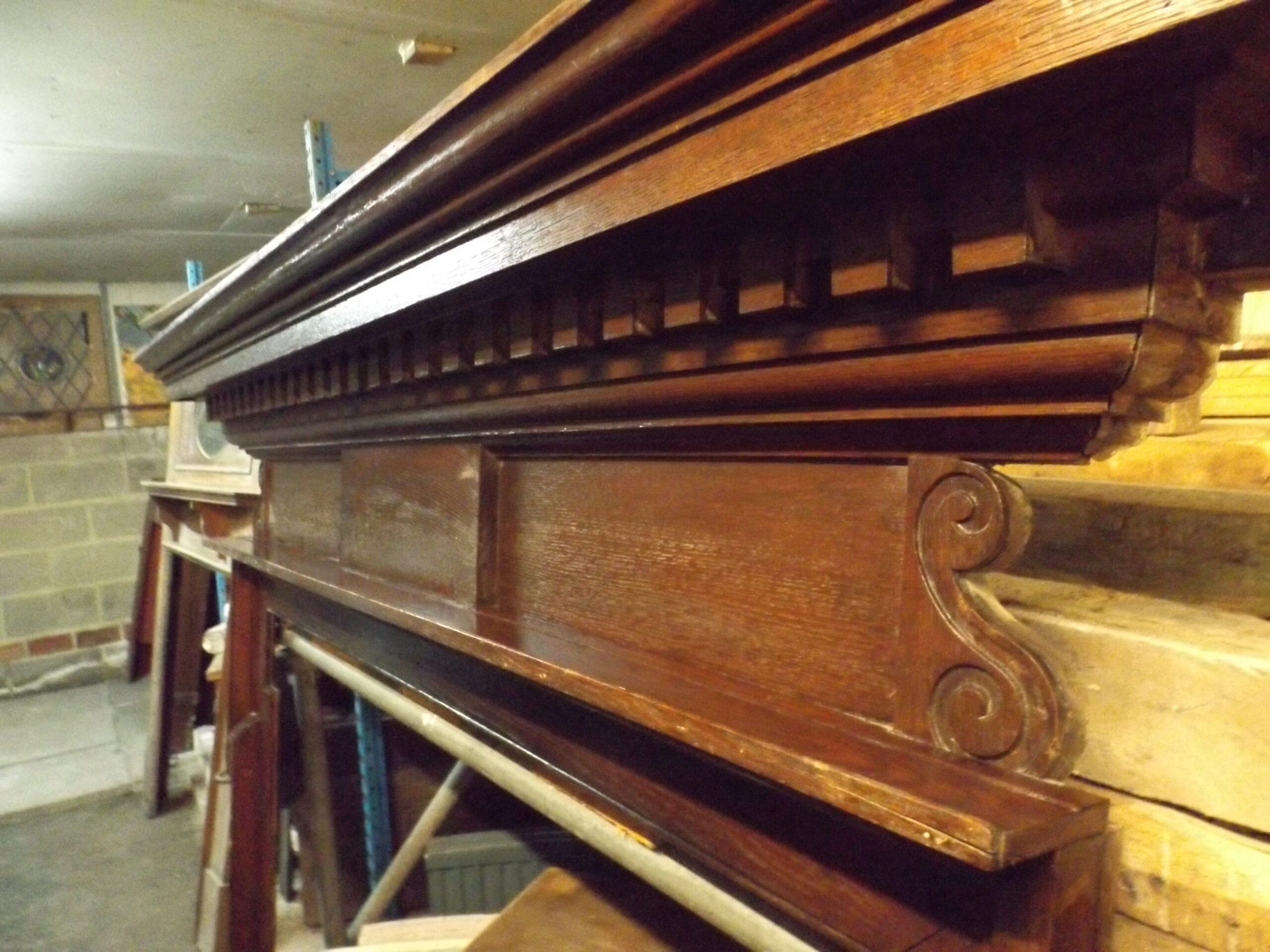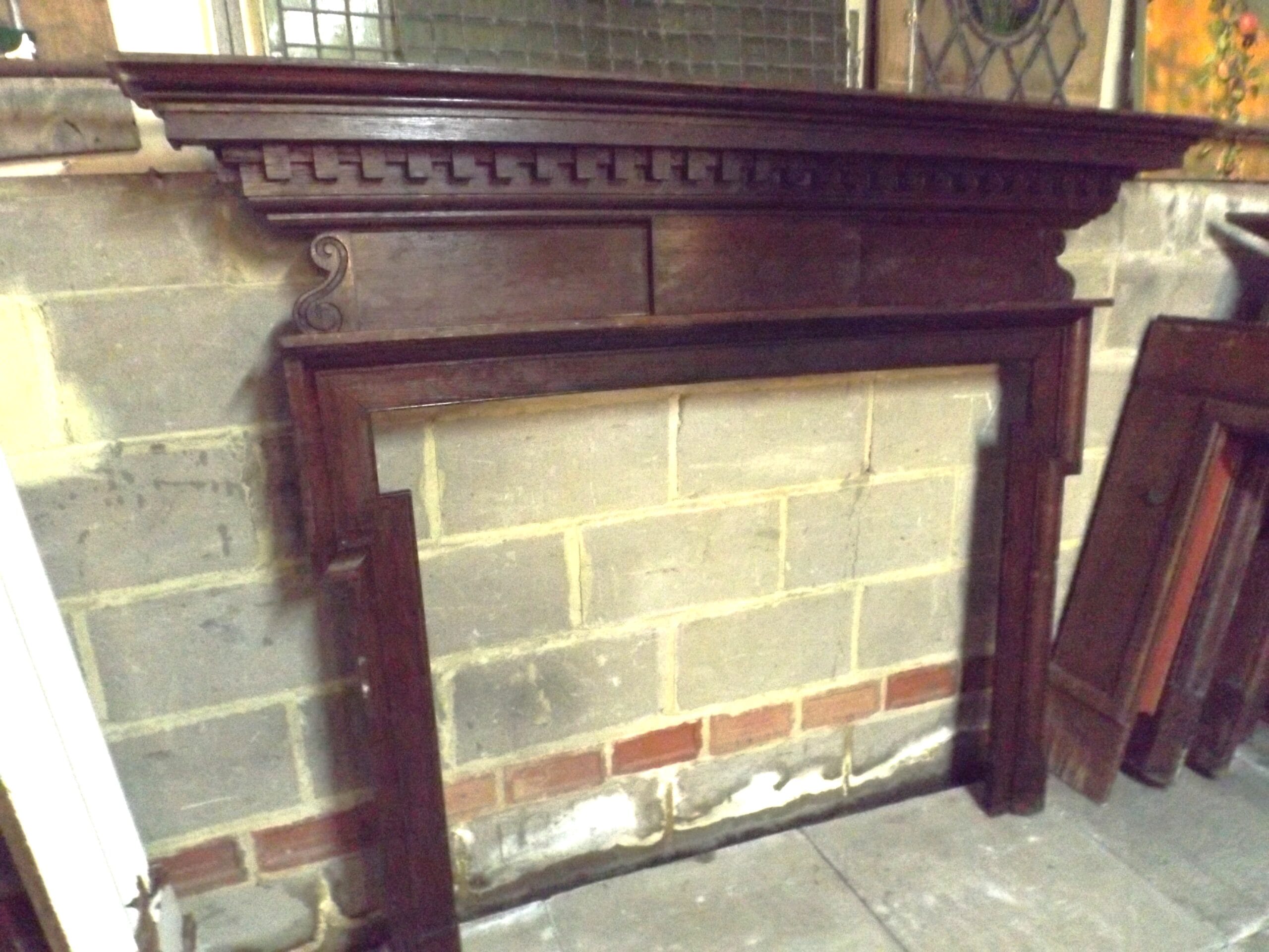 A Victorian oak chimney piece with a simple centre panel and slim dog leg profile jambs, which would have been lined with marble strips.  A substantial mantel with dentil moulding below, scroll detail at the ends of the frieze and a narrow shelf below which is a later addition.  In good solid ex-site condition and with two cast iron ties at the rear for support and to fix to the wall.