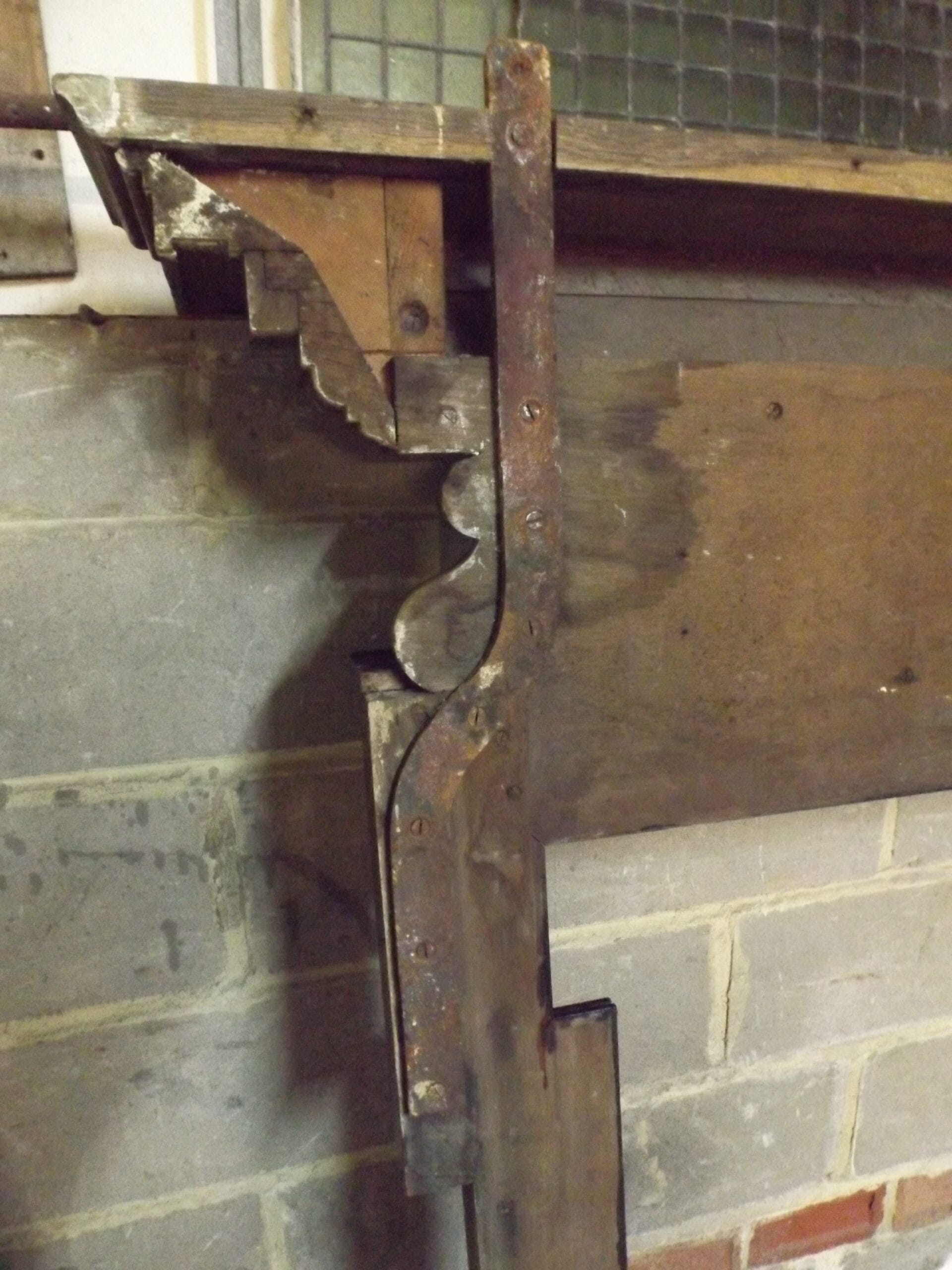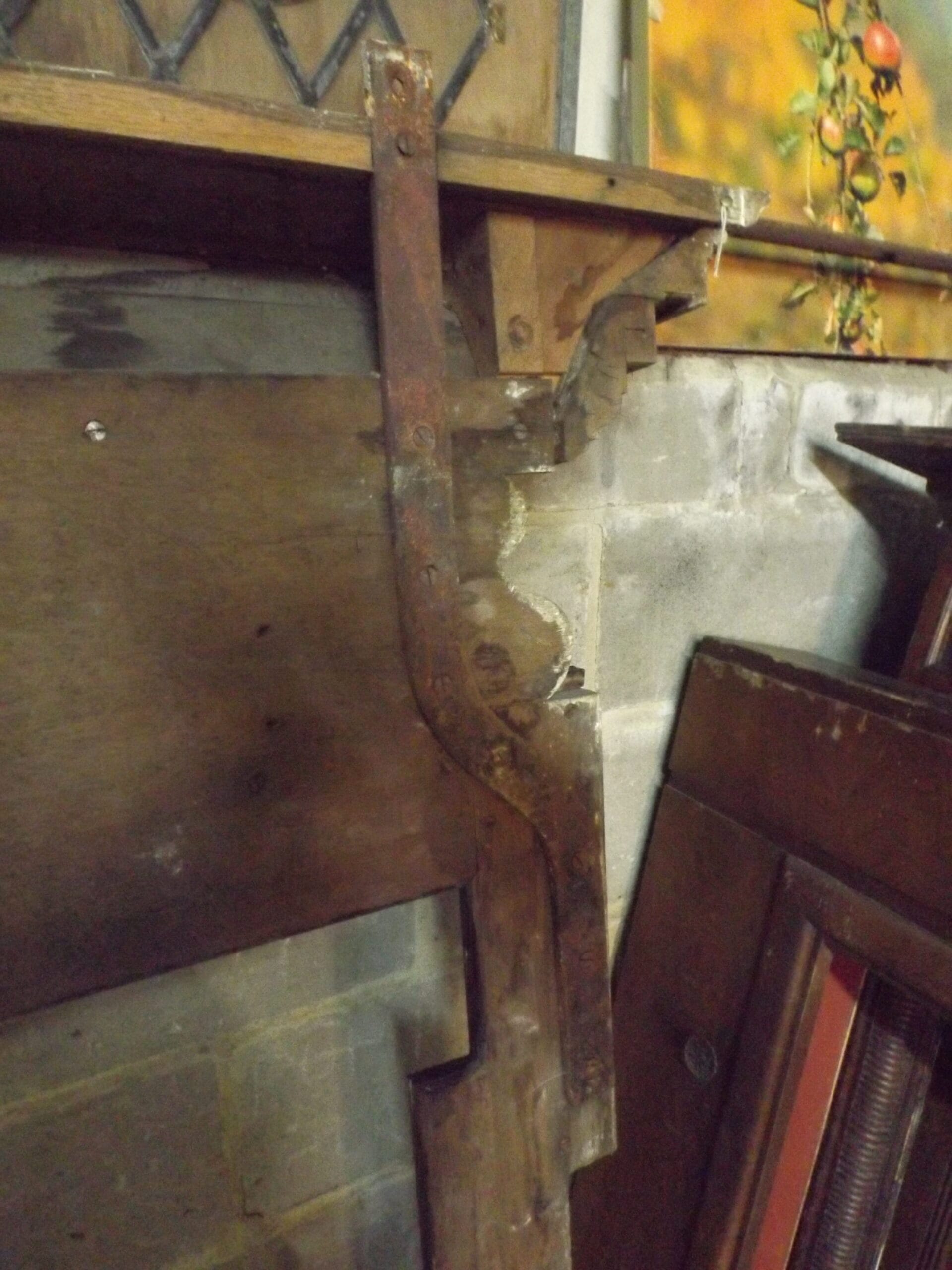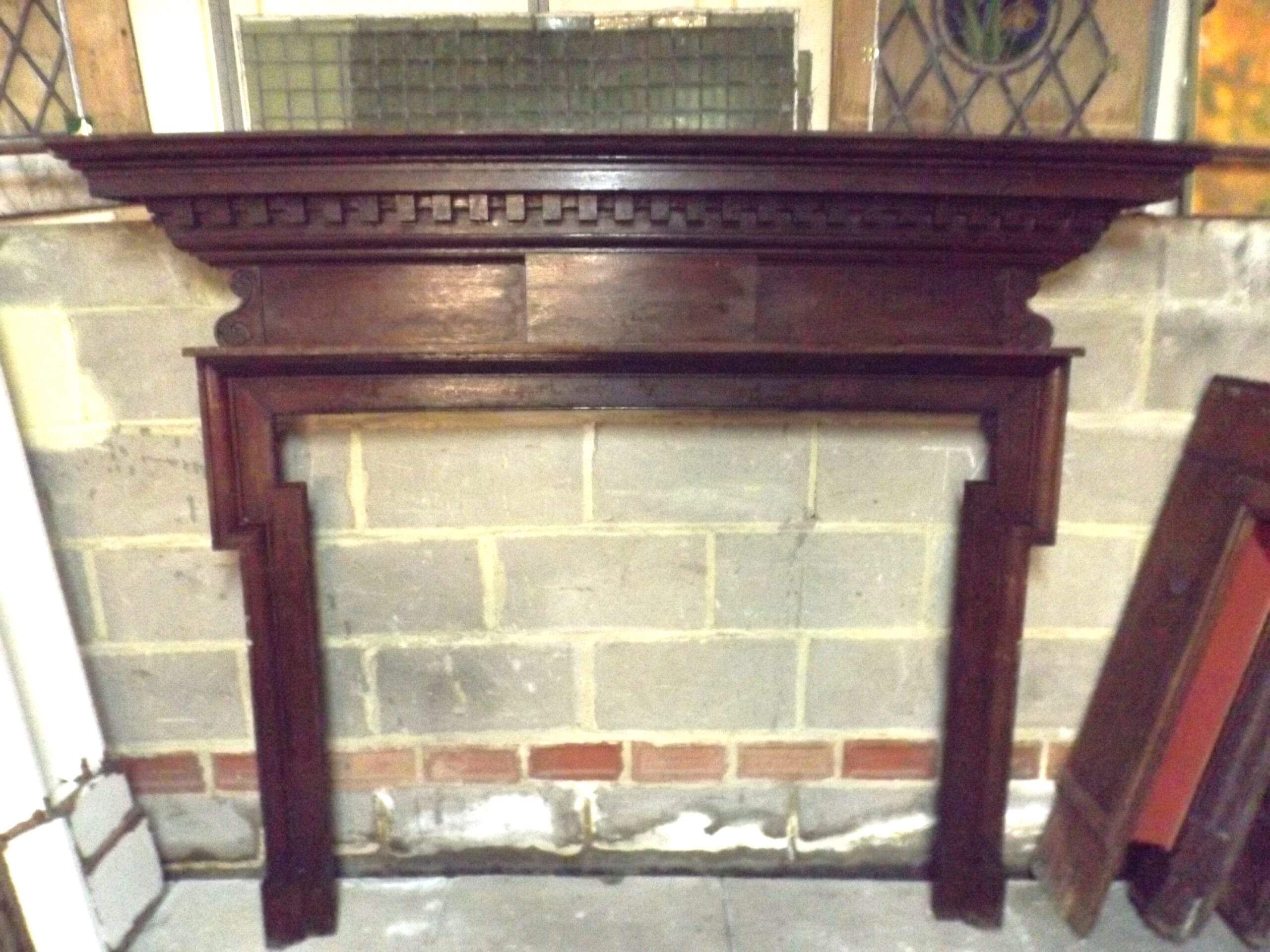 A Victorian oak chimney piece with a simple centre panel and slim dog leg profile jambs, which would have been lined with marble strips.  A substantial mantel with dentil moulding below, scroll detail at the ends of the frieze and a narrow shelf below which is a later addition.  In good solid ex-site condition and with two cast iron ties at the rear for support and to fix to the wall.