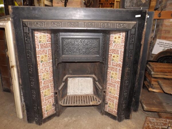 We have this Victorian tiled fire insert circa 1880’s. Complete with original T R Boote transfer printed tiles consisting of a border of four rectangular panels containing aesthetic designs in maroon red and a centre panel of yellow pansies. All tiles intact.