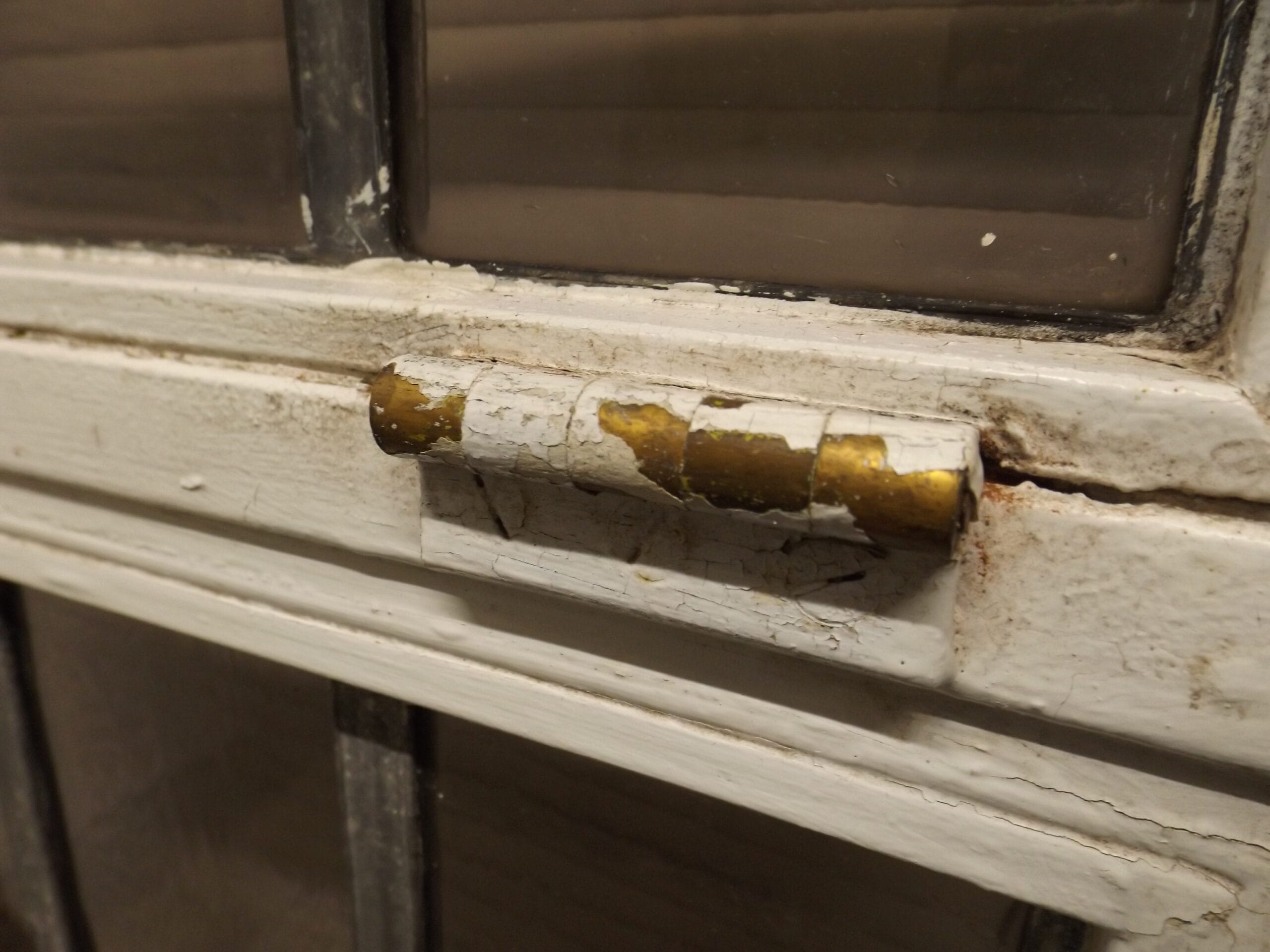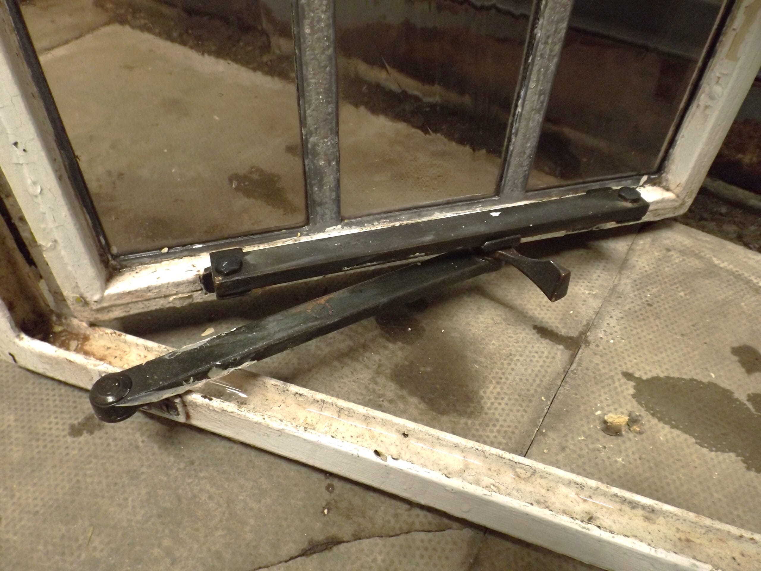 Hopper window (hinged at the bottom) with original fanlight catch. No broken glazing.