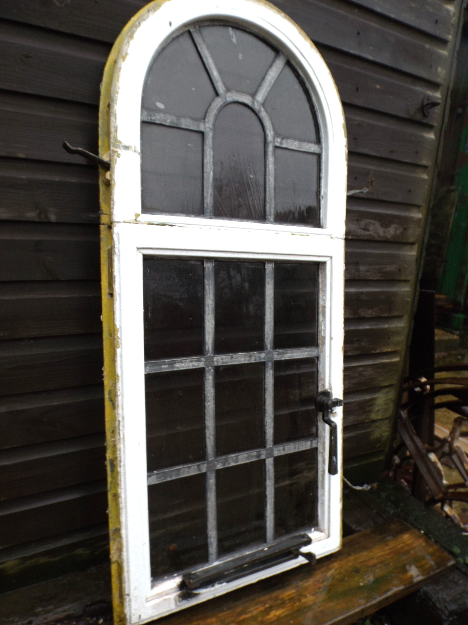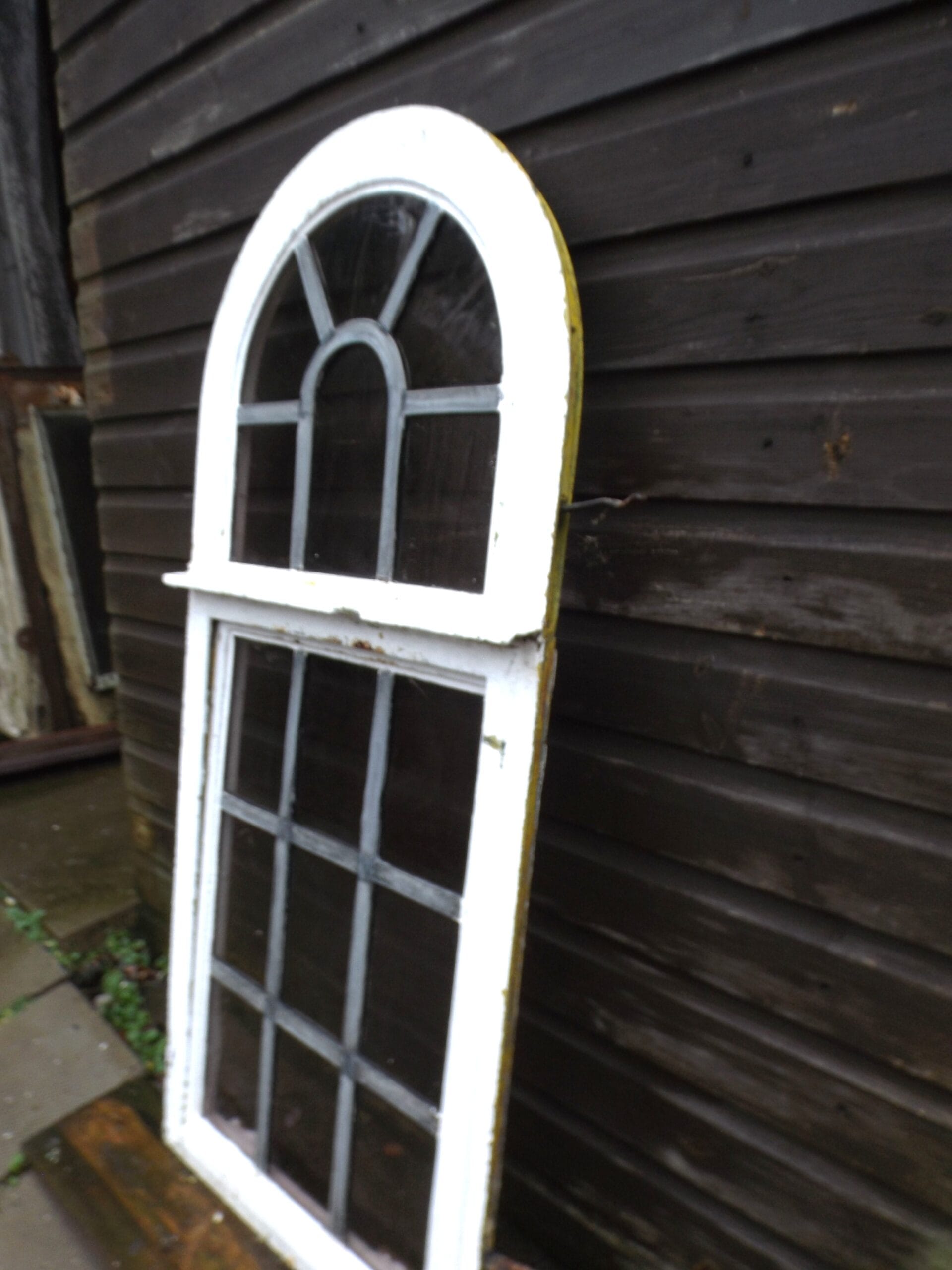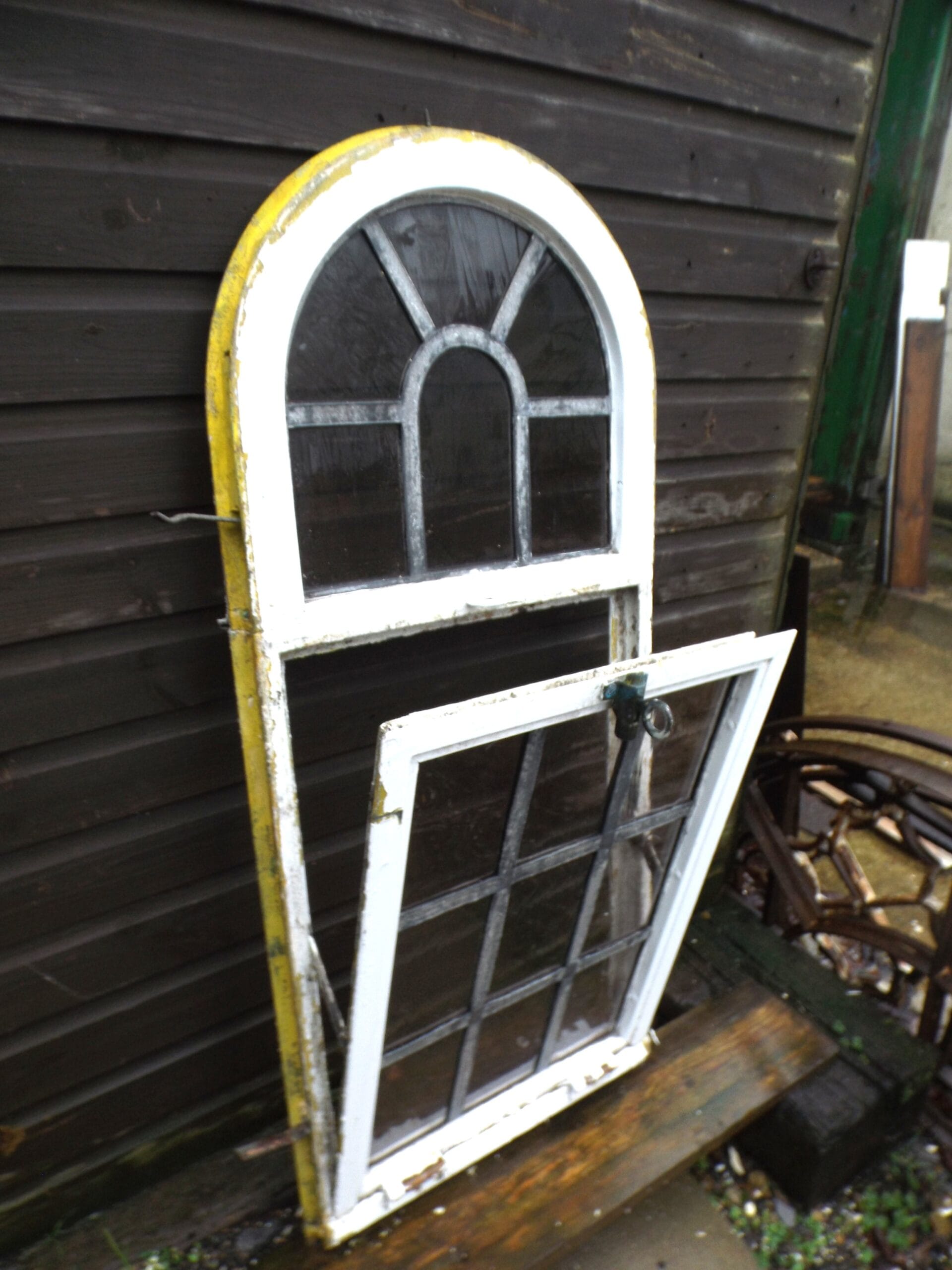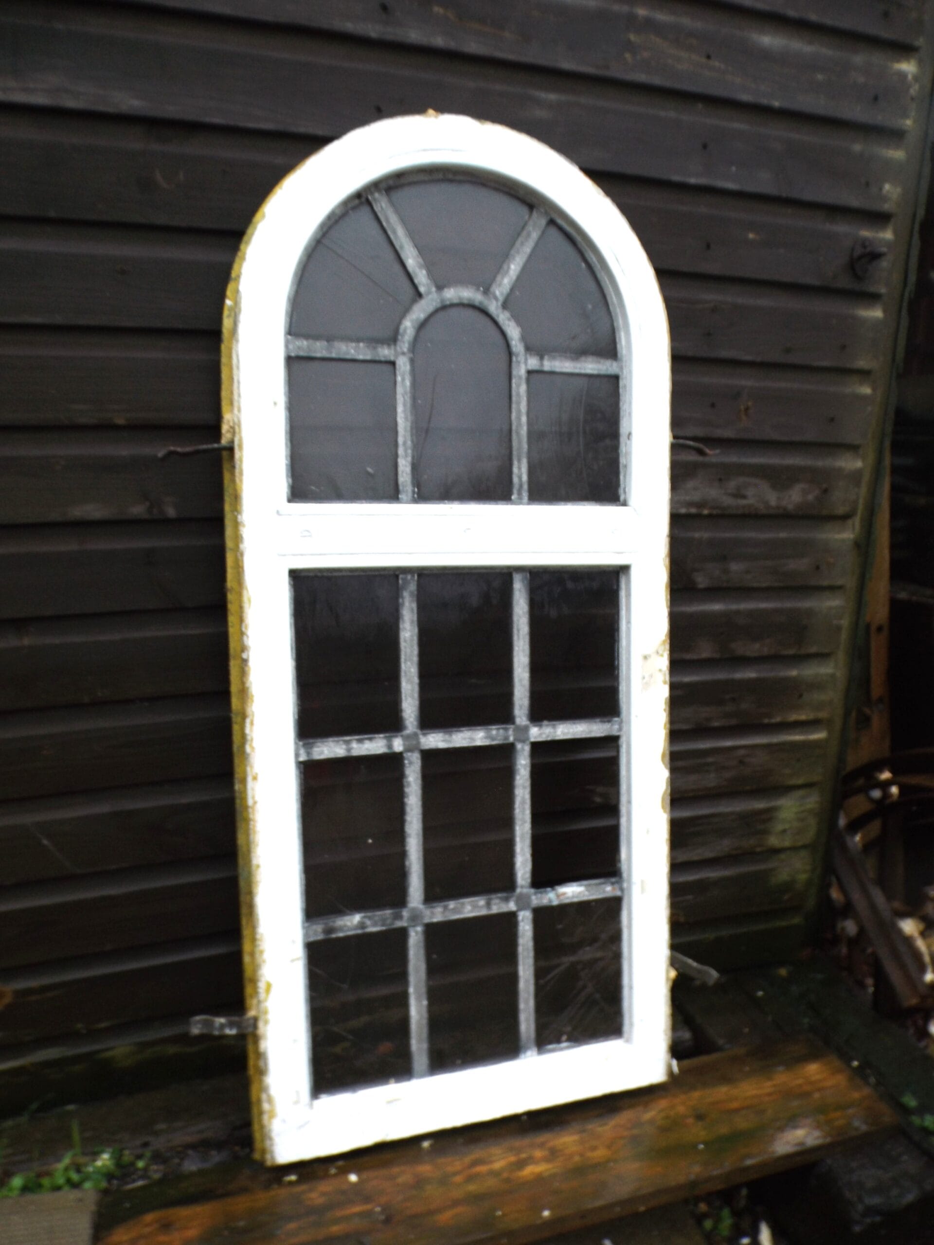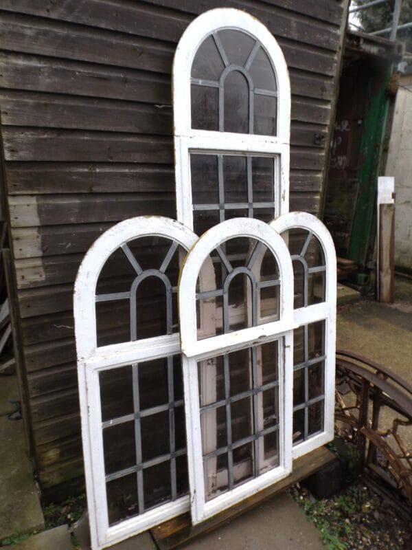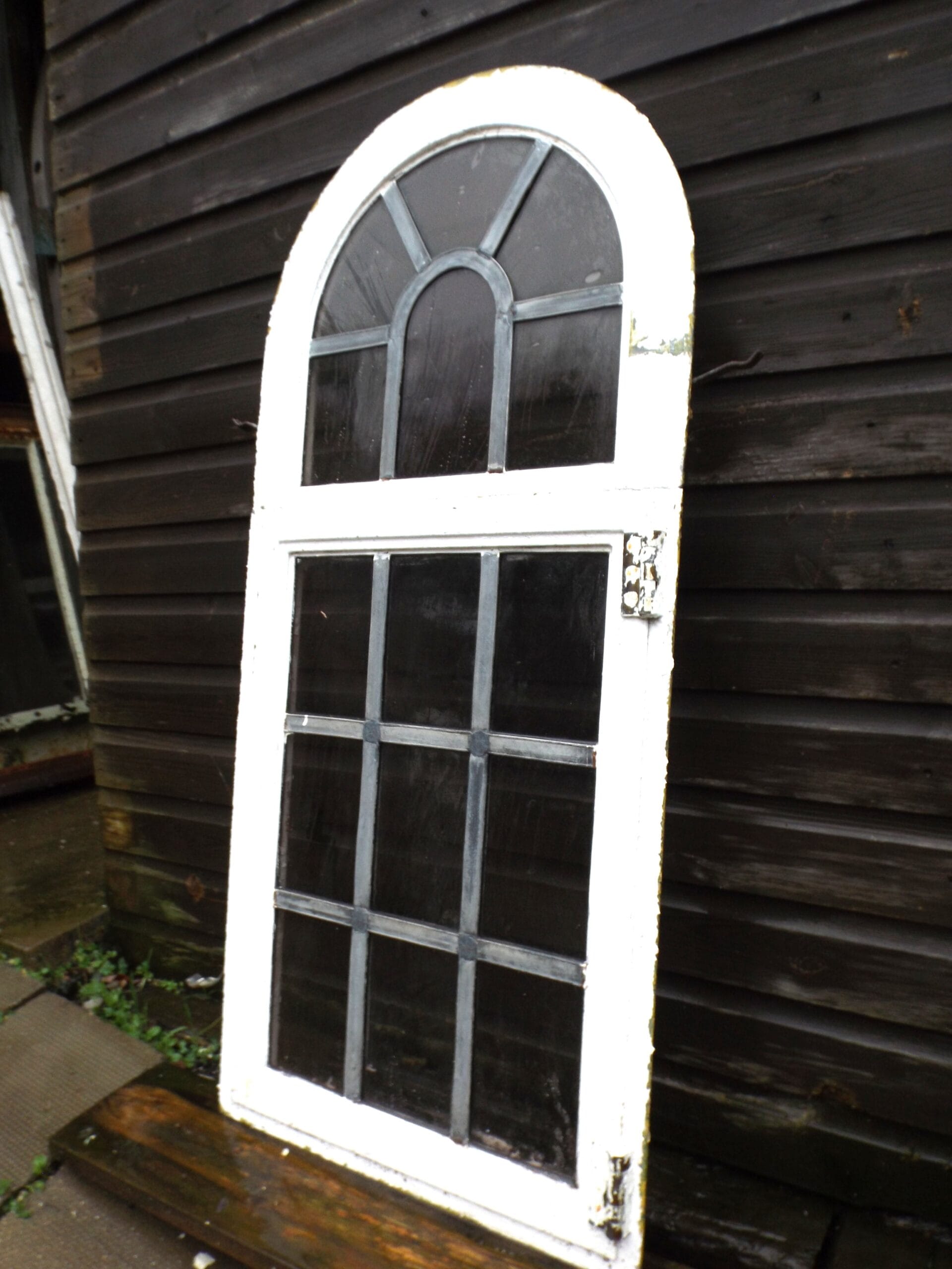 We have four of these splendid vintage arched leaded windows salvaged from the chapel at Moira House Girls School in Eastbourne and dating from the 1950’s. Metal framing with wide leading and smoky pinkish float glass, brass hinges under the paint. In good solid ex-site condition, all hinges a bit stiff.