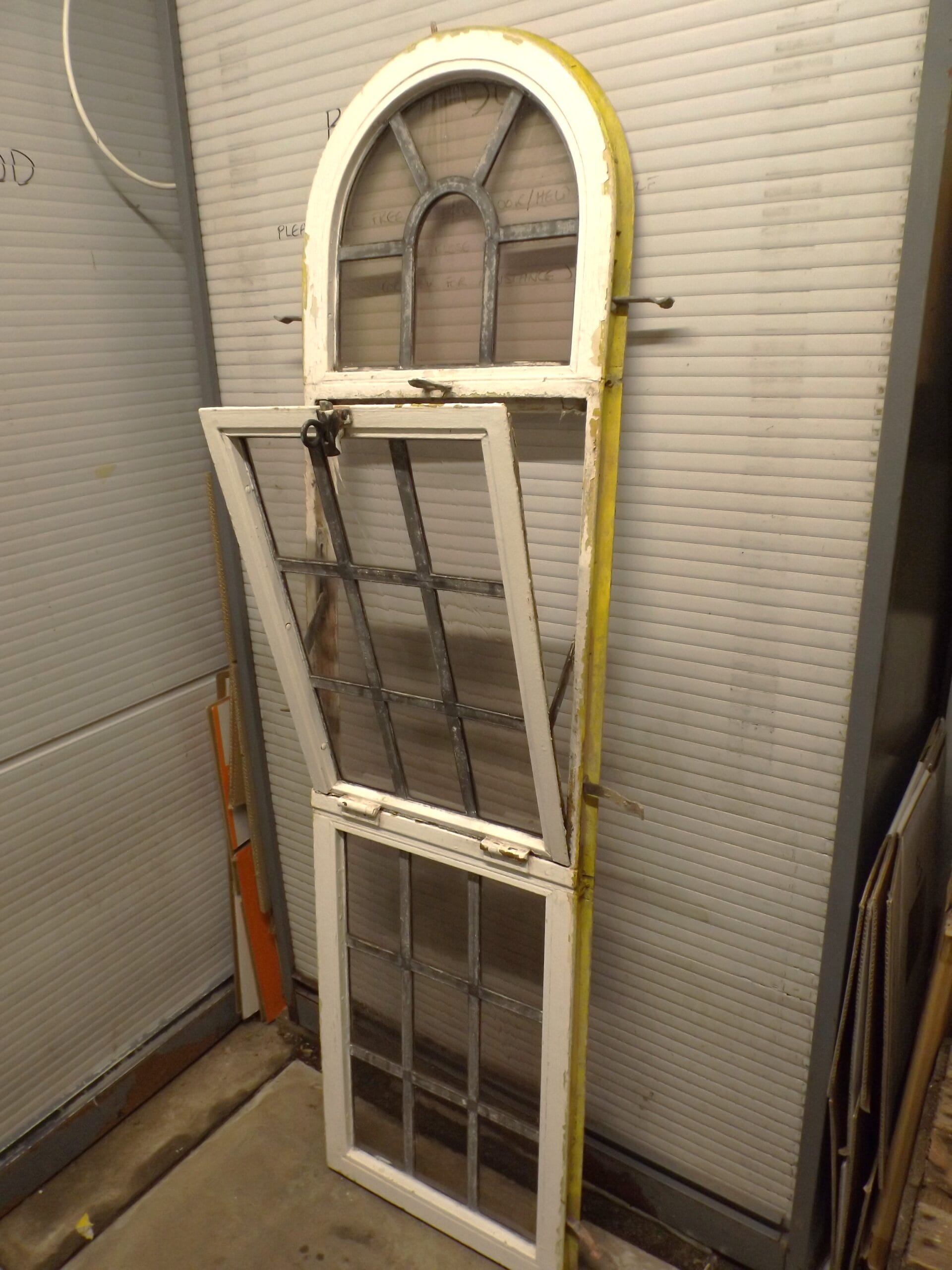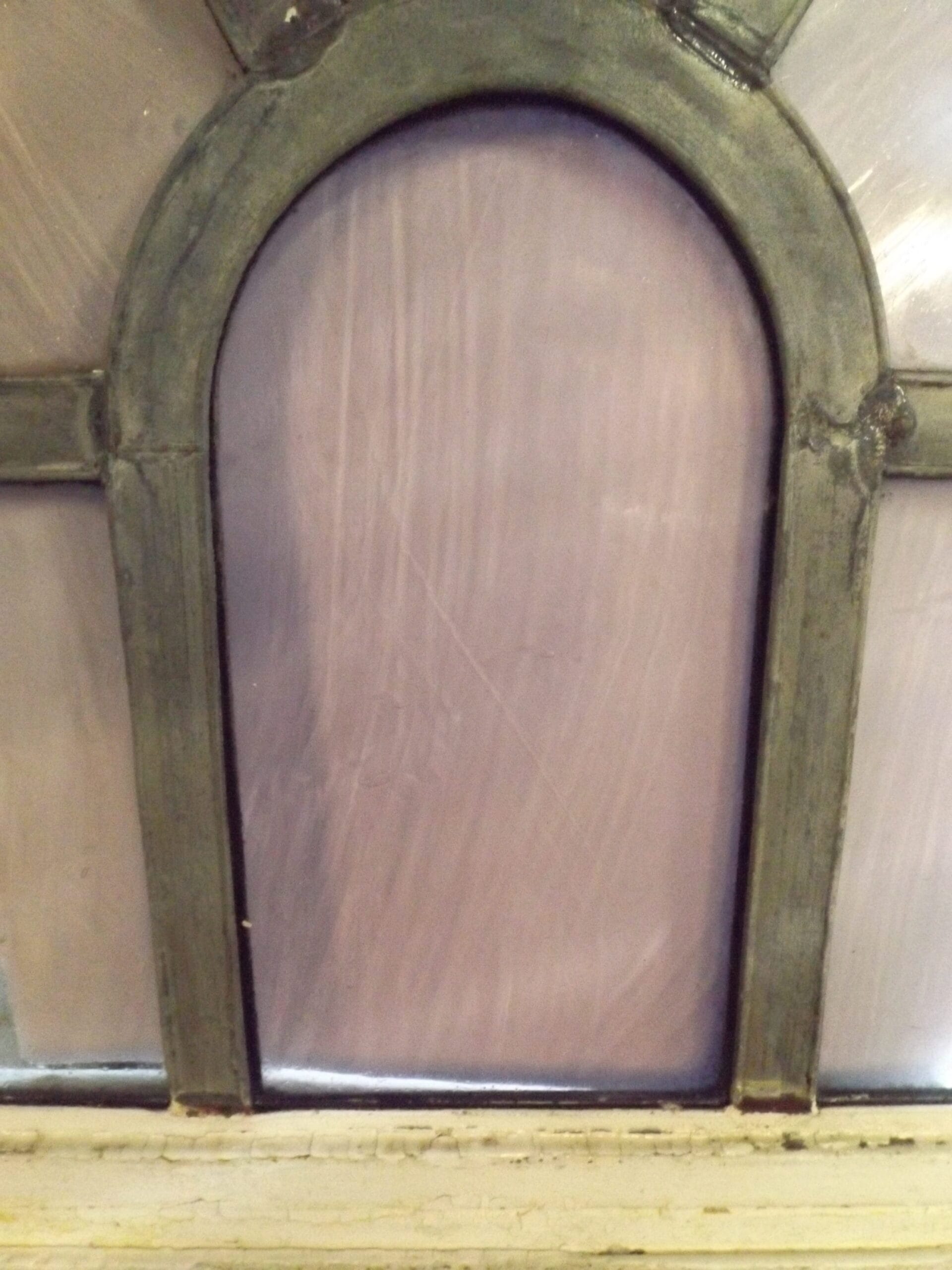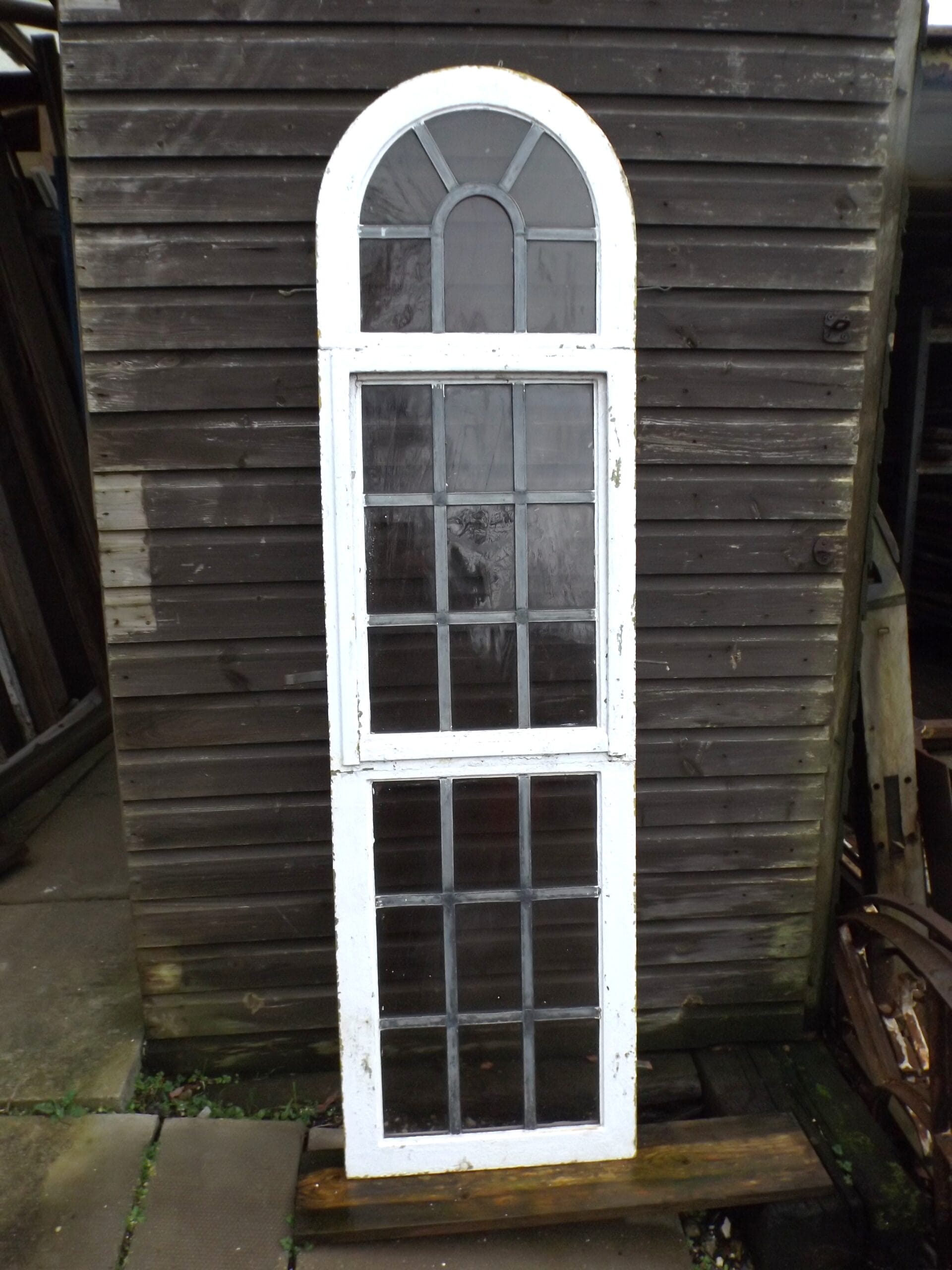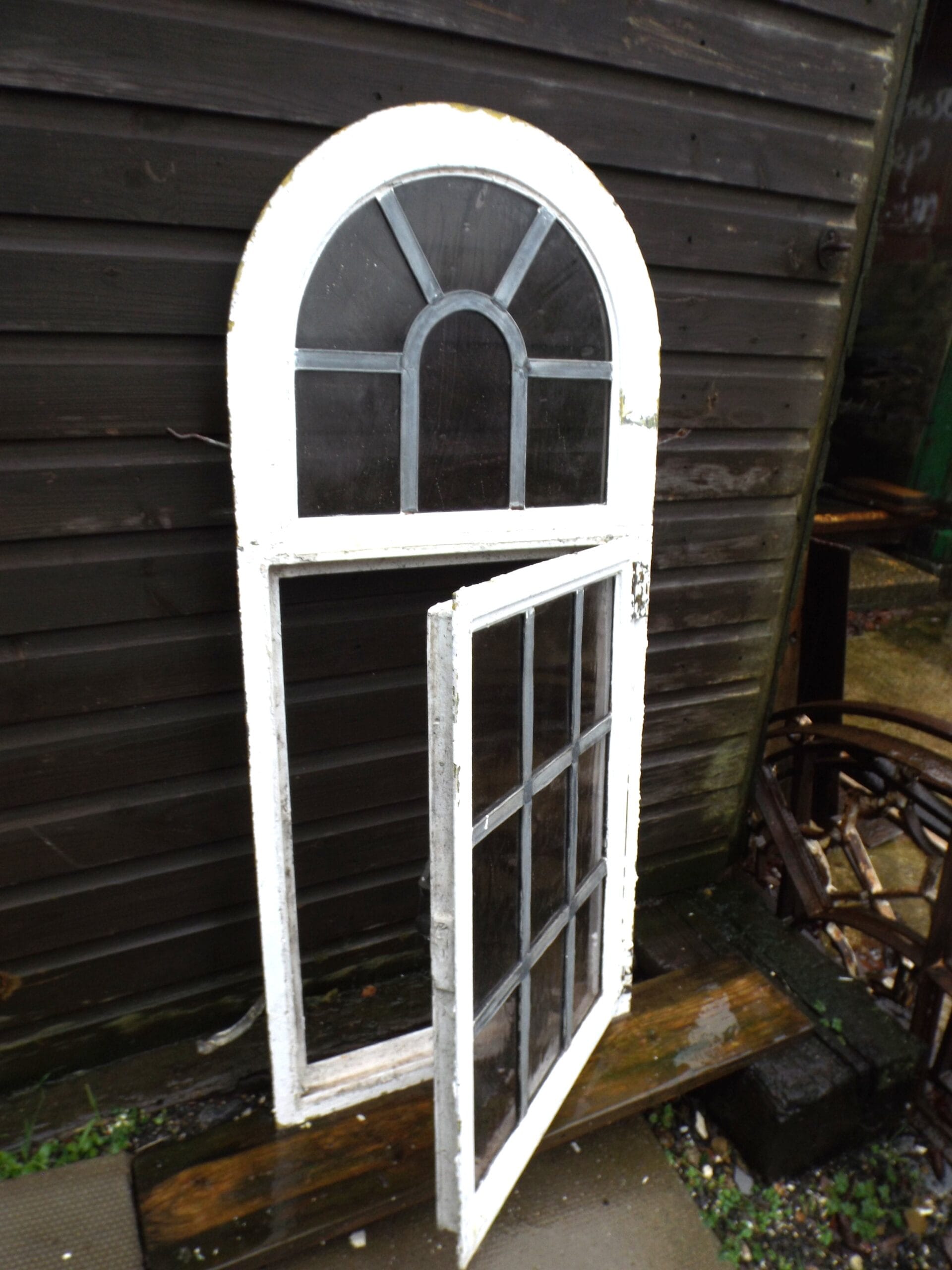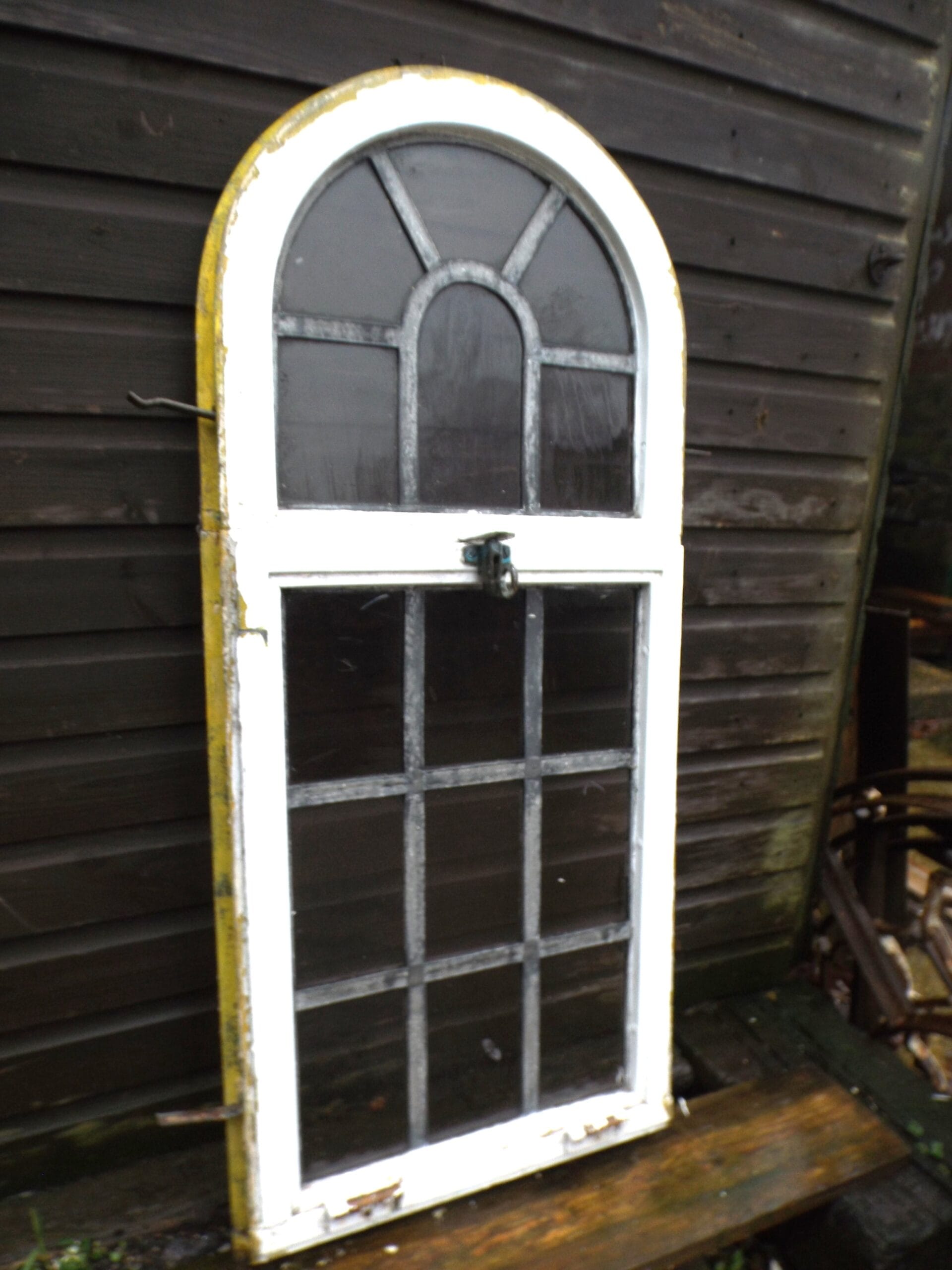We have four of these splendid vintage arched leaded windows salvaged from the chapel at Moira House Girls School in Eastbourne and dating from the 1950’s. Metal framing with wide leading and smoky pinkish float glass, brass hinges under the paint. In good solid ex-site condition, all hinges a bit stiff.