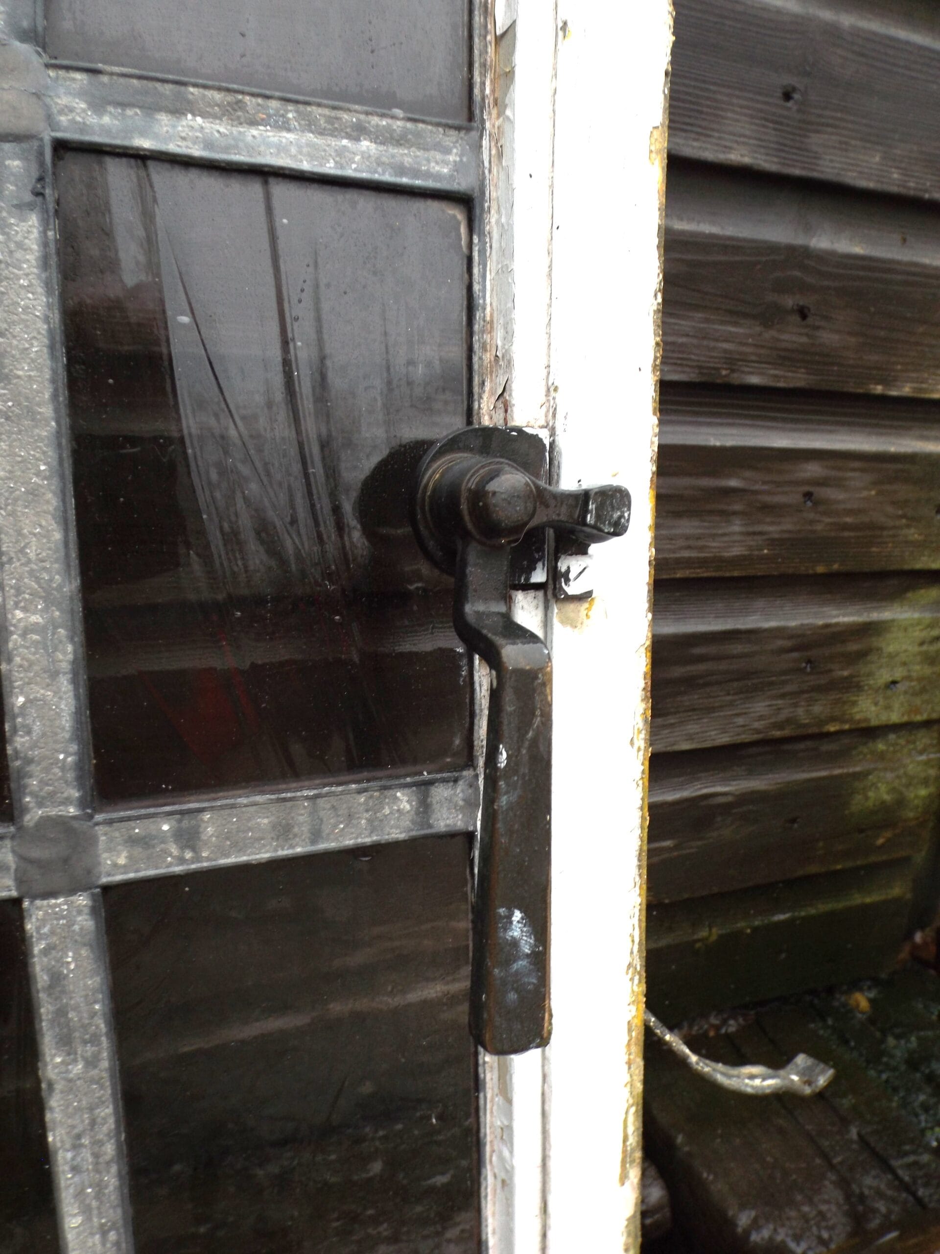 Side hinged casement window with original casement fastener and double arm sliding casement stay. No broken glazing.