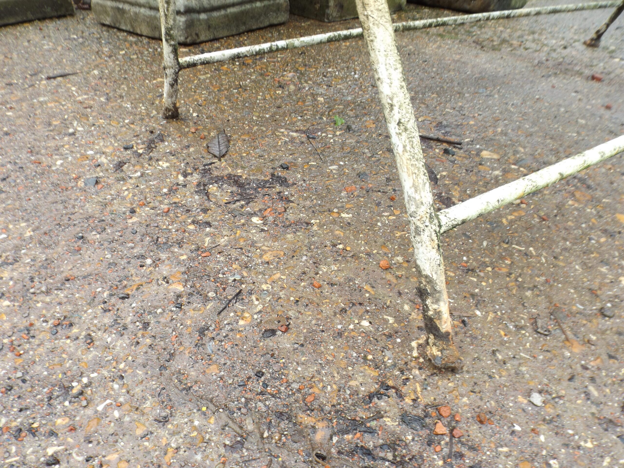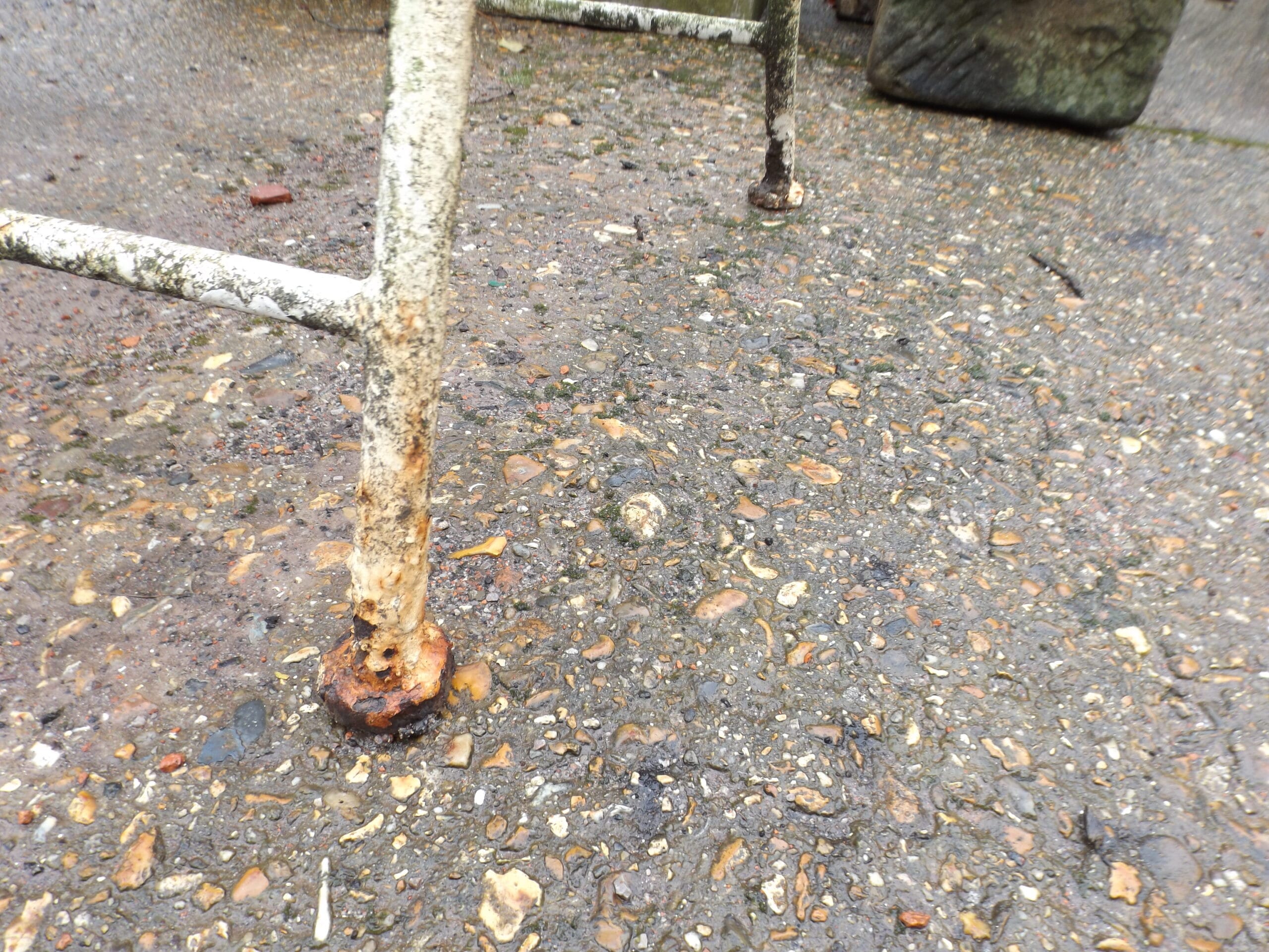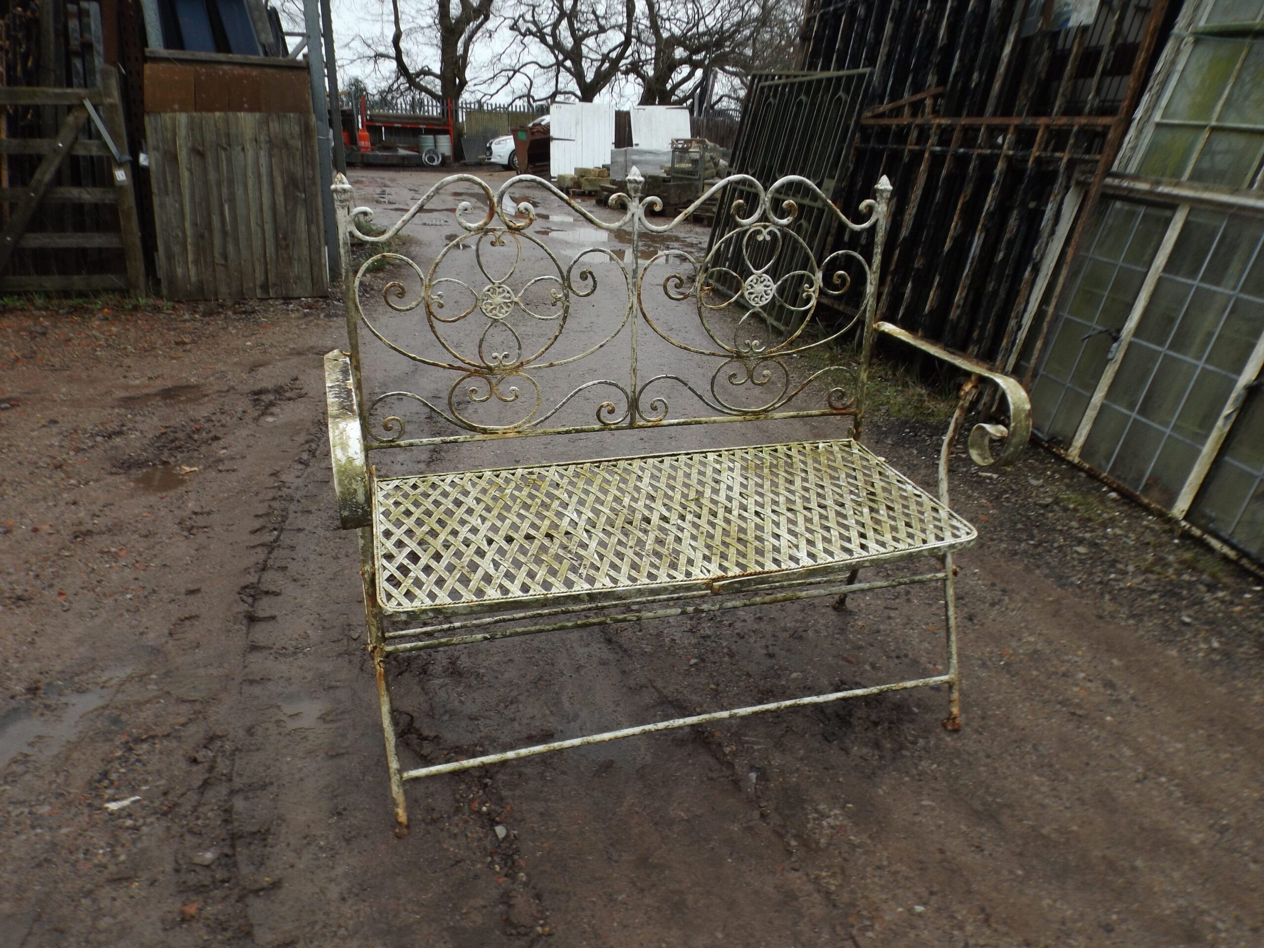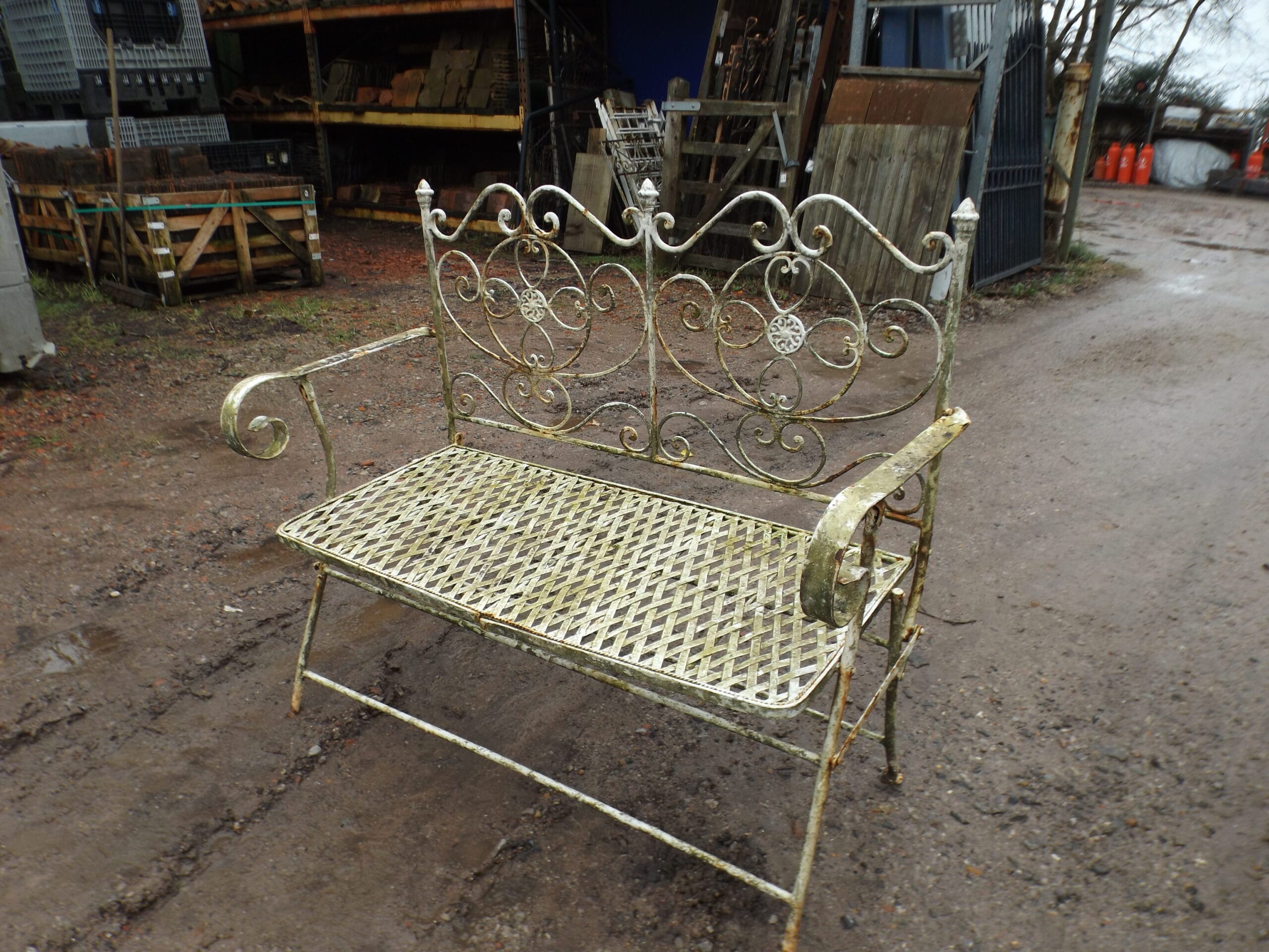A sturdy two seater vintage folding metal bench in original untouched condition. Well made, heavy and charming. Both feet missing from legs on one side.