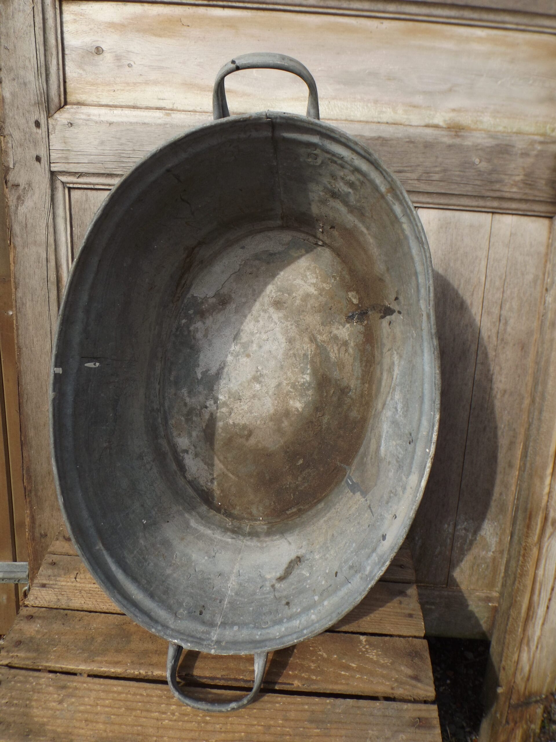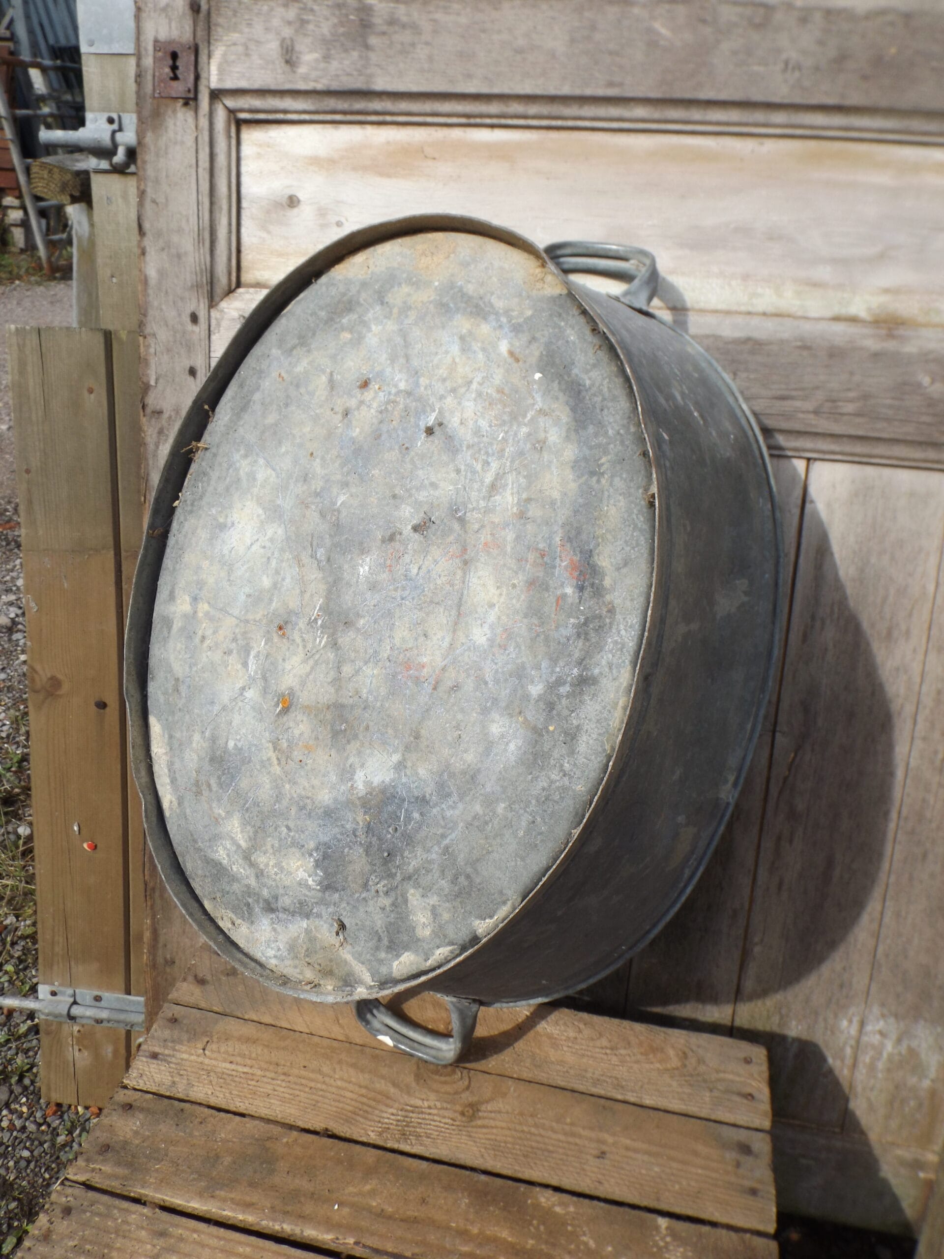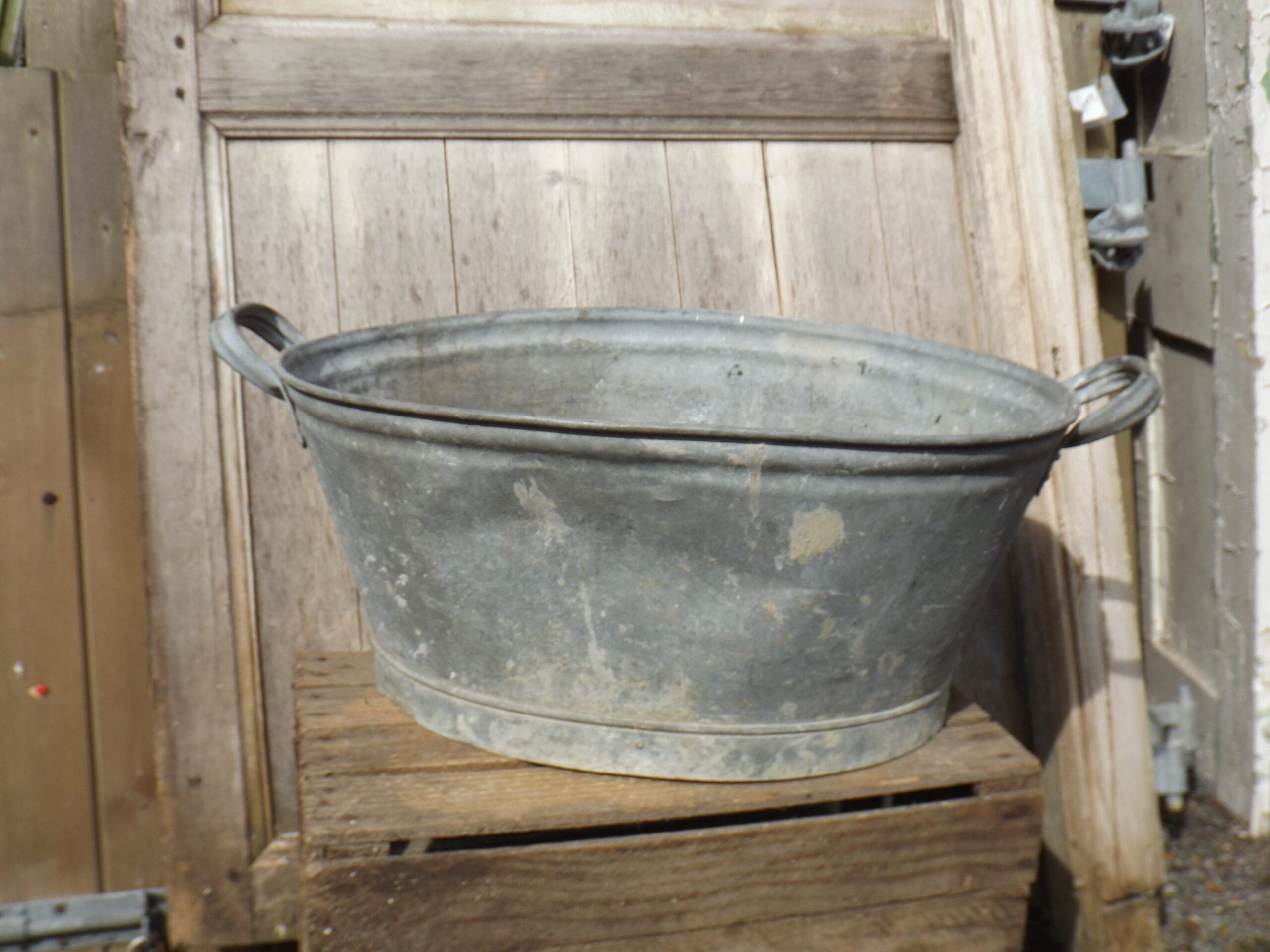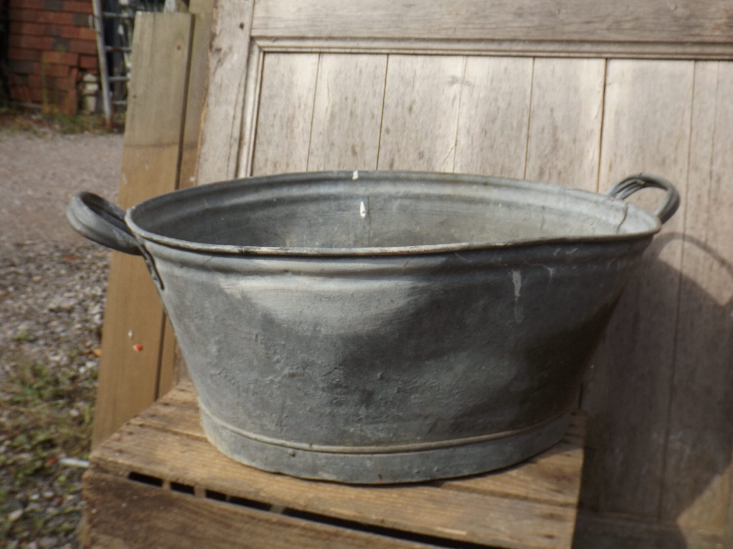 We have this small vintage galvanised bath.  Both handles solid and intact and watertight if a little mishappen.  Perfect as a planter, a small dog bath or even a small garden pond.