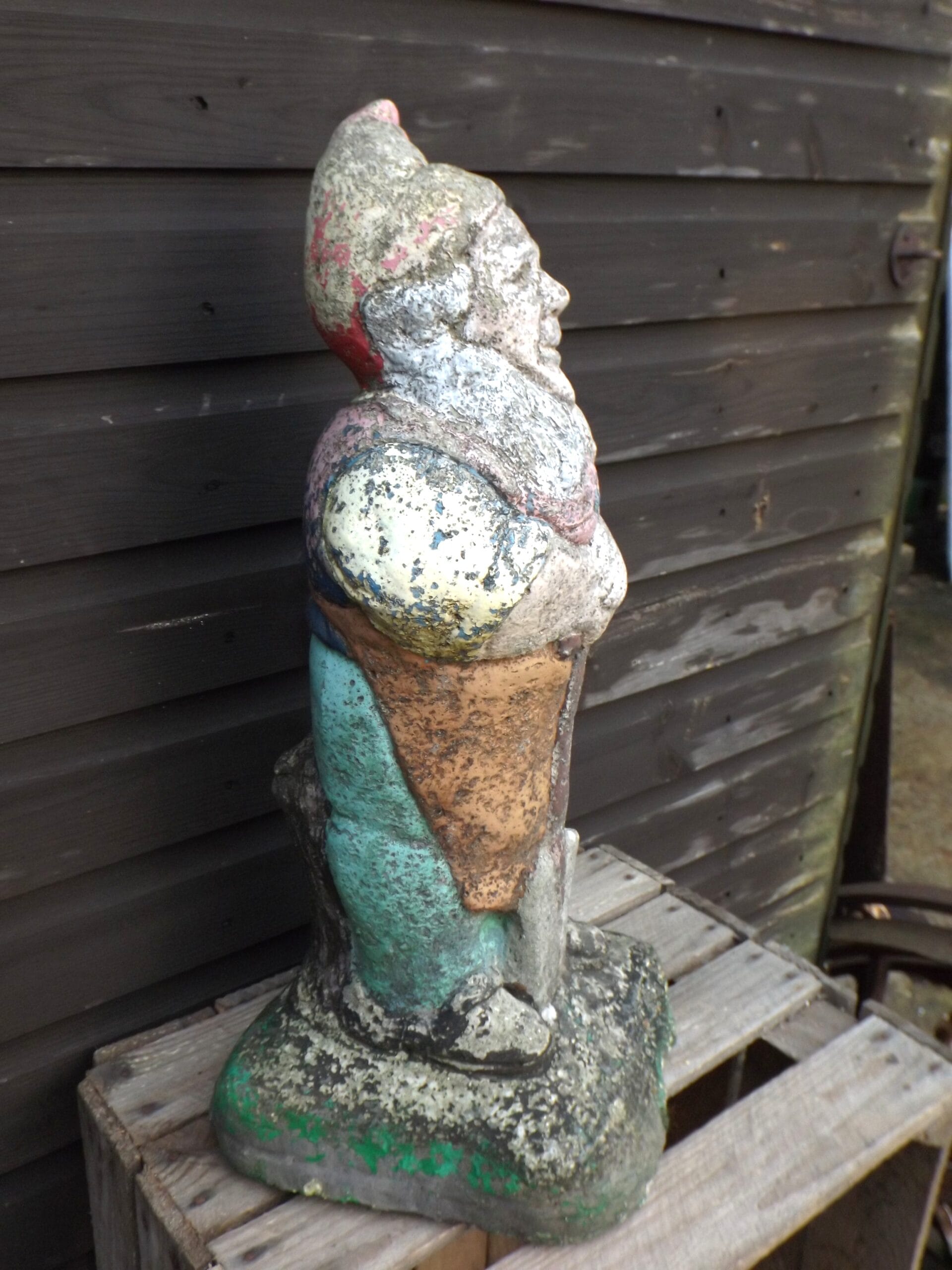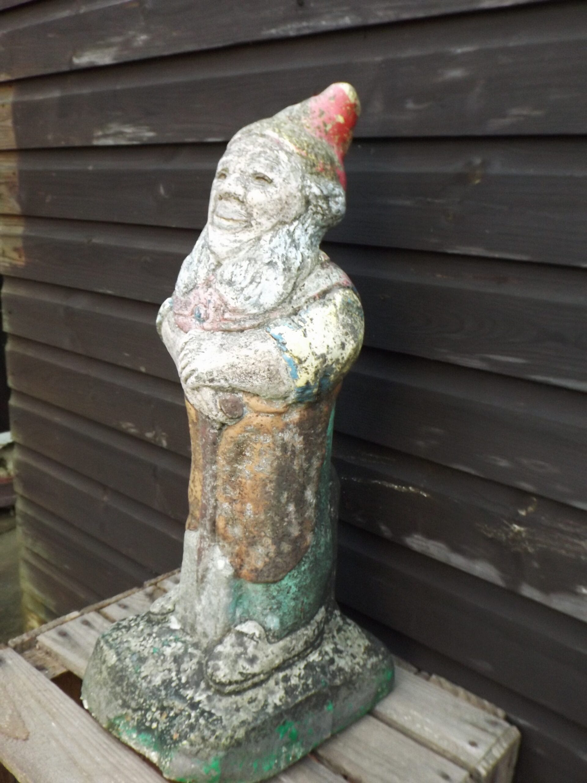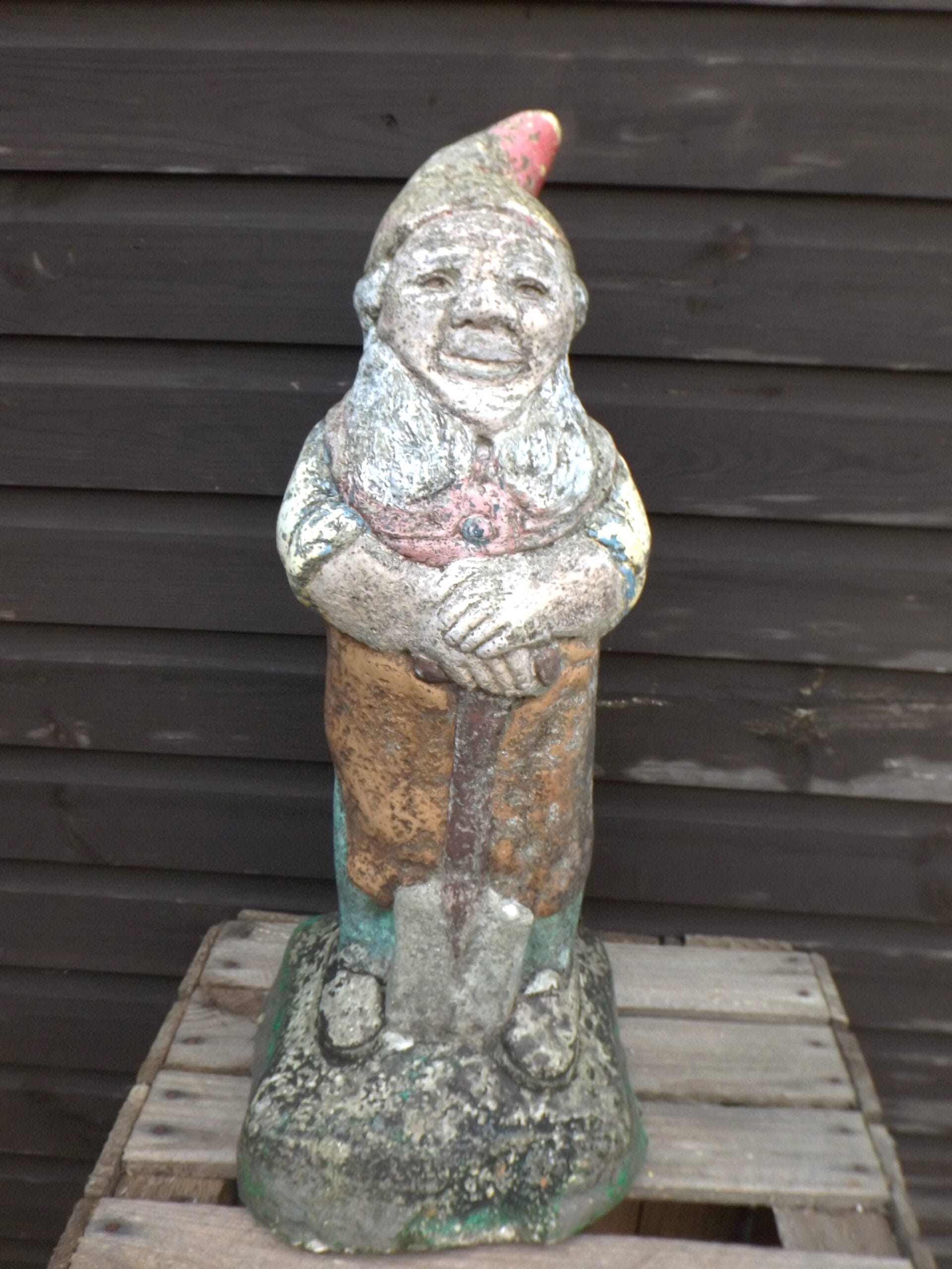 This charming vintage garden gnome with spade is in beautiful time worn condition. Mid century, crafted from durable concrete and with original faded paint. Nicely weathered, fabulous patina and in great condition.