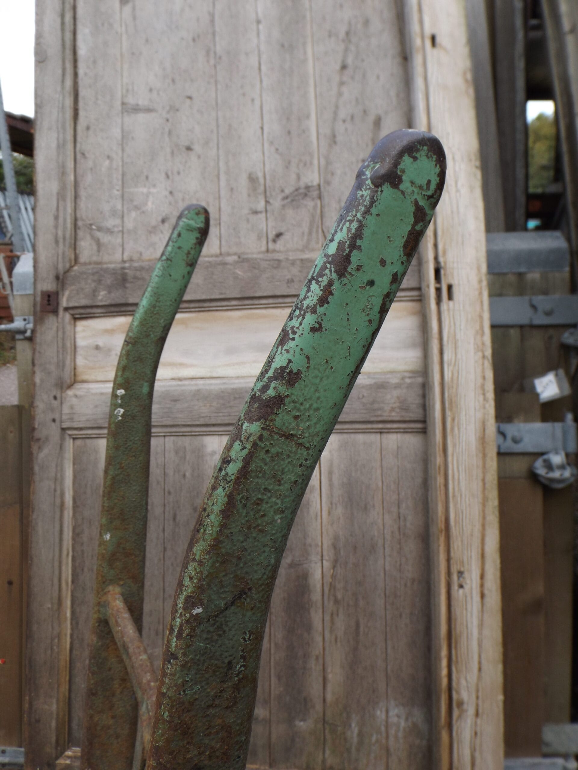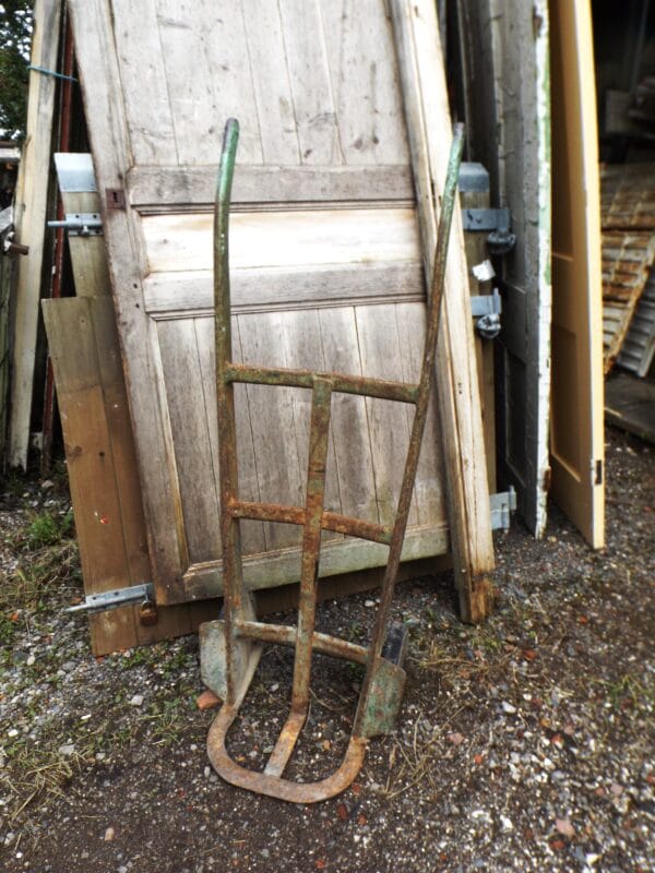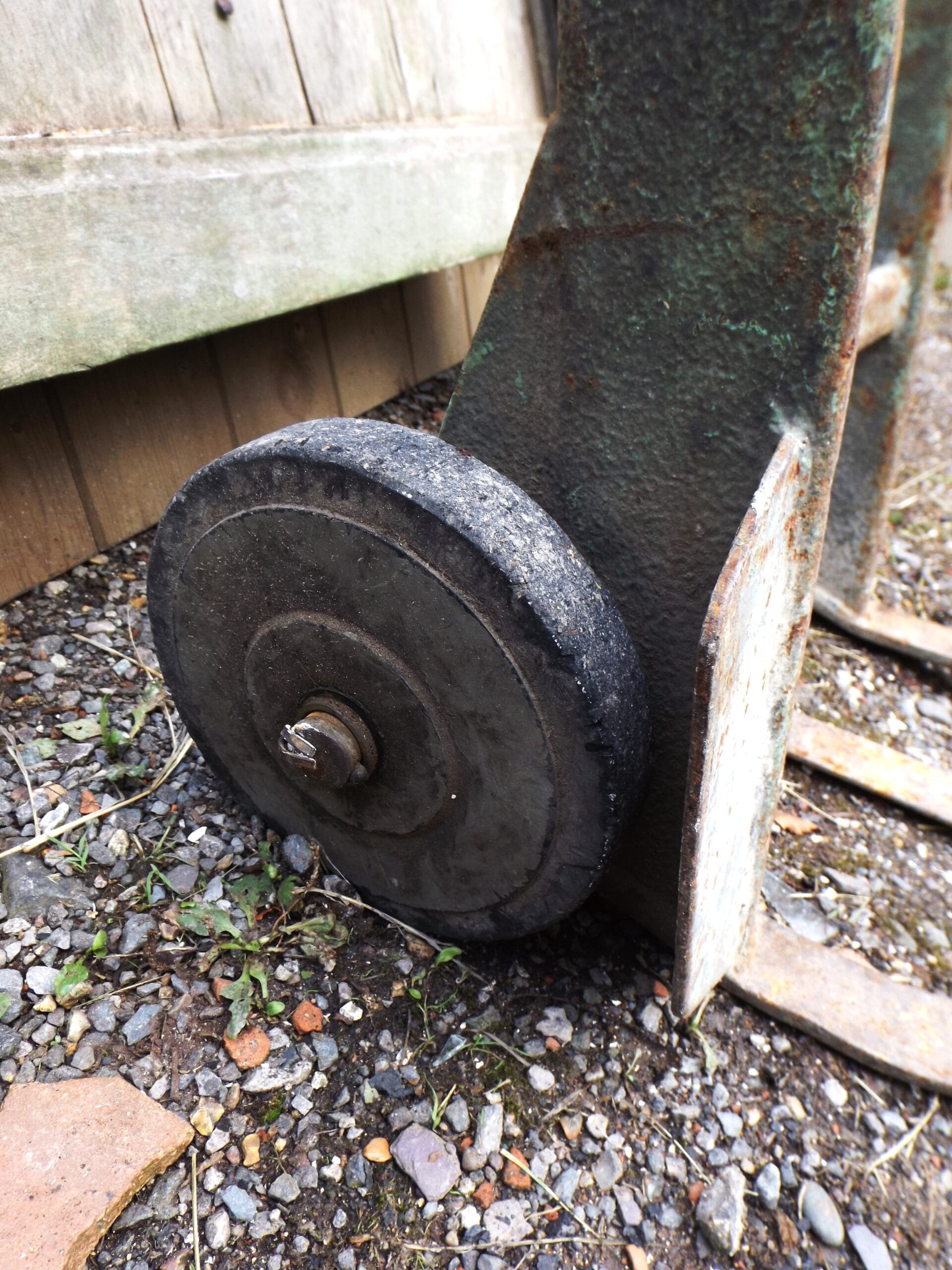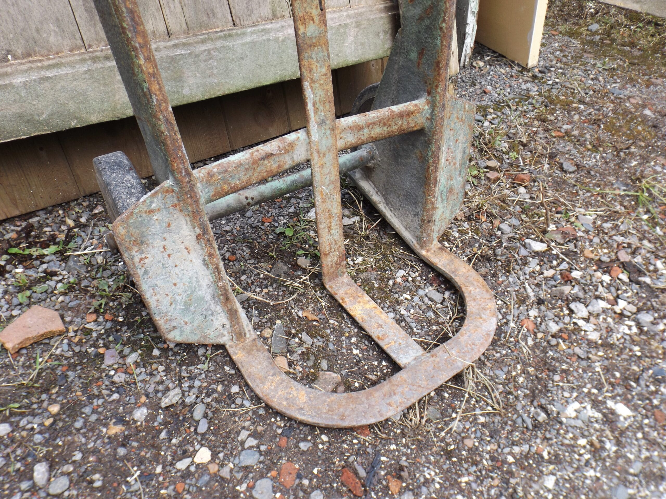 A delightful set of vintage sack wheels.  Cast iron with solid rubber wheels in original paint, wonderful patina and a lovely shape to it.