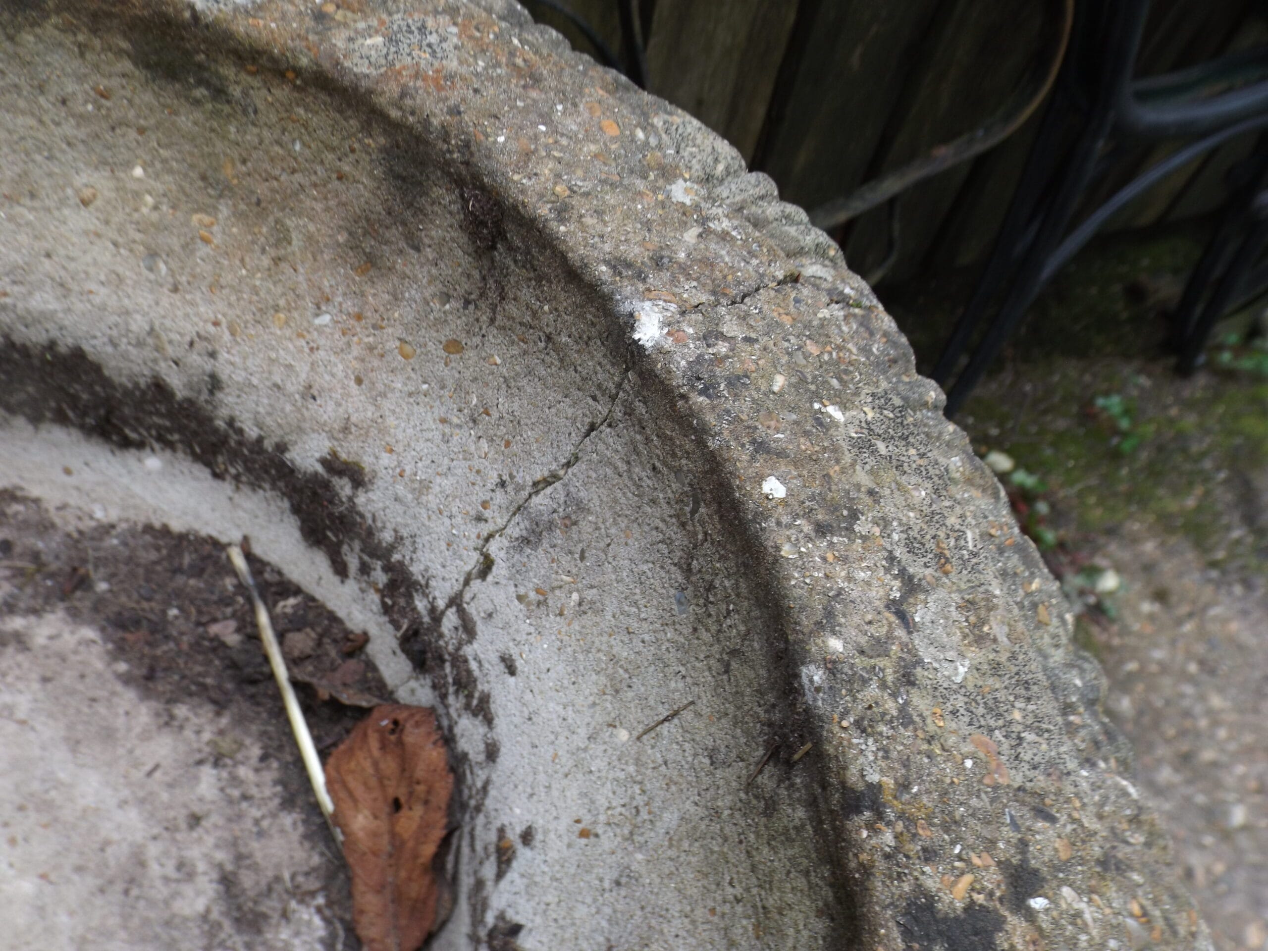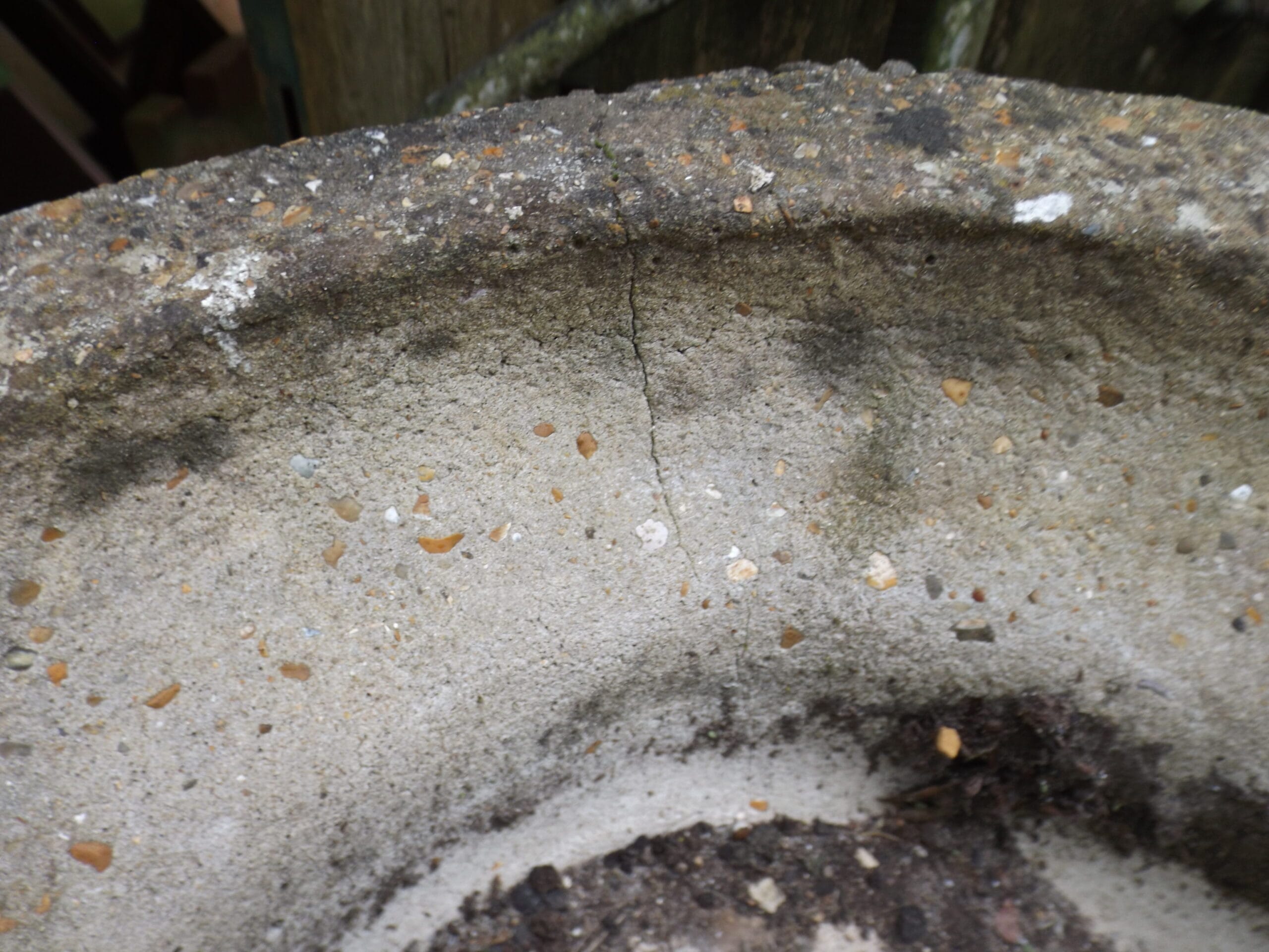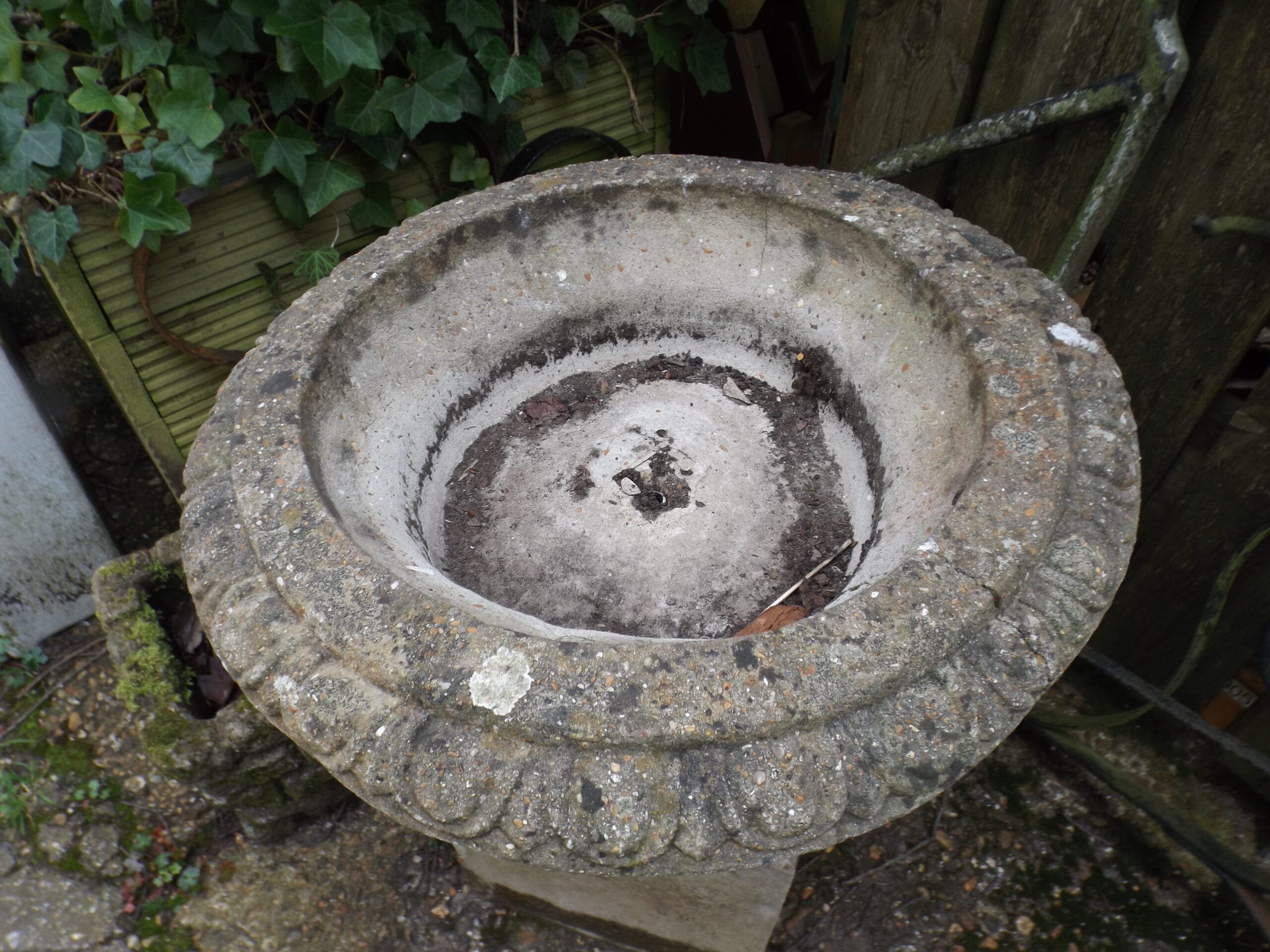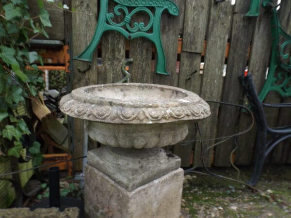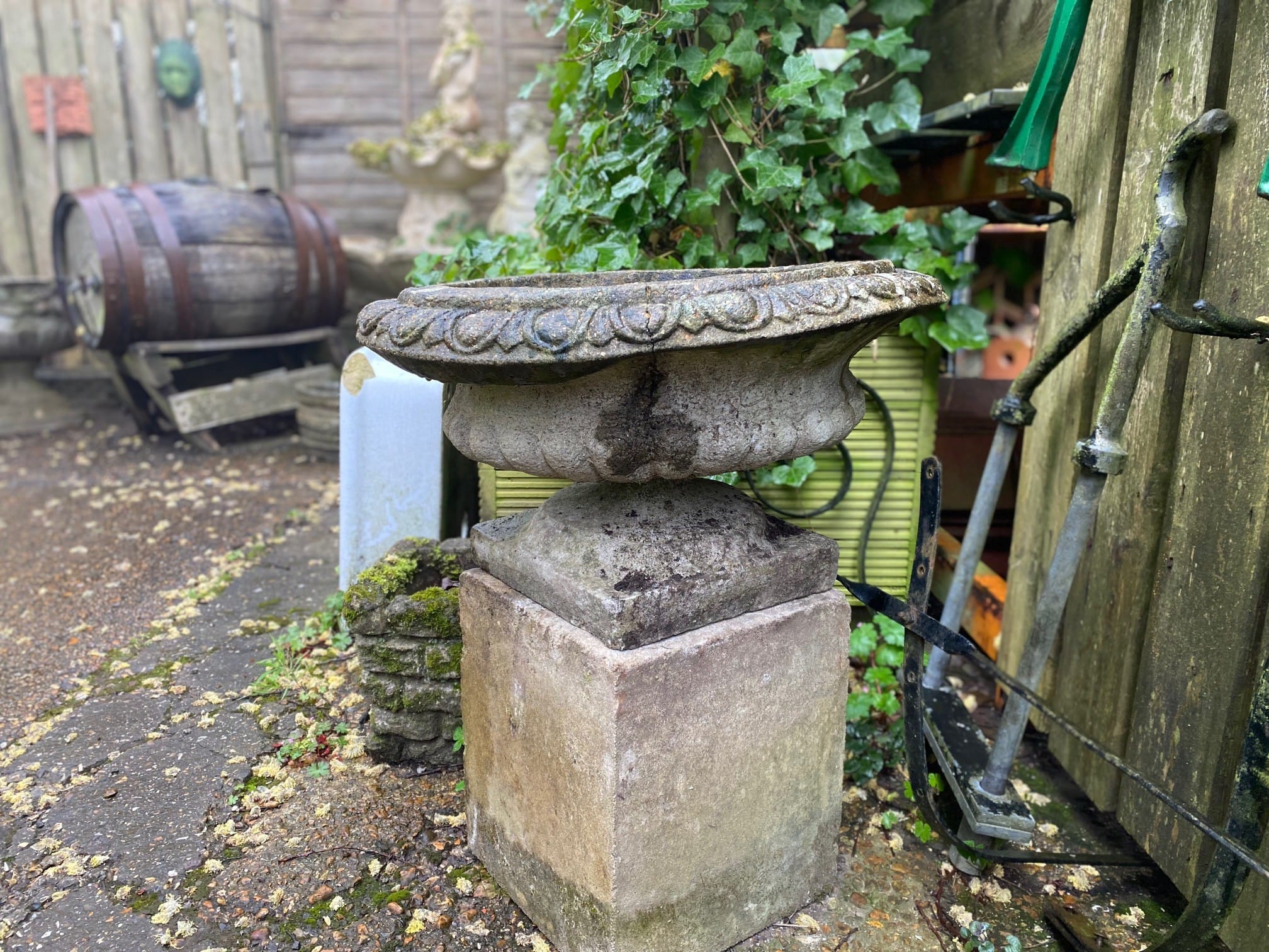 A well weathered neoclassical style urn with plenty of well established lichen, beautifully age worn.  Neoclassical style from the 20th century with a classic egg and dart pattern and a charming wonkiness to the rim.  In good solid condition although with two hairline cracks as pictured.