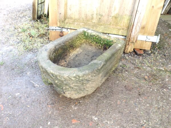 A reclaimed weathered York stone trough, hand carved with tool marks and lovely moss and lichen across the surface. Rustic, compact and weighty with a drainage hole under the front curve.
